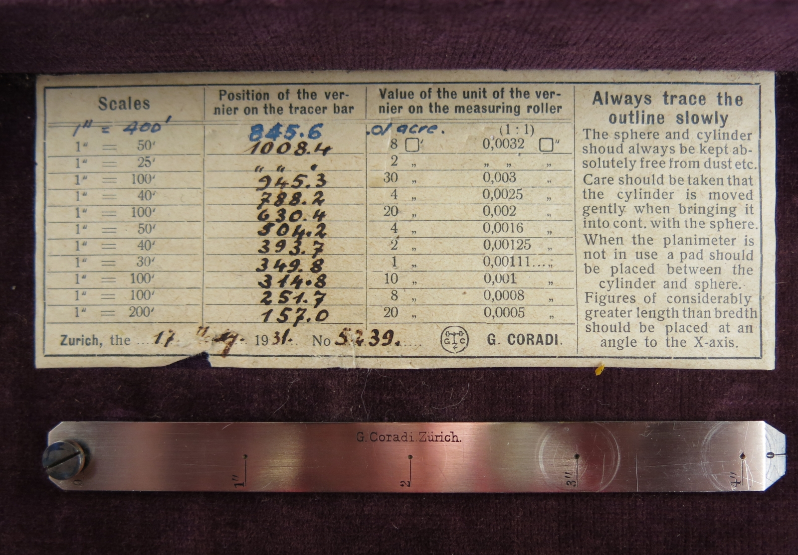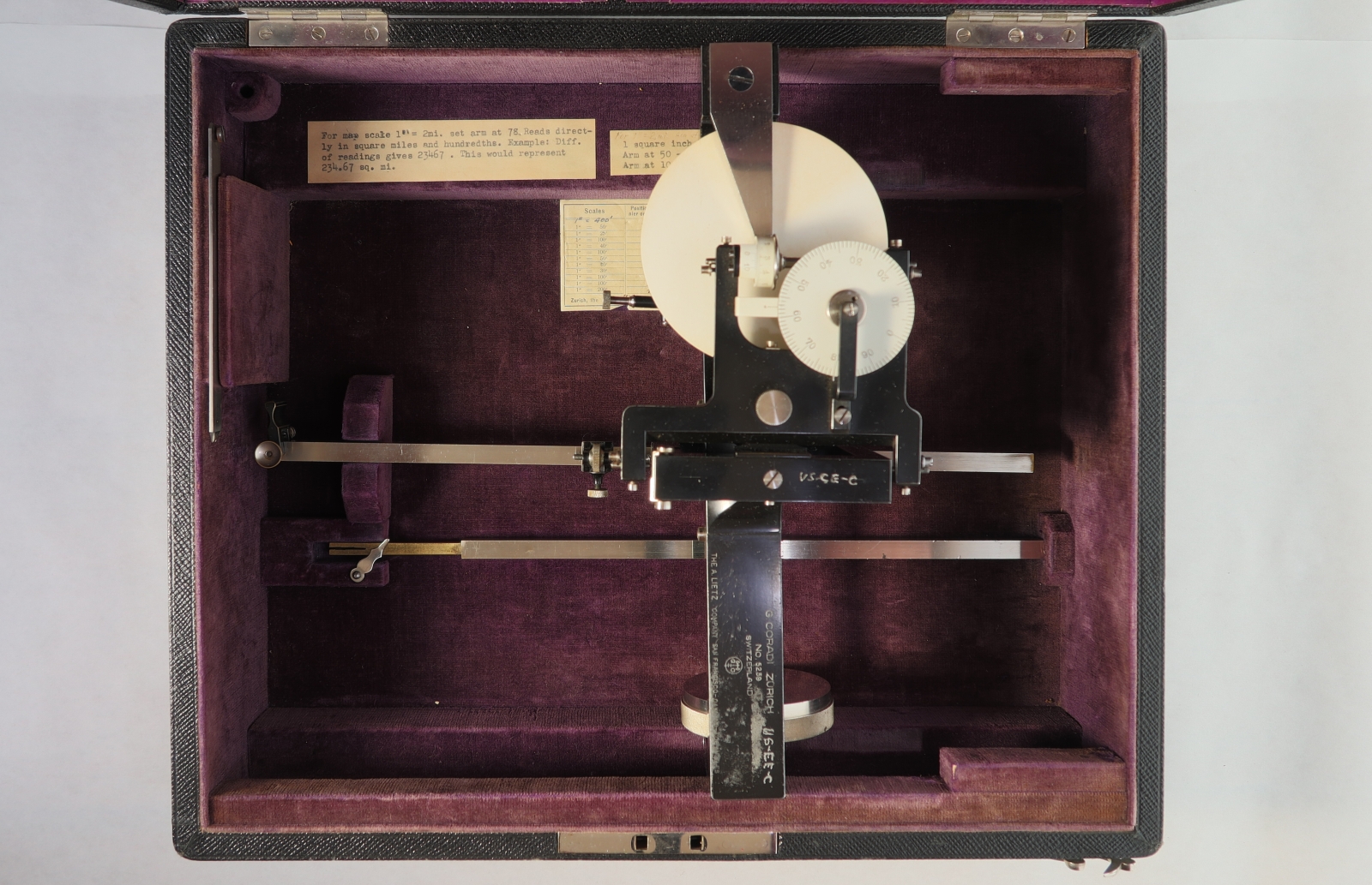 Notes: "Two features distinguish this planimeter: the wheels, which let it traverse large areas being measured, and the disc, which provides a surface with consistent friction for the measuring well. The disc is connected to the wheels, and is ""geared up"" to provide higher precision. This planimeter was sold through A. Lietz of San Francisco, and used by the US government, probably the Corp. of Engineers."
