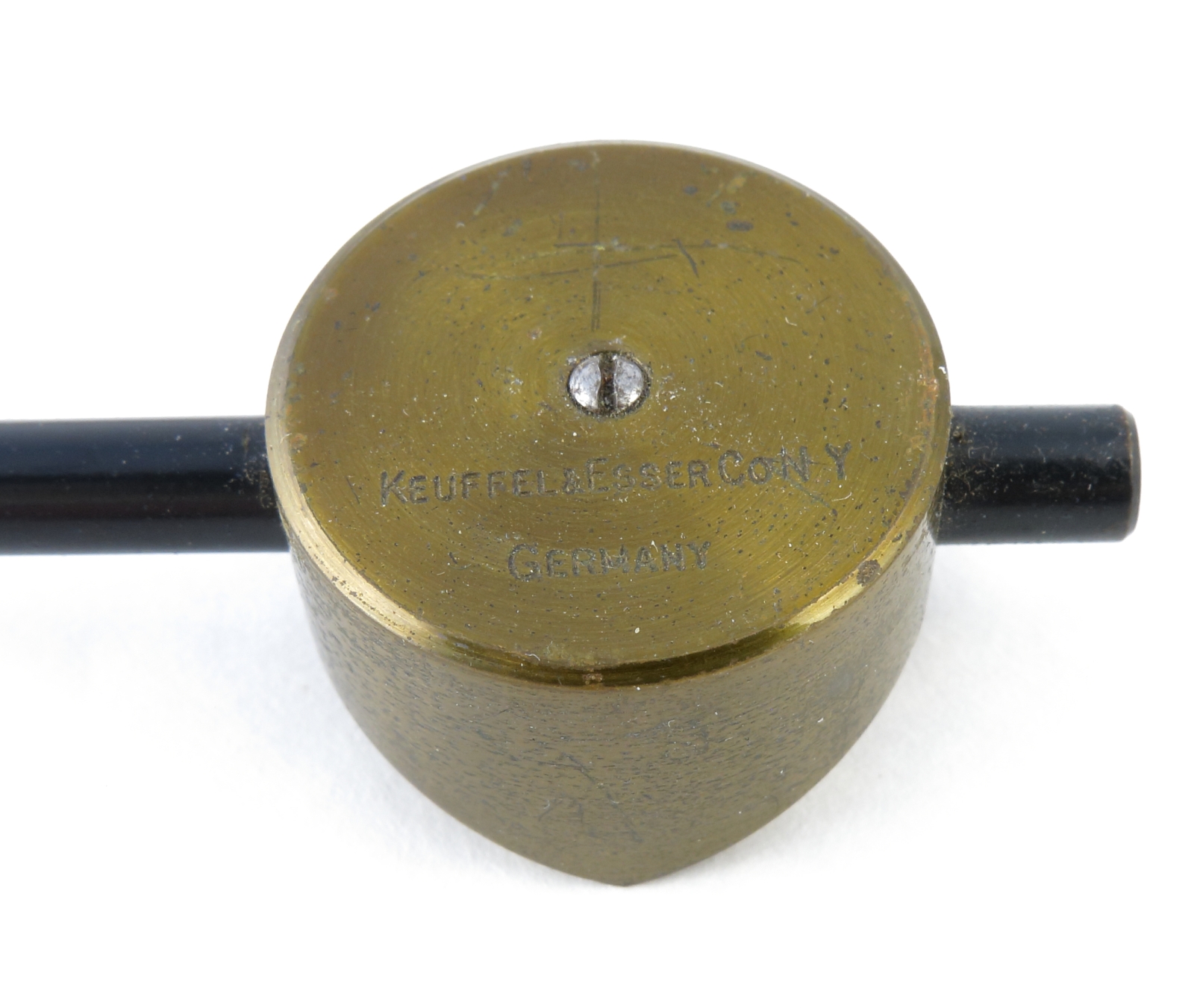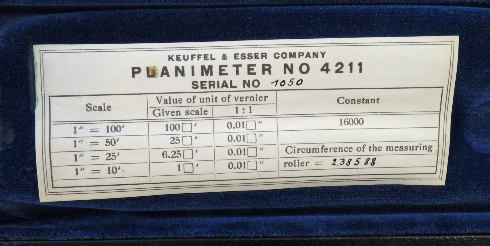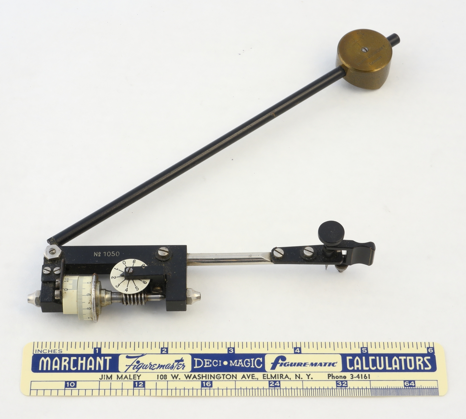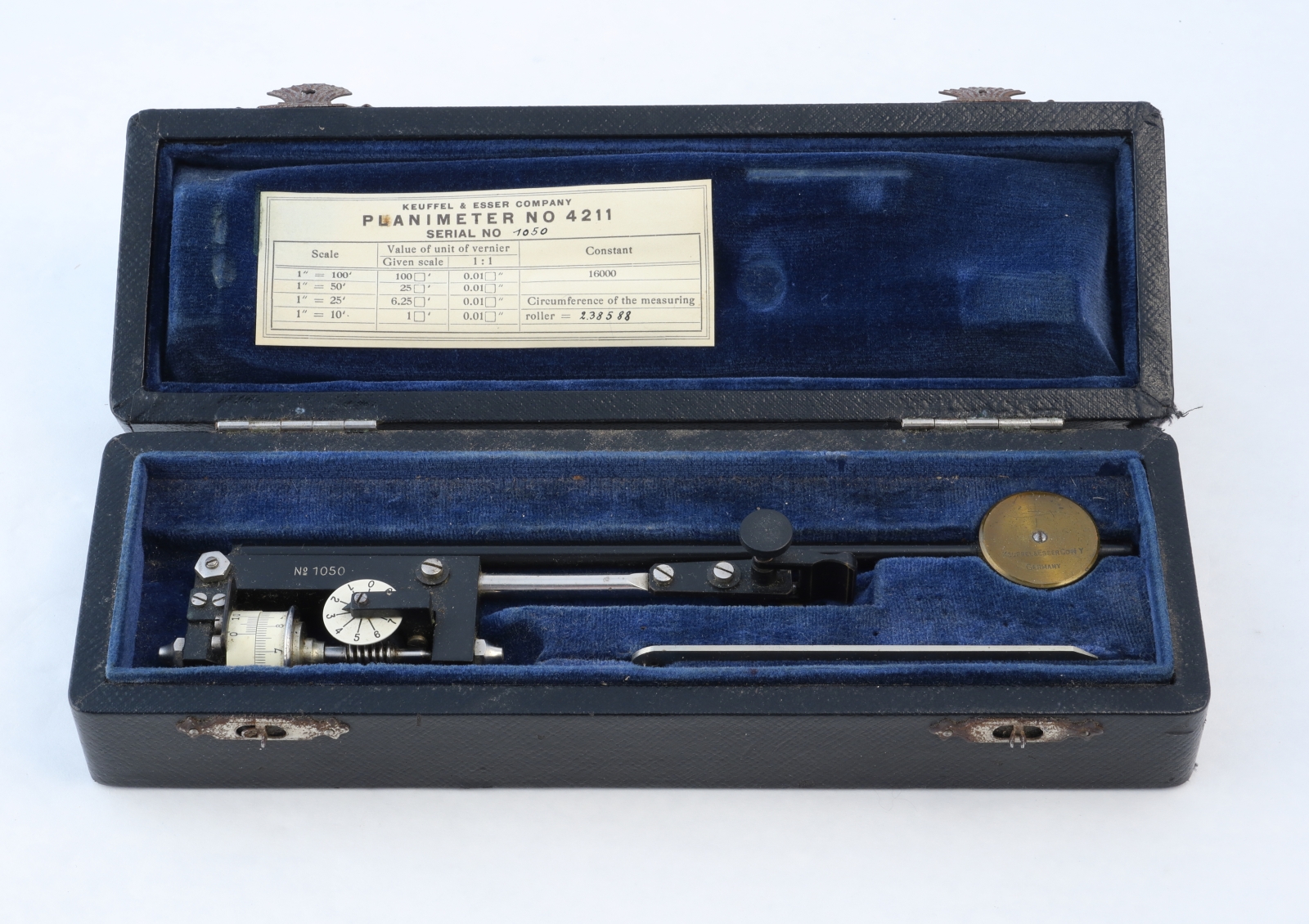 Notes: "In 1925 the K&E Model 4211 first appeared on a price list for the 1921 K&E catalog. In the 1927 catalog, the 4210 was gone and replaced by the 4211, which used a completely different style of construction and added a multiplier wheel. K&E described the 4211 as ""the polar planimeter in its simplest form,"" probably because of the fixed-length pole and tracing arms. This one is serial number 1050. "