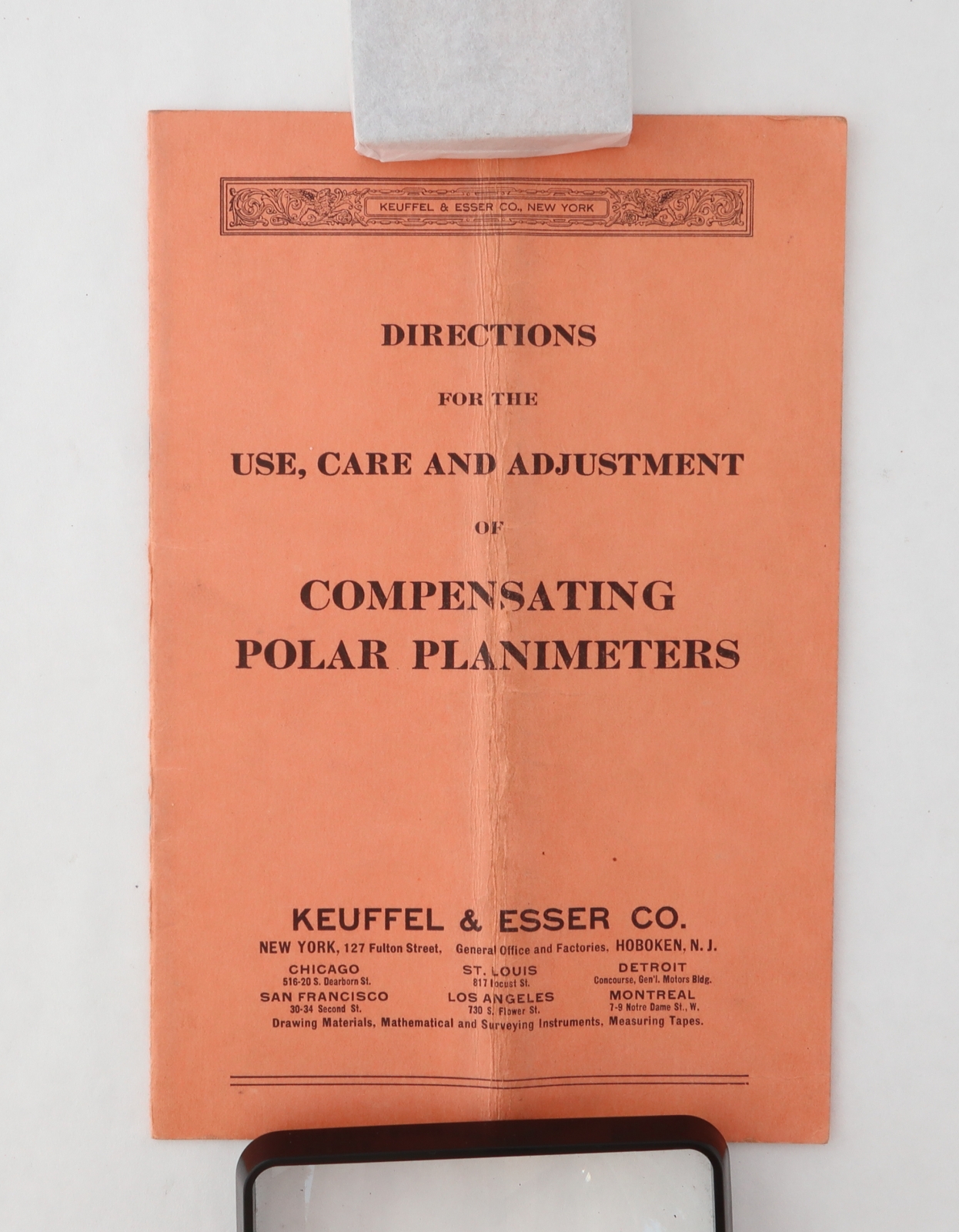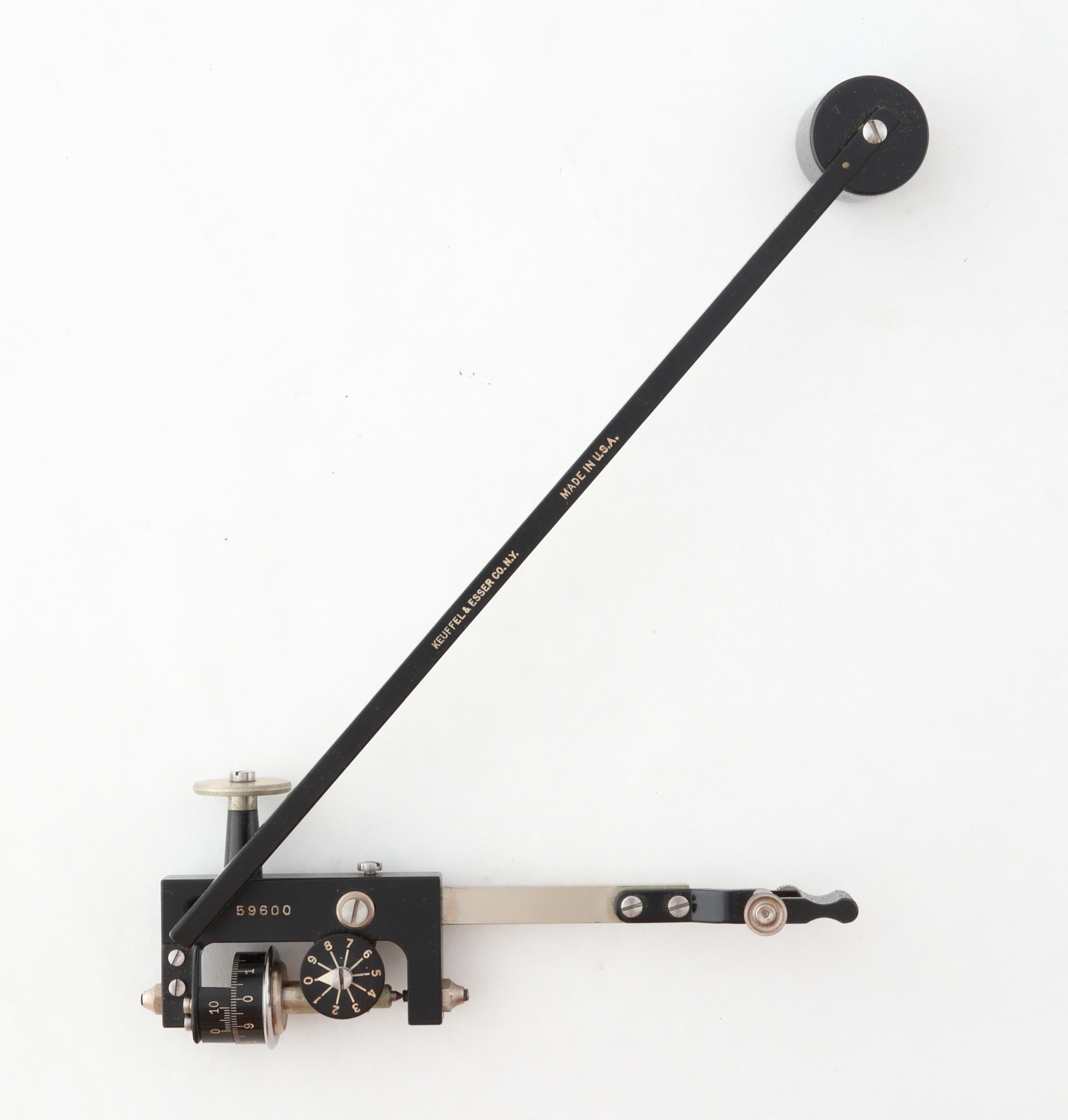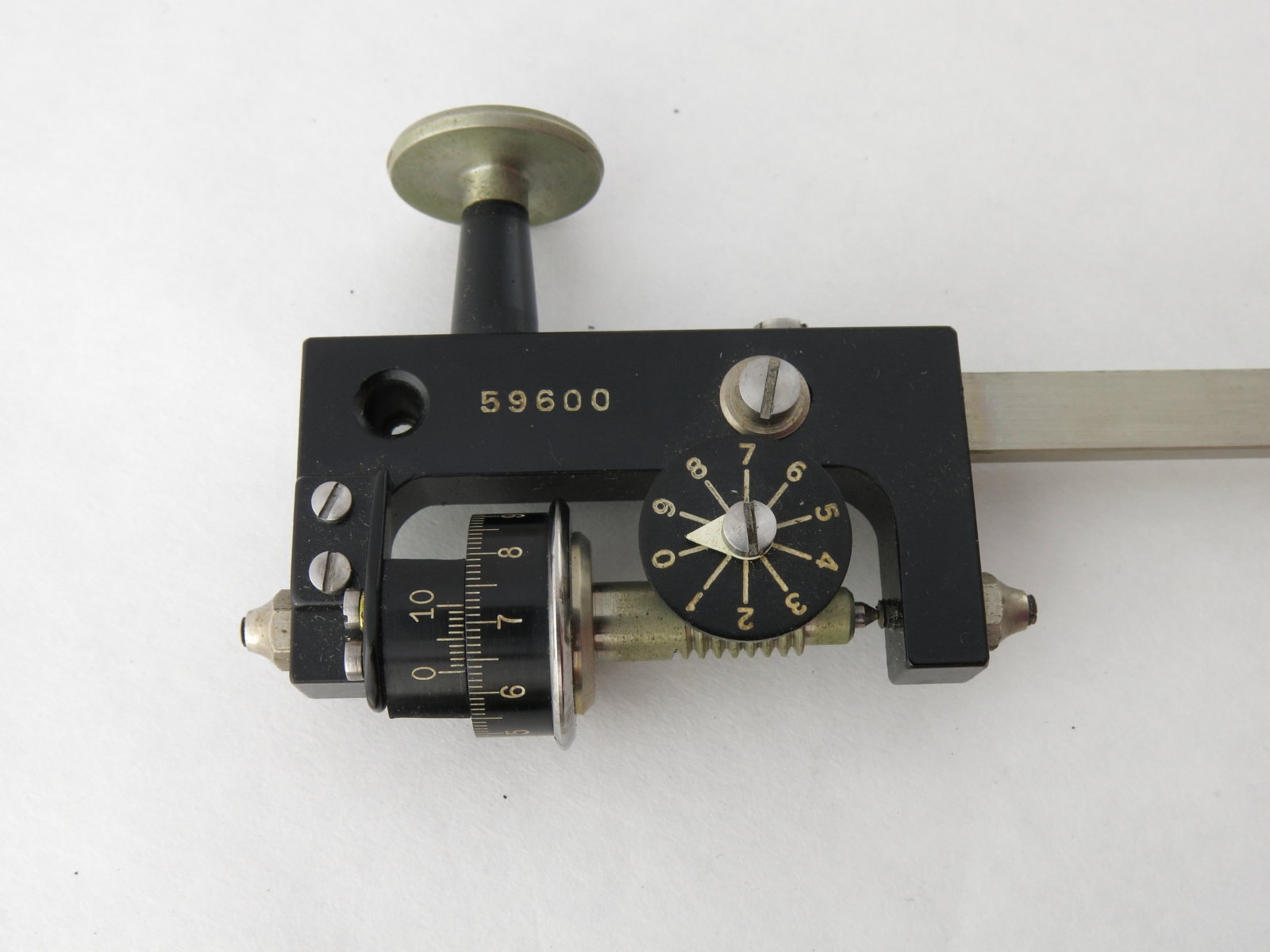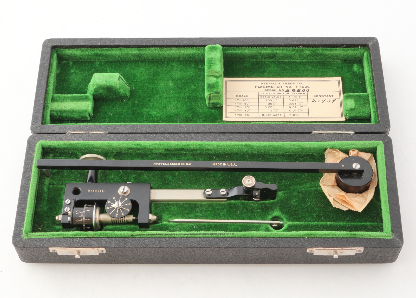 Notes: "There is no information on when this style of 4236 planimeter was made. The white-on-black markings on the tracing wheel, vernier, and multiplier disc are unusual. The best estimate for a date is mid 1950's, as the next iteration had a closed-top design, with the tracing wheel protected from dust and dirt."
