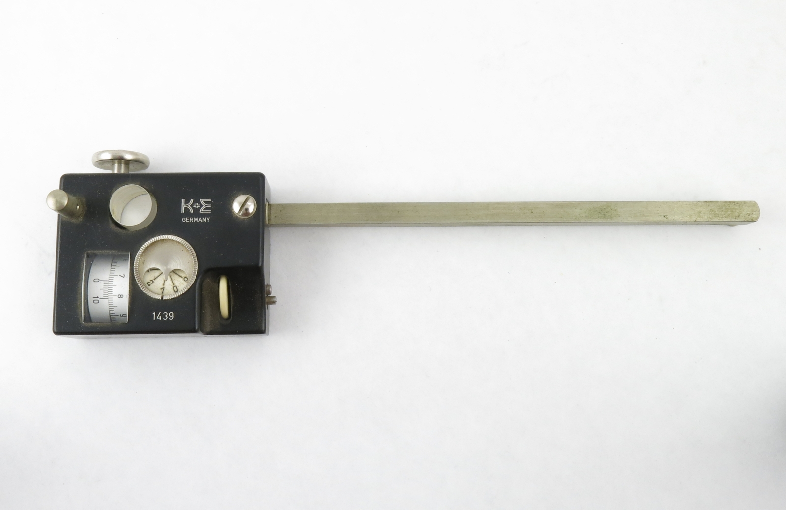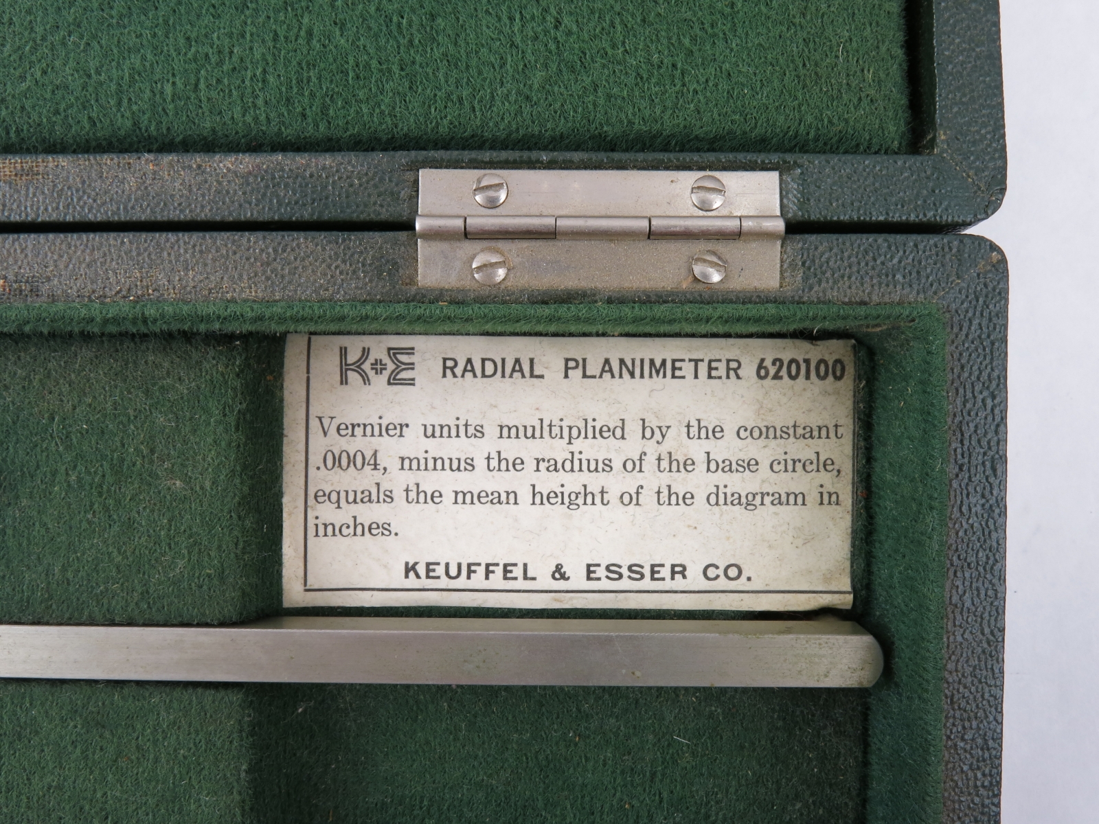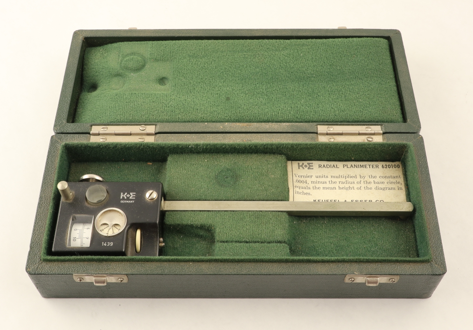 Notes: "The 62 0100 radial planimeter is the former Model 4215, with the ""modern"" covered mechanism and plastic wheel for zeroing the planimeter. The tracing ""point"" is a magnifying glass built into the cursor frame, with a red bullseye for tracing the chart."