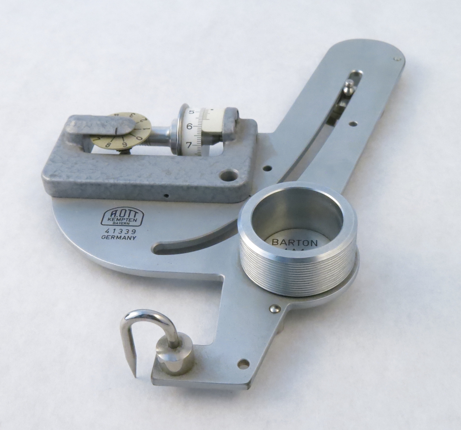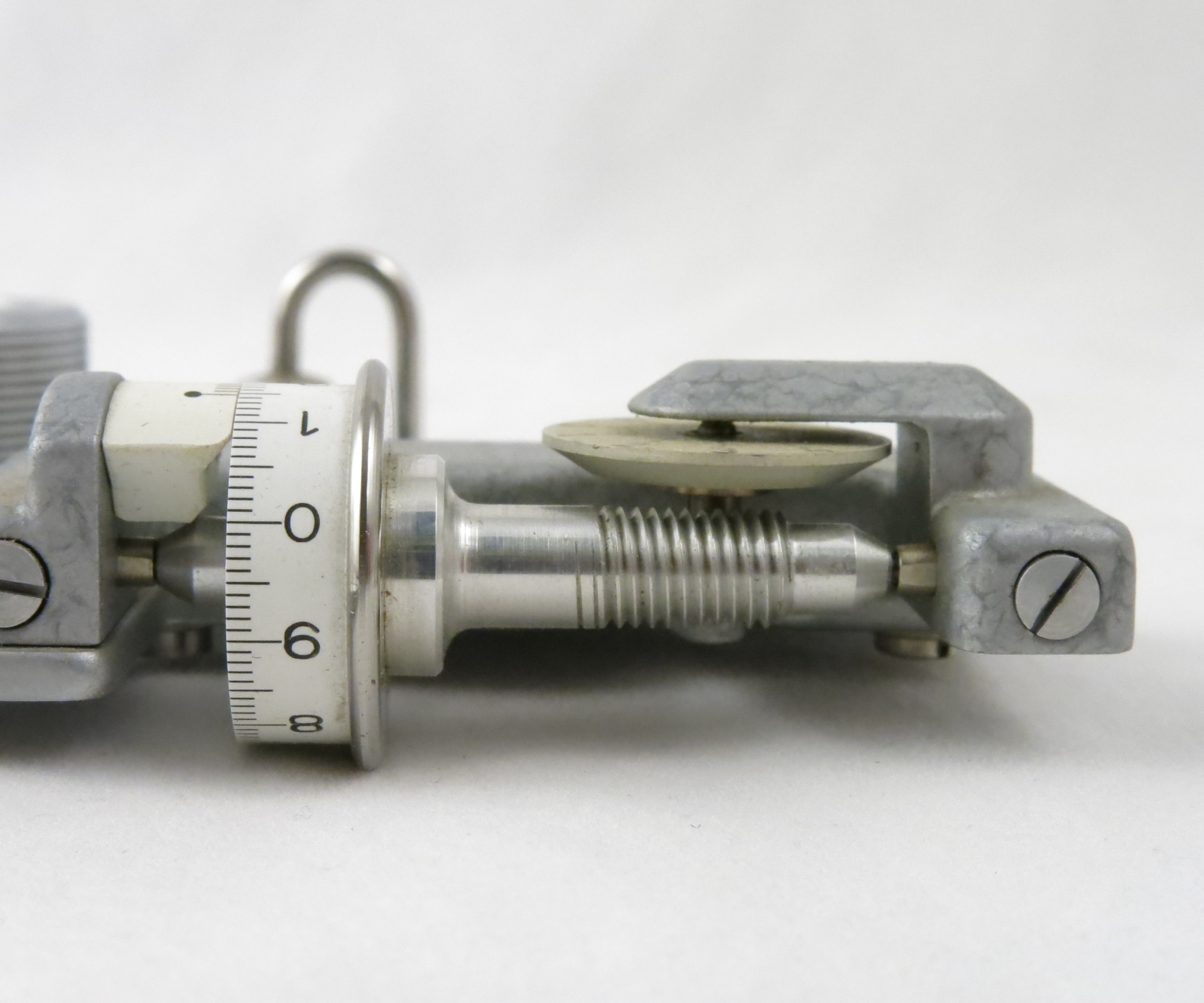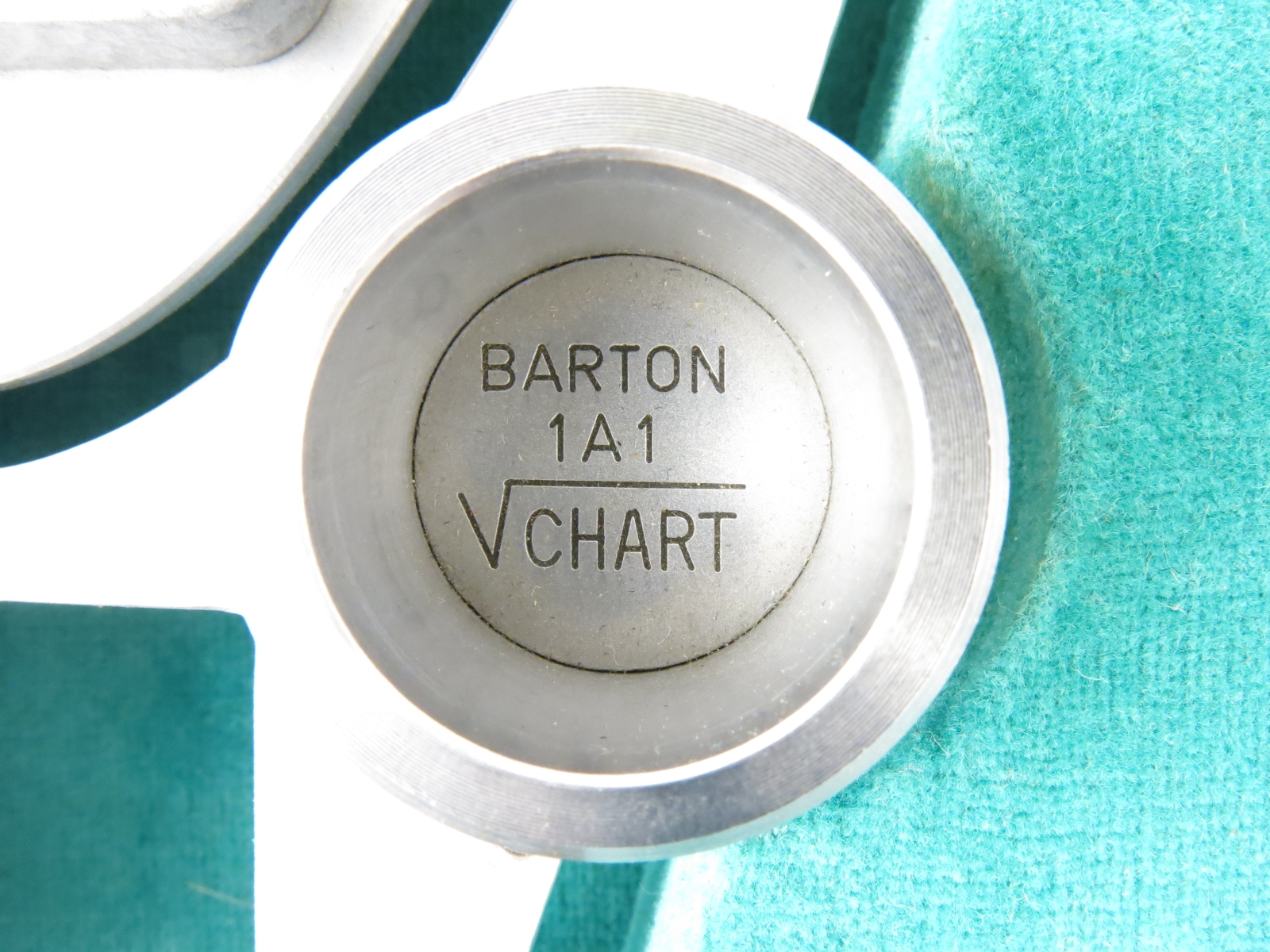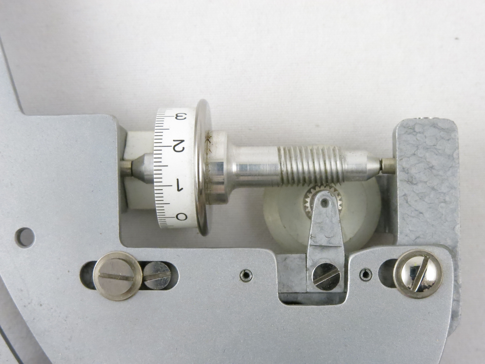 Notes: "A square root planimeter measures circular charts that show pressure (from a pitot tube) that is in a fluid flow. Knowing the size of the pipe the flow rate can be derived from this. It is used much as a radial planimeter, with a peg stuck in the middle of the chart, and the tracing point moved around, following the data trace. The curved slot that rides on the pin provides the square root function. This planimeter is specifically for Barton 1A1 type charts."