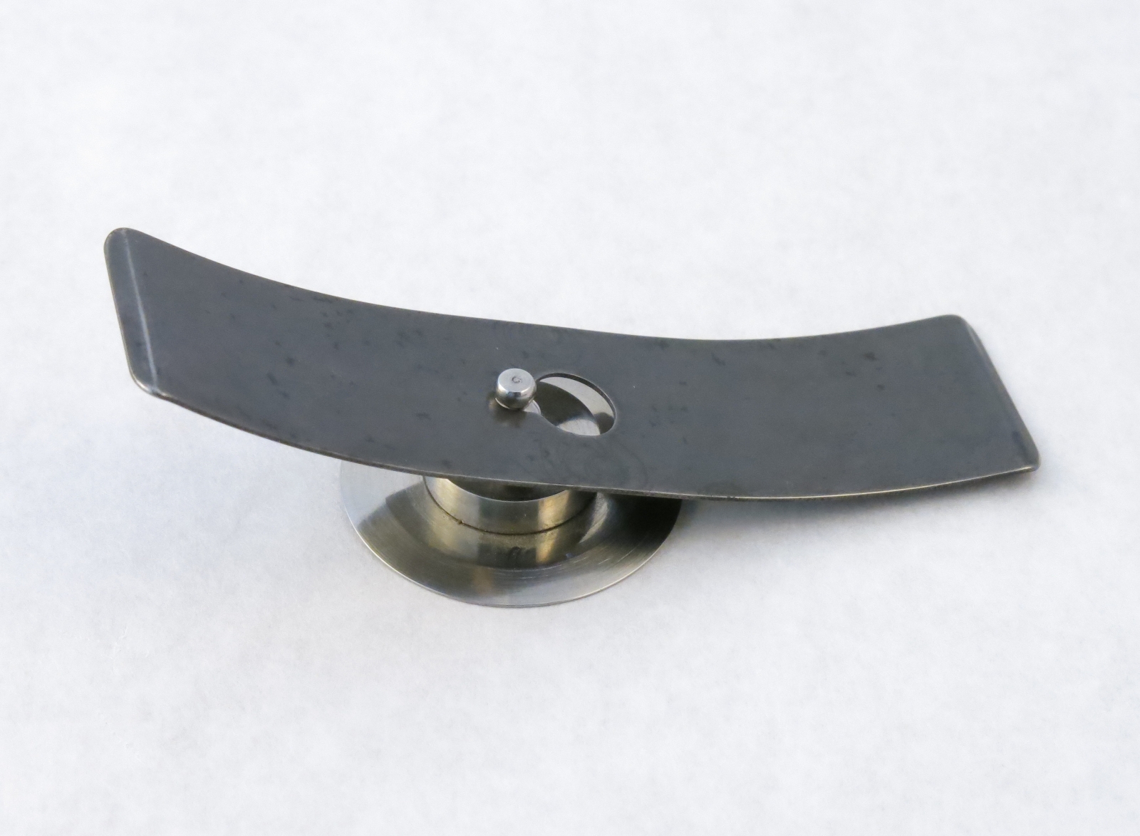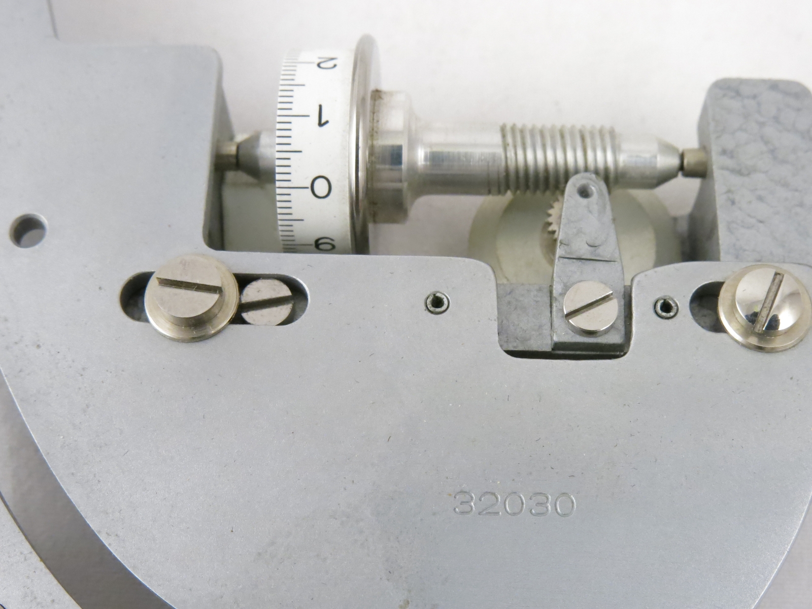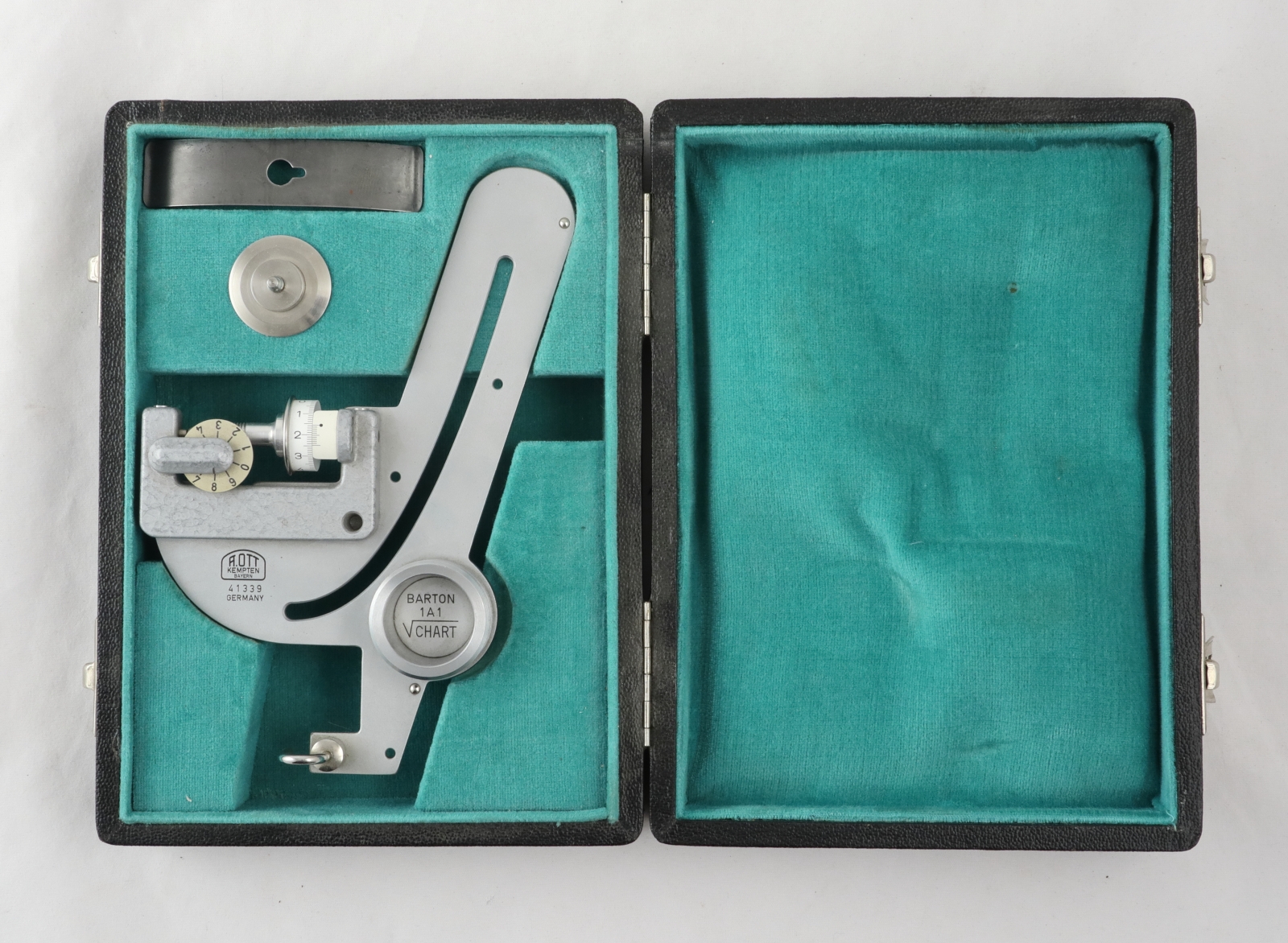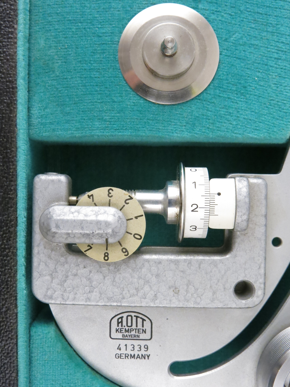 Notes: "A square root planimeter measures circular charts that show pressure (from a pitot tube) that is in a fluid flow. Knowing the size of the pipe the flow rate can be derived from this. It is used much as a radial planimeter, with a peg stuck in the middle of the chart, and the tracing point moved around, following the data trace. The curved slot that rides on the pin provides the square root function. This planimeter is specifically for Barton 1A1 type charts."
