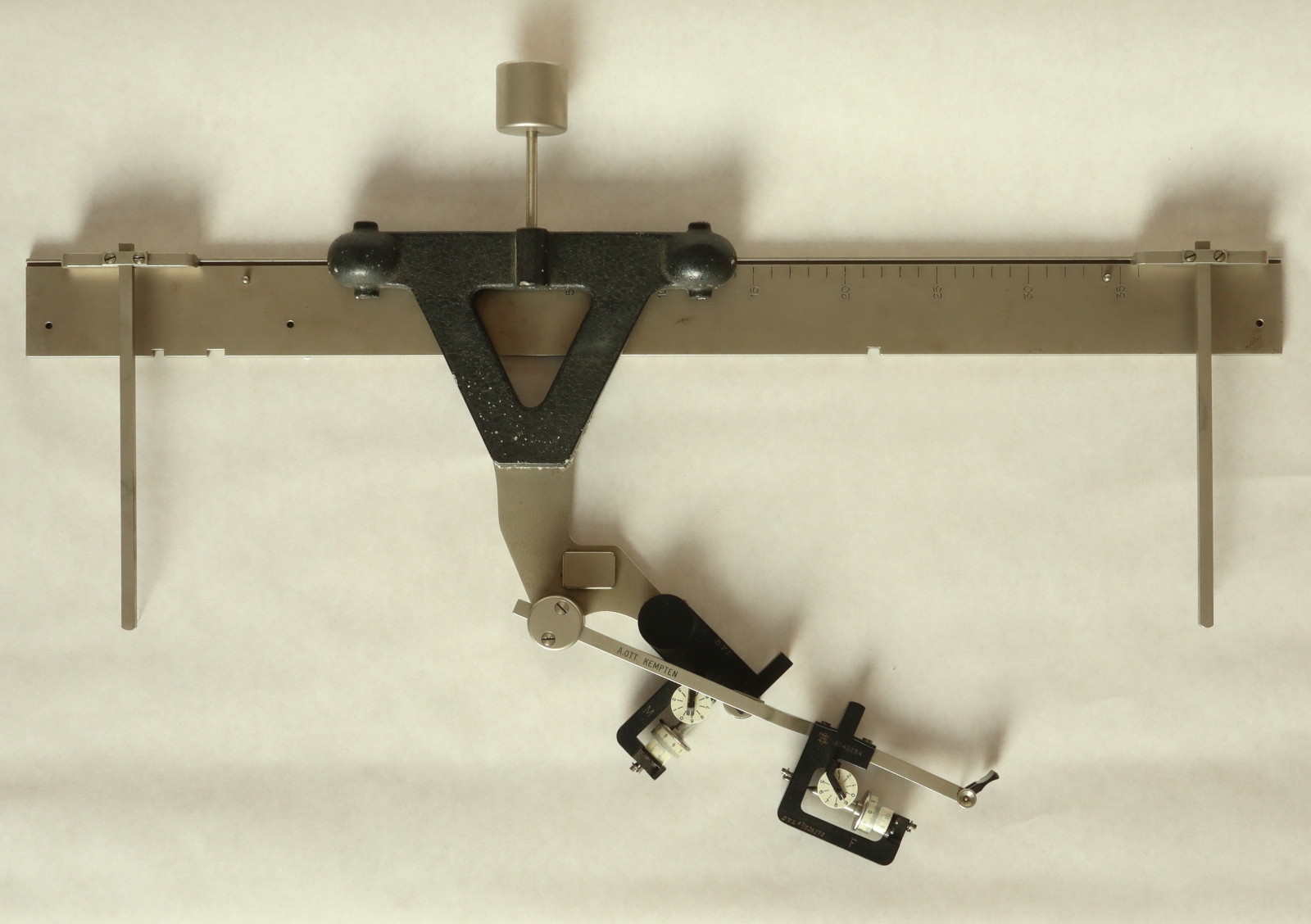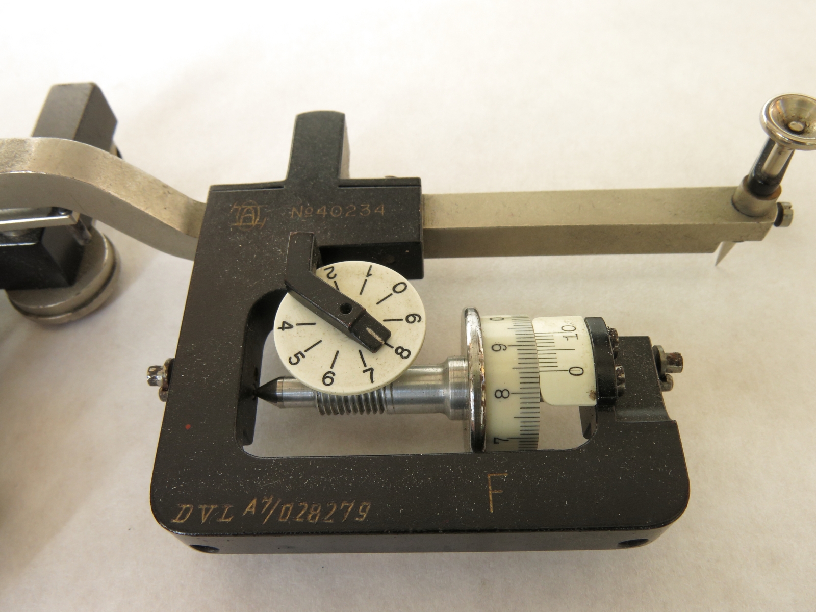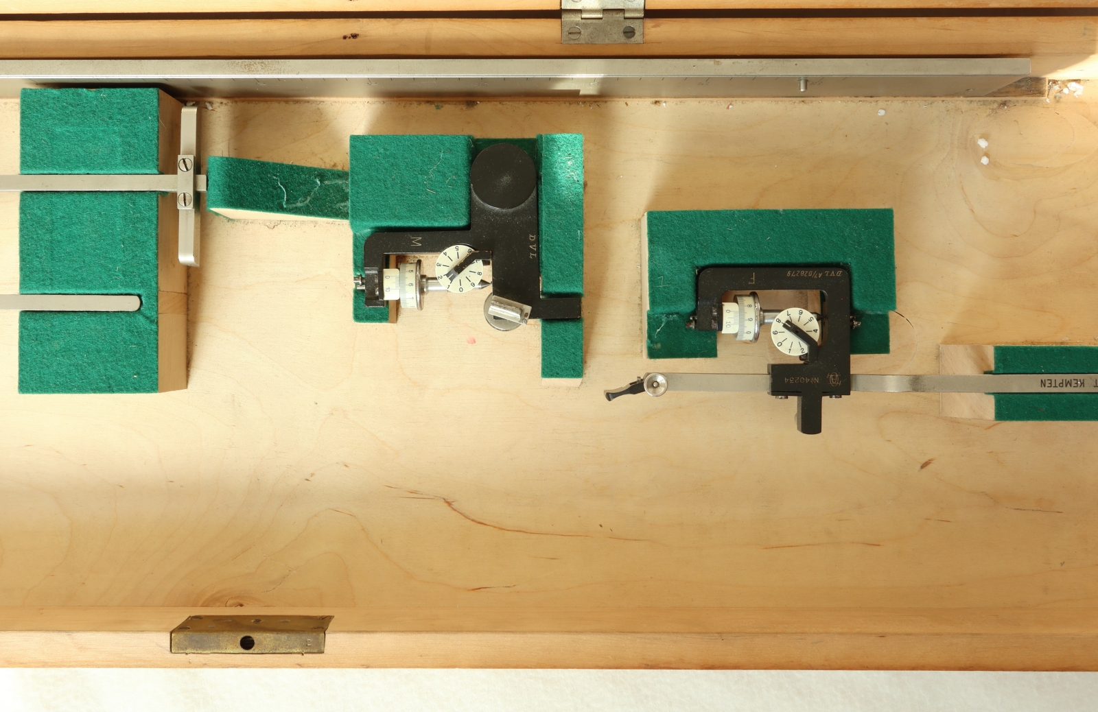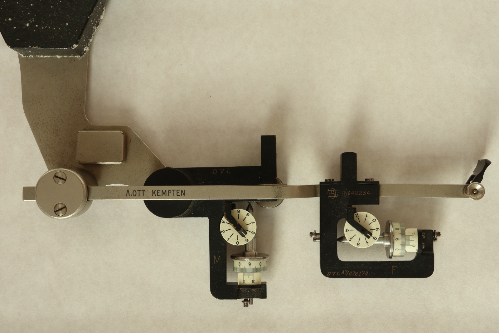 Notes: "This is a 2-wheel integrator, measuring area and moment but not moment of inertia. Unusually, the rail is included and there is space in the box for it. The box appears to accommodate rails of two lengths, and this is the short one. Ott's serial number, 40234, is engraved on one of the recording mechanisms, and the original owner, ""DVL"", has engraved their inventory number, A7/028279, on the same recording mechanism. DVL has also marked that number on a plaque attached to the box above the keyhole. "