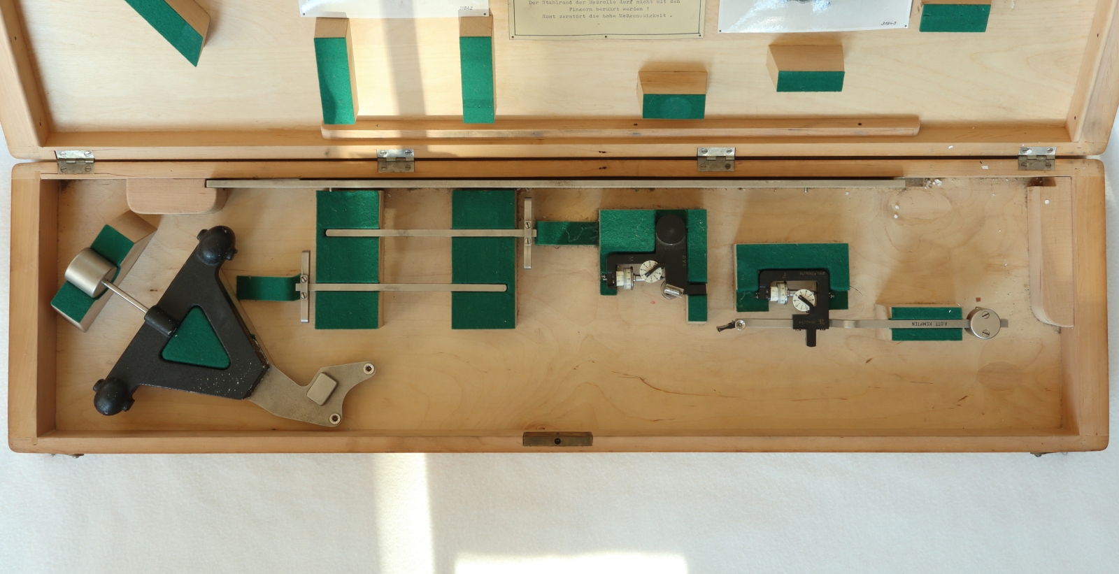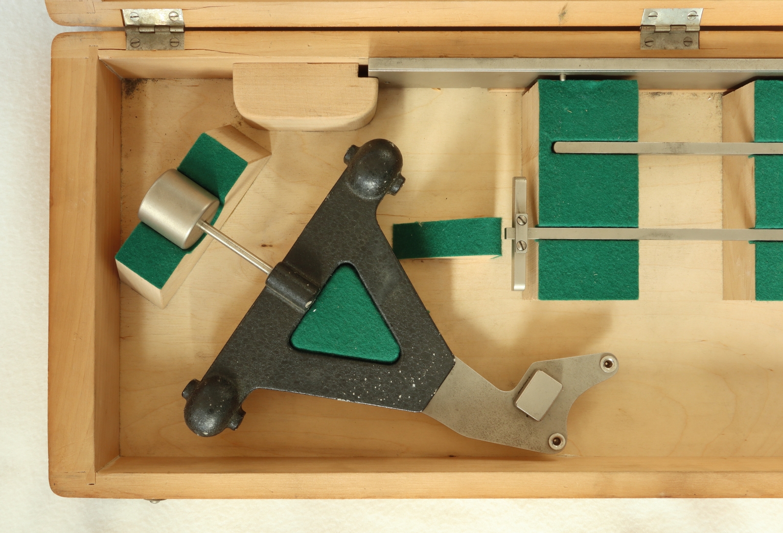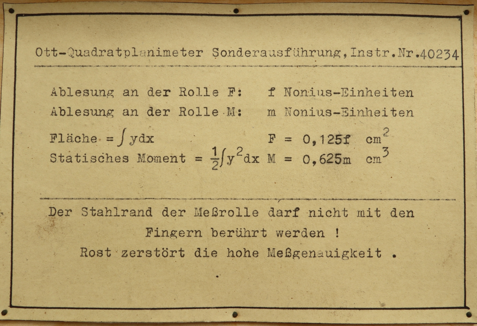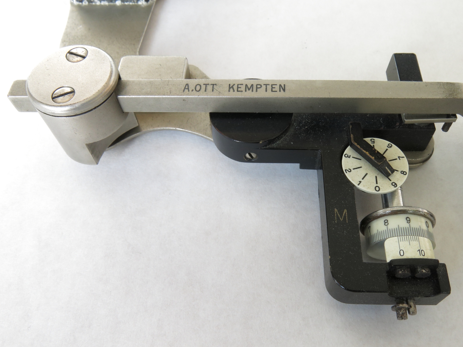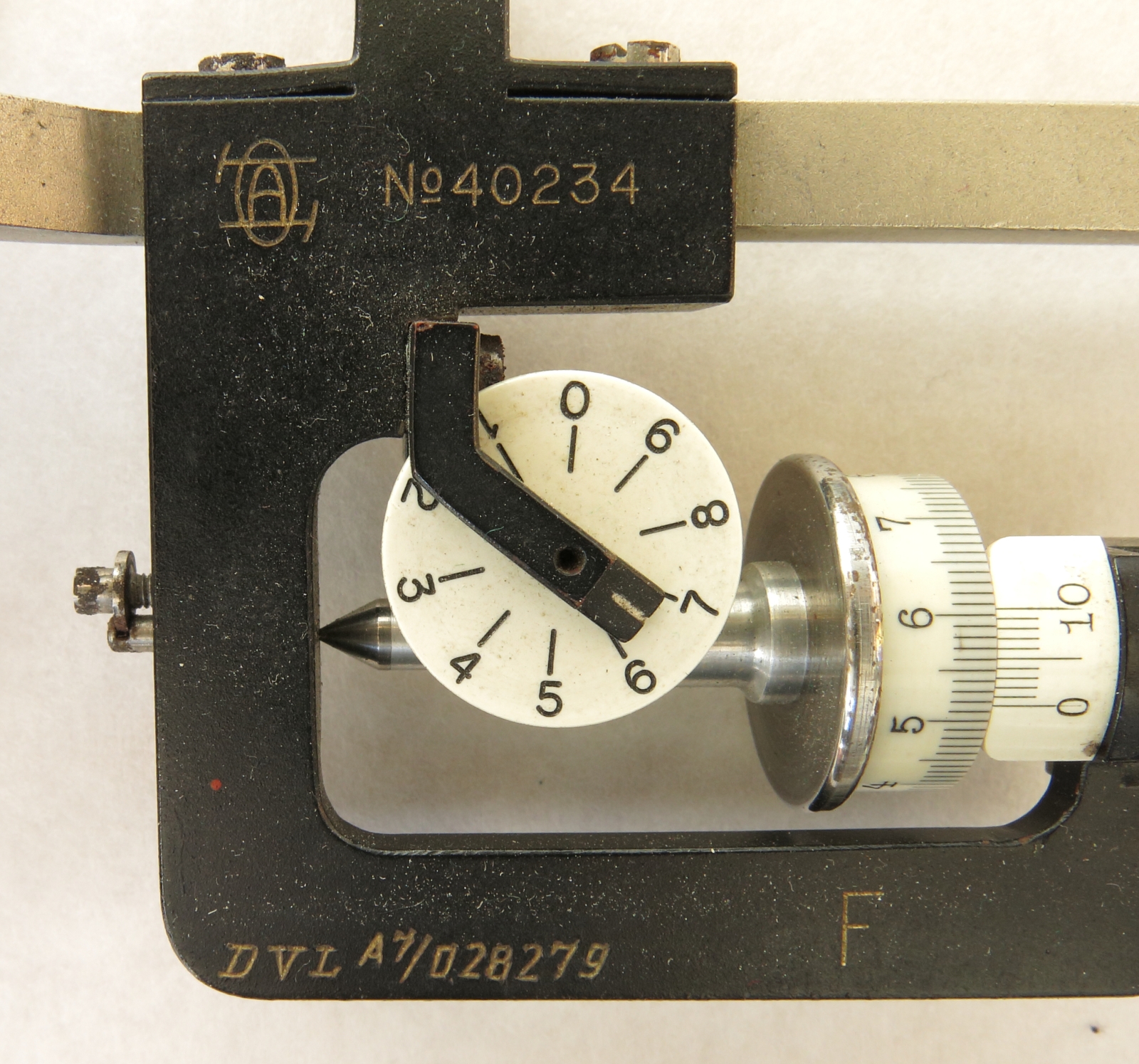 Notes: "This is a 2-wheel integrator, measuring area and moment but not moment of inertia. Unusually, the rail is included and there is space in the box for it. The box appears to accommodate rails of two lengths, and this is the short one. Ott's serial number, 40234, is engraved on one of the recording mechanisms, and the original owner, ""DVL"", has engraved their inventory number, A7/028279, on the same recording mechanism. DVL has also marked that number on a plaque attached to the box above the keyhole. "