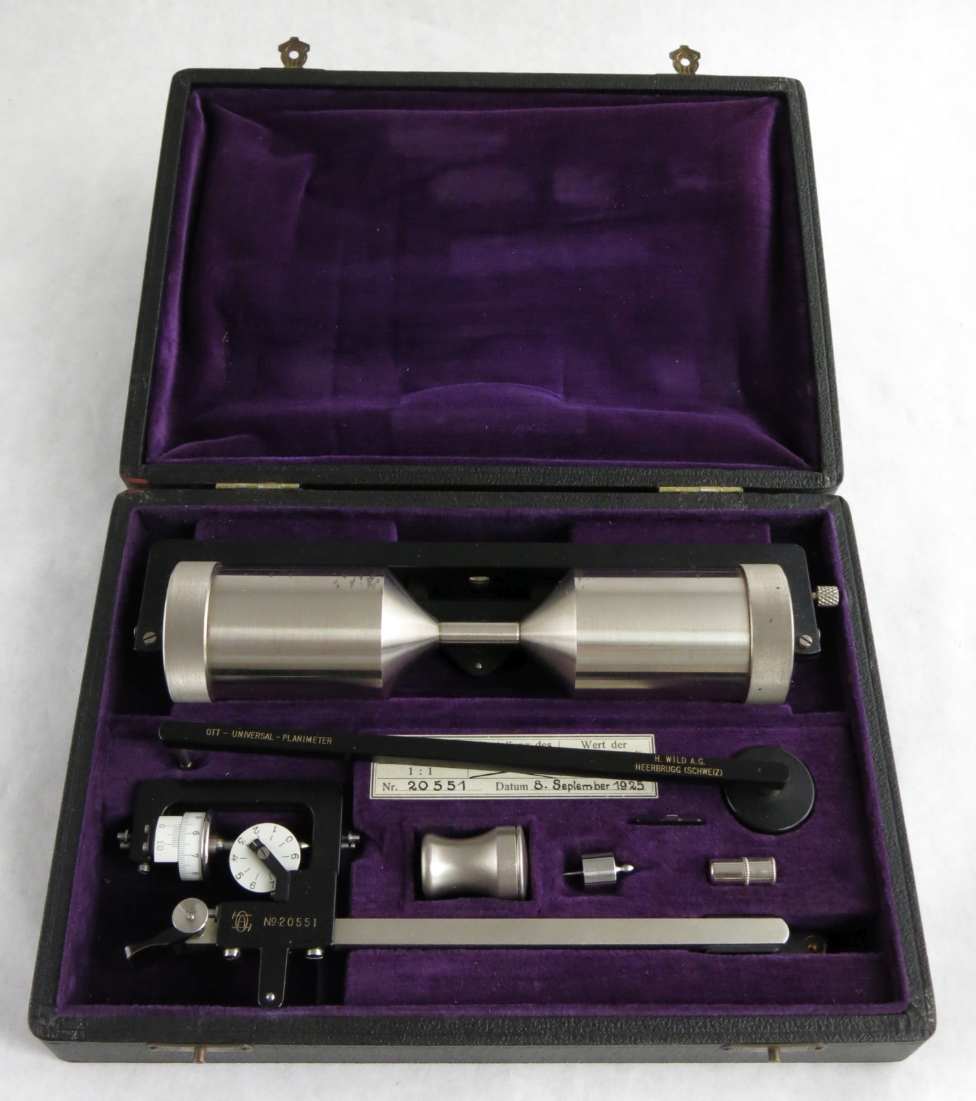 Notes: "The Ott Universal Planimeter is truly three planimeters in one, performing all the functions of a polar planimeter, a radial planimeter, and a (small) rolling planimeter. It comes with all the accessories necessary for those tasks: the pole arm, the wheels, and the pivot pin."
