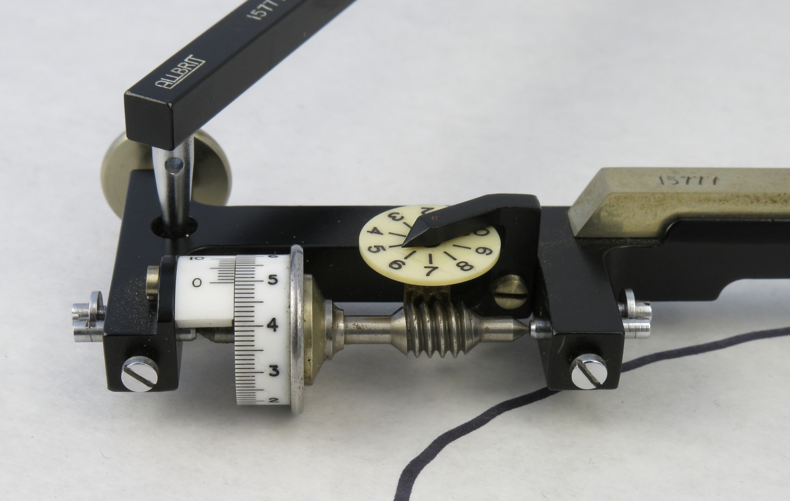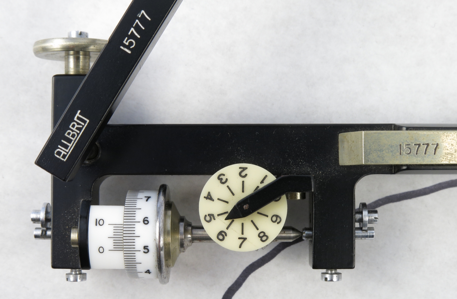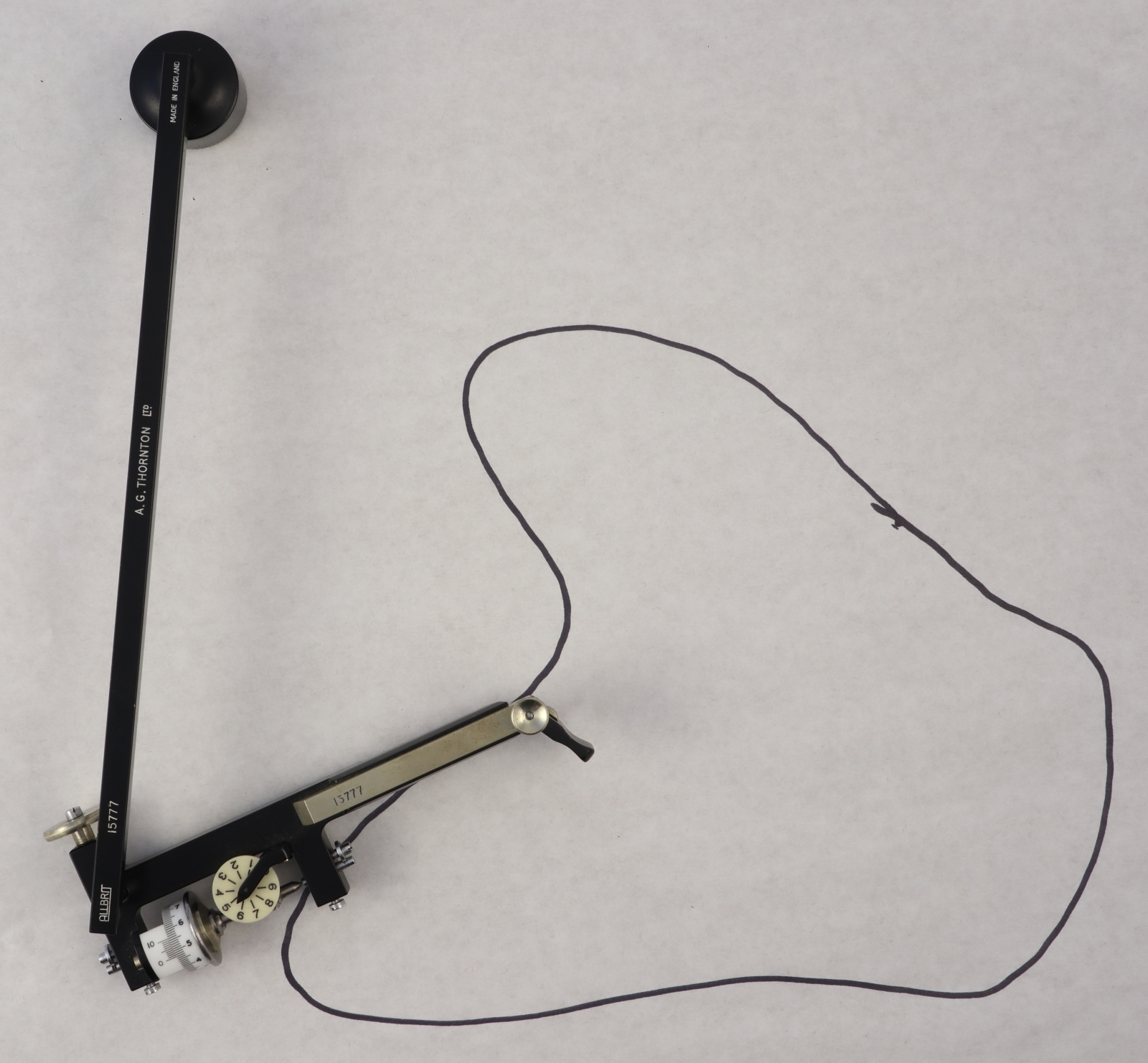 Notes: "This is an Allbrit (W.F. Stanley) fixed arm planimeter that was sold by A.G. Thornton. The fixed arm is quite short, measuring only 3.625 inches from the tracing point to the tracing wheel. This short tracing arm should give greater precision when measuring very small areas."