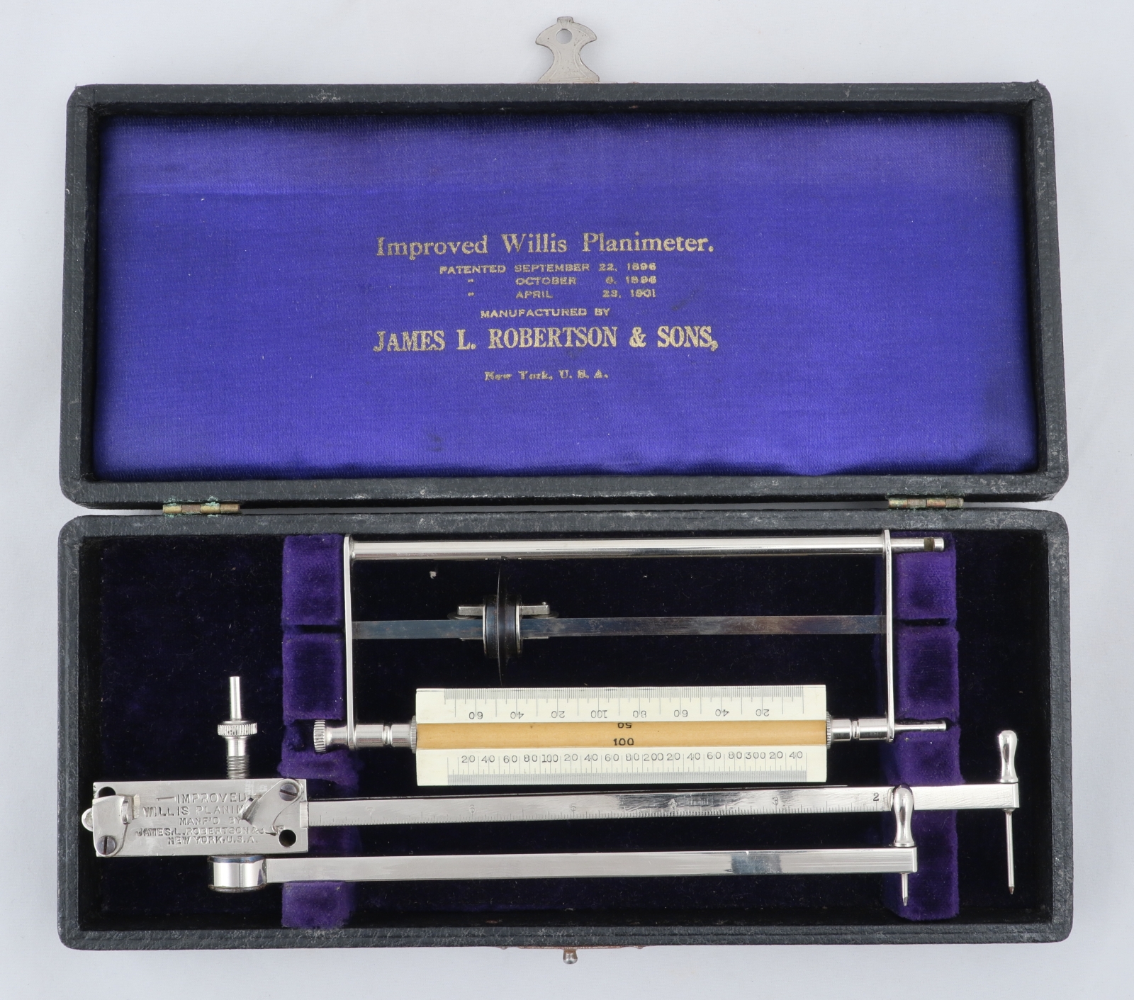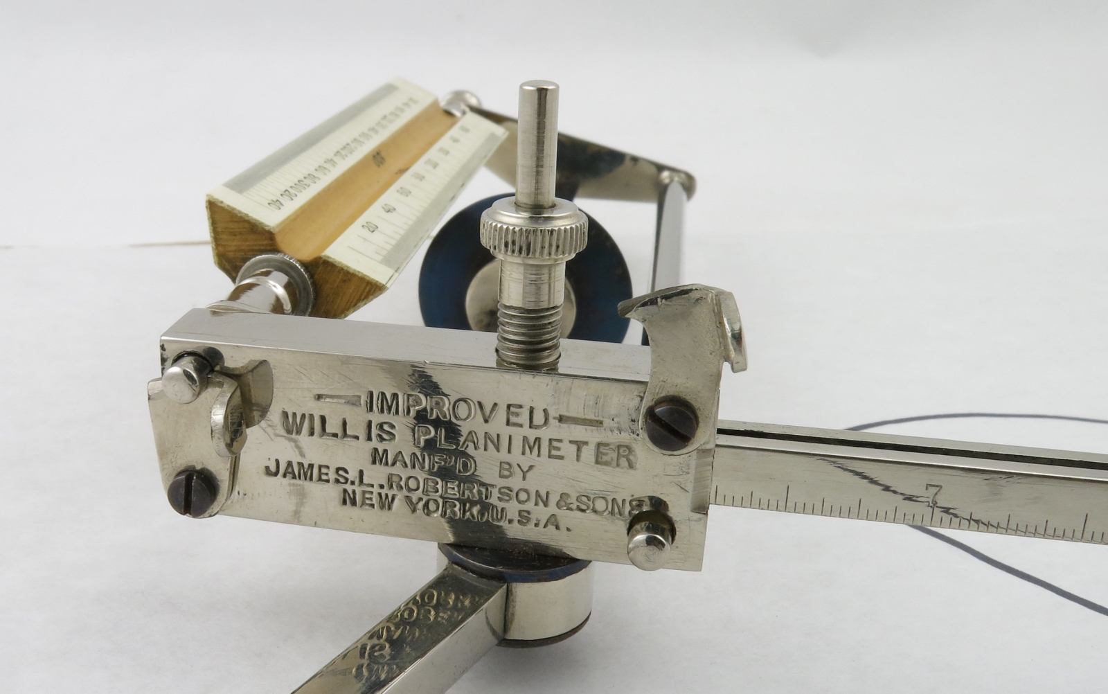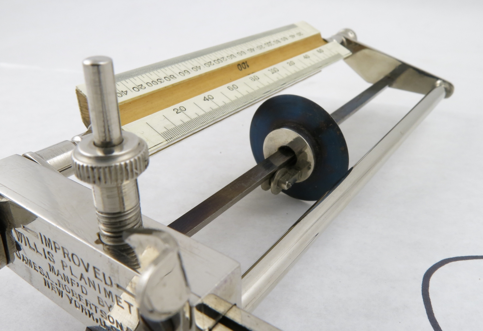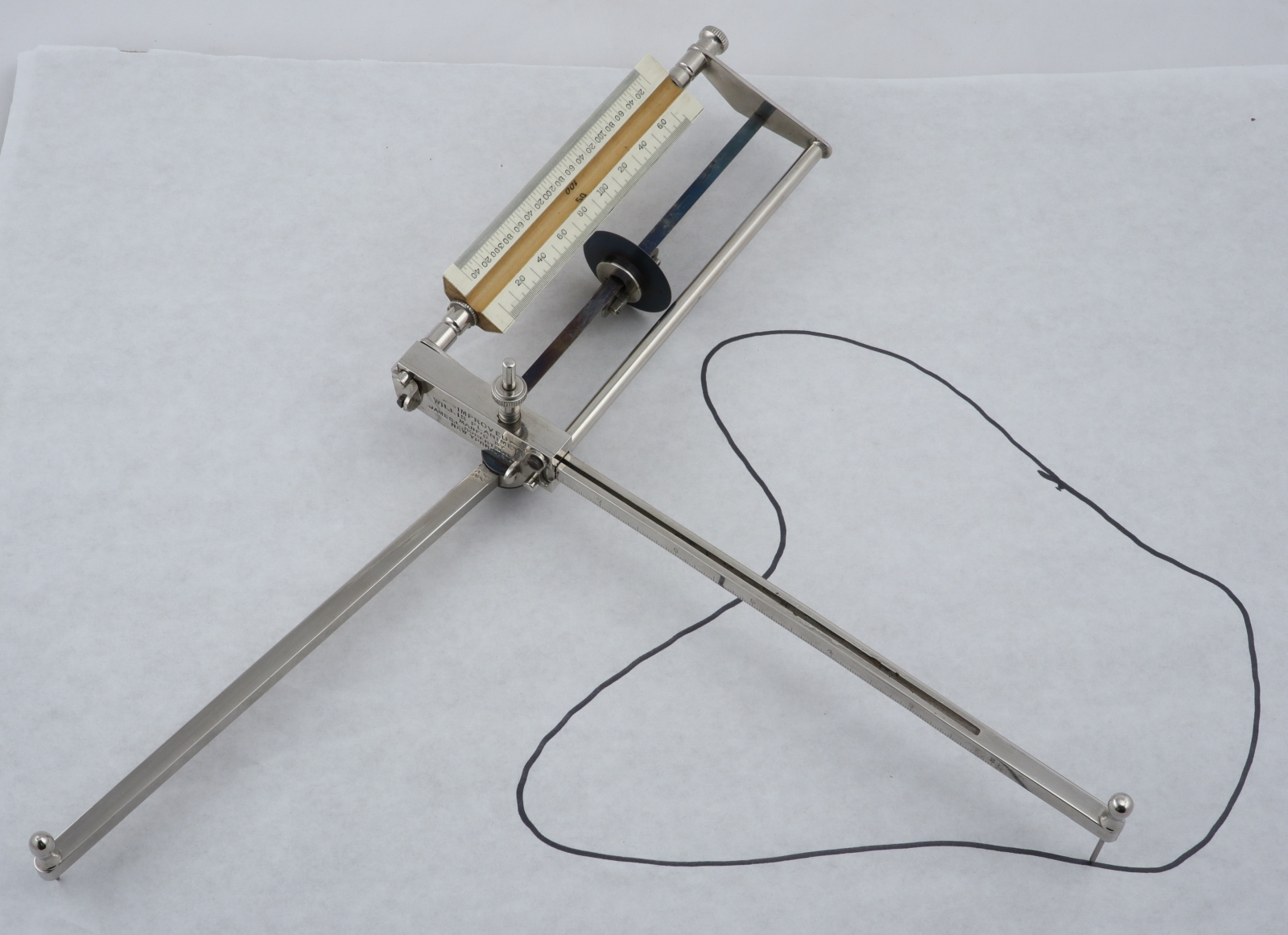 Notes: "This is the improved model of the Willis Planimeter, incorporating the changes in the 1896 and 1901 patents. The tracing wheel on this one rides on ball bearings along a triangular blued steel rod. "