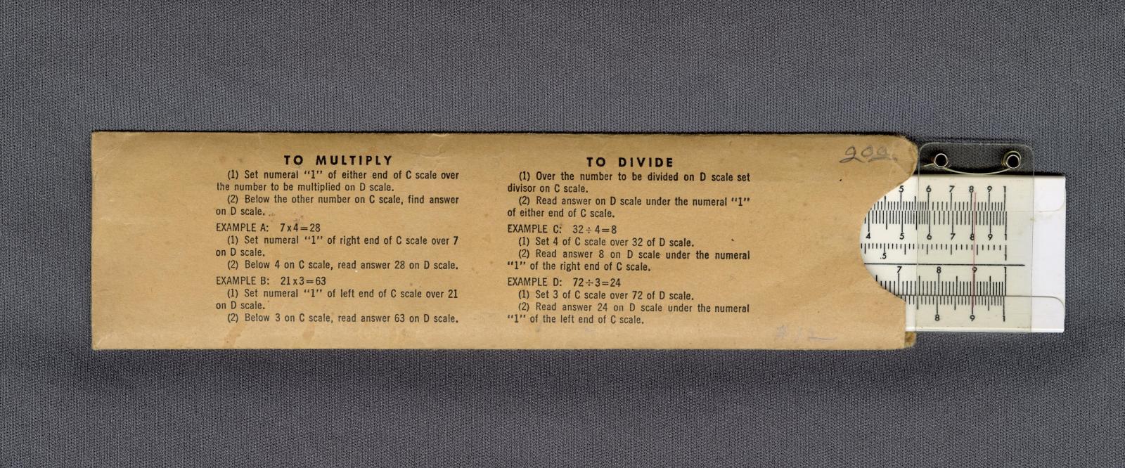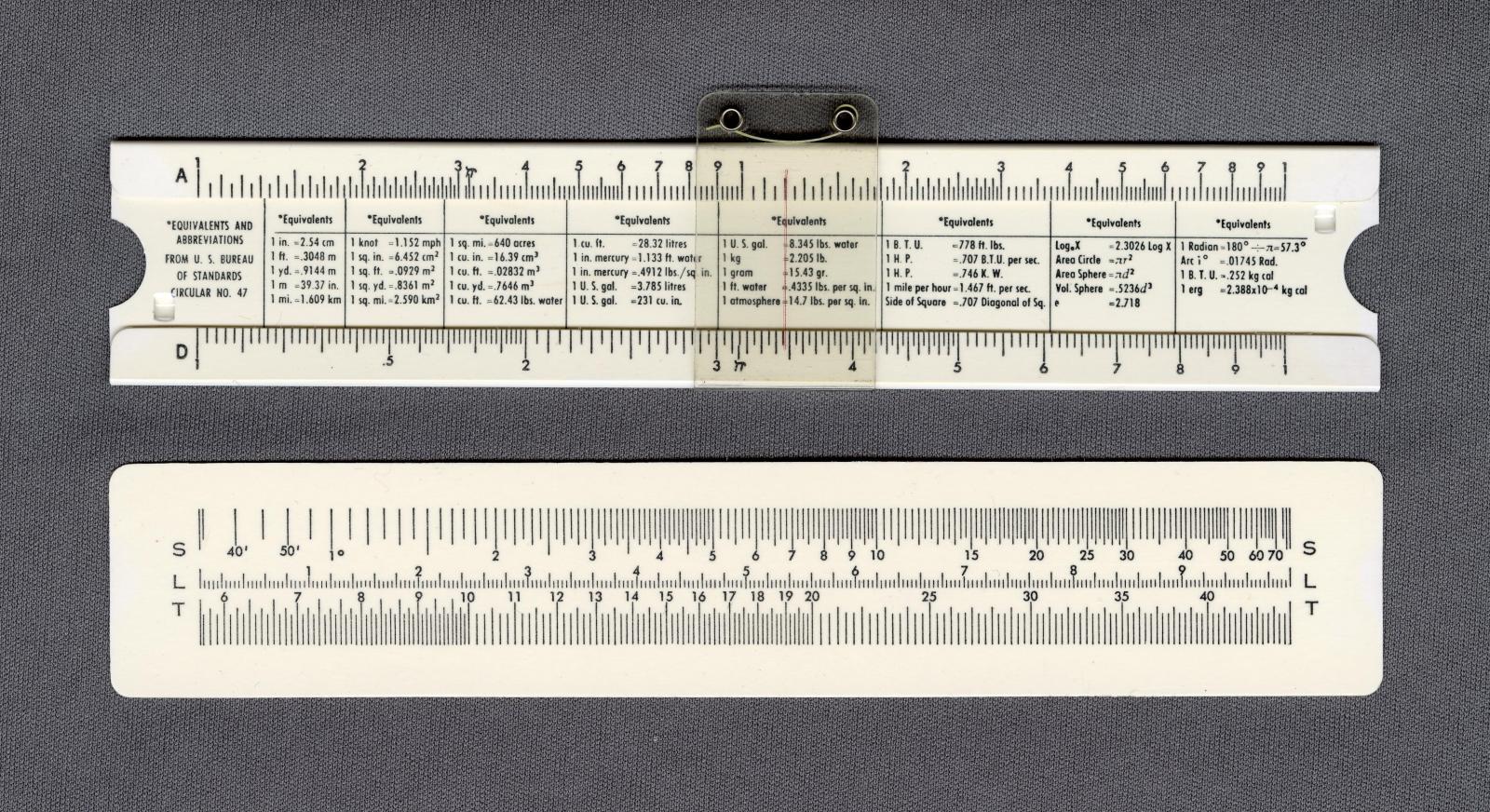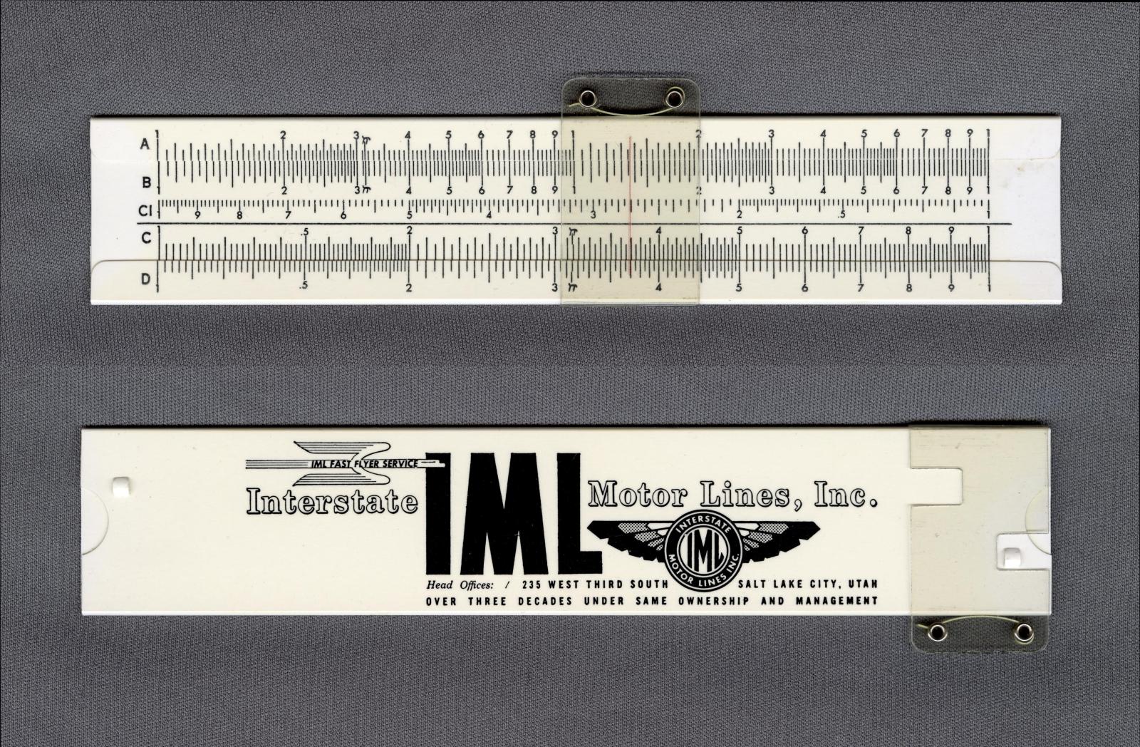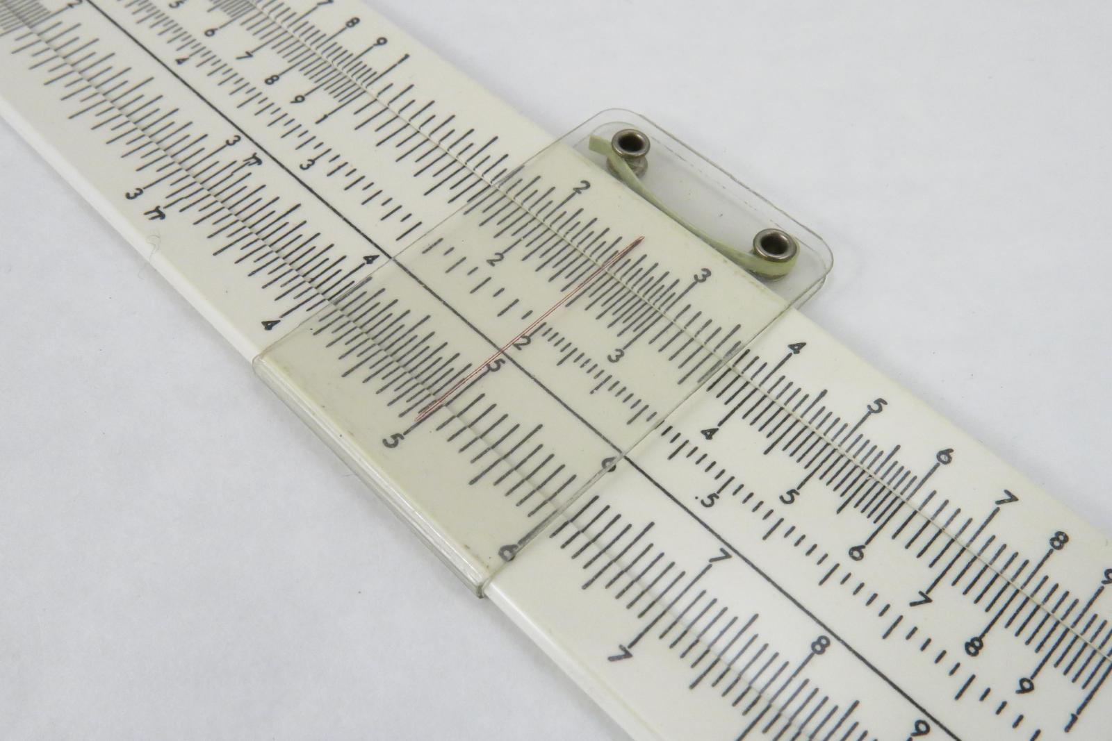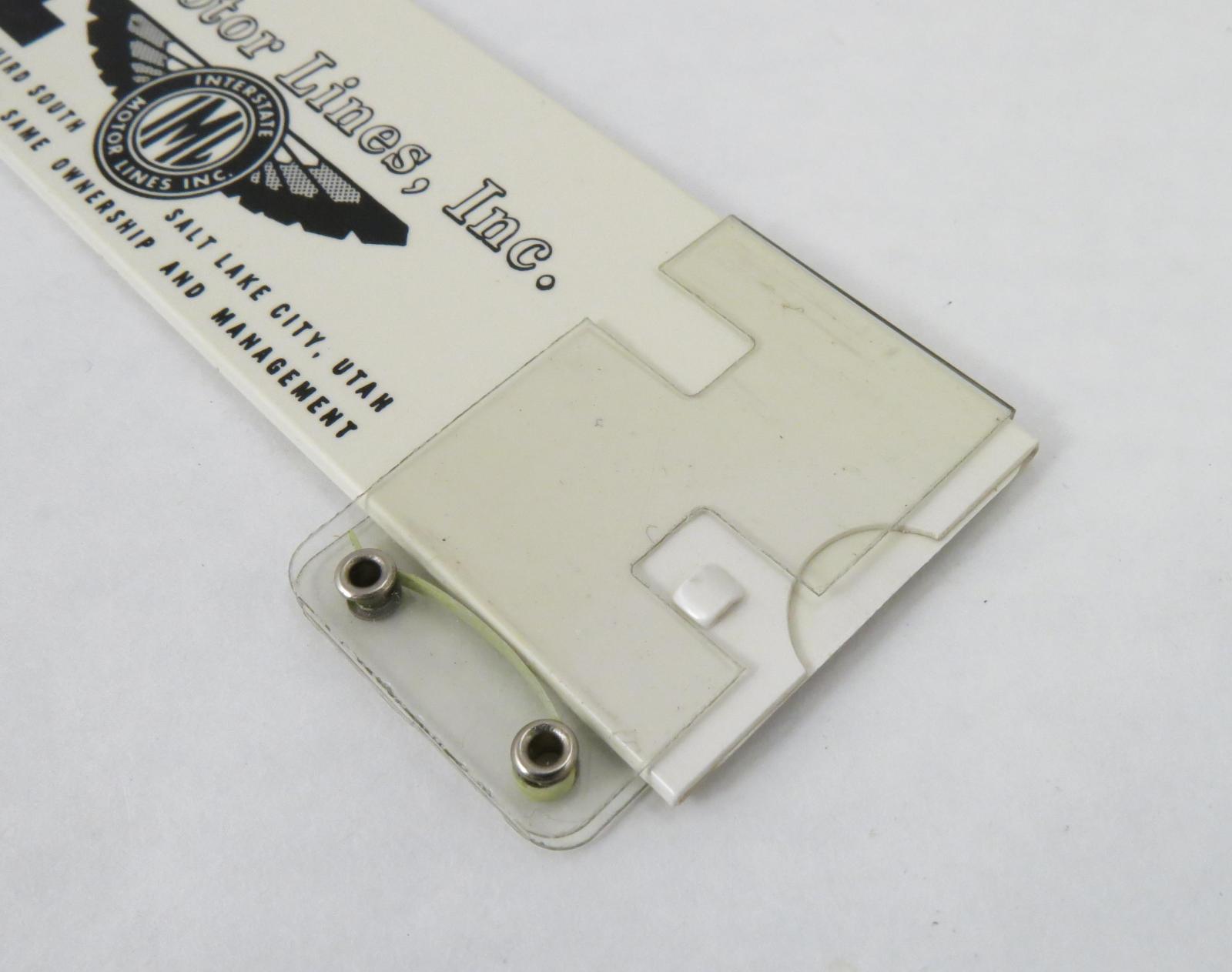 Notes: "This is a small slide rule made as an advertising / promotional item. The body of the slide rule is folded sheet plastic, and the slide is a single flat piece of sheet plastic, nothing new here. The cursor, on the other hand, is clear plastic sheet wrapped around the rule and closed with two rivets at the top. The rivets double as anchors for the cursor spring. The really interesting part is on the back, where there are two ‘bumps’ in the body of the slide rule that keep the cursor from sliding off the ends, and the cursor has cutouts for those bumps to allow full travel to the end of the rule. "