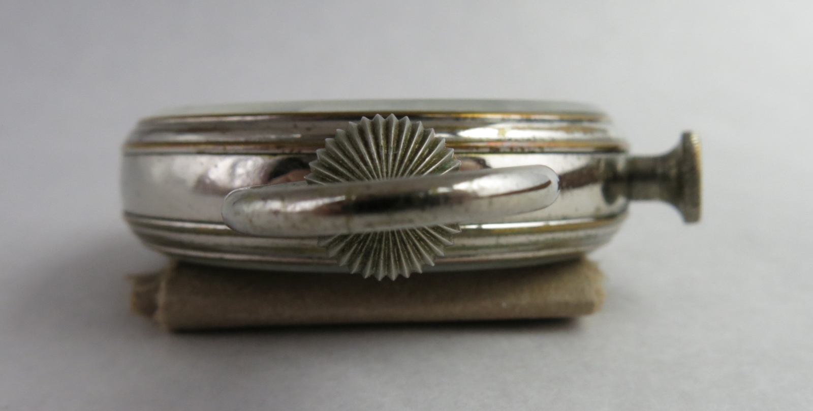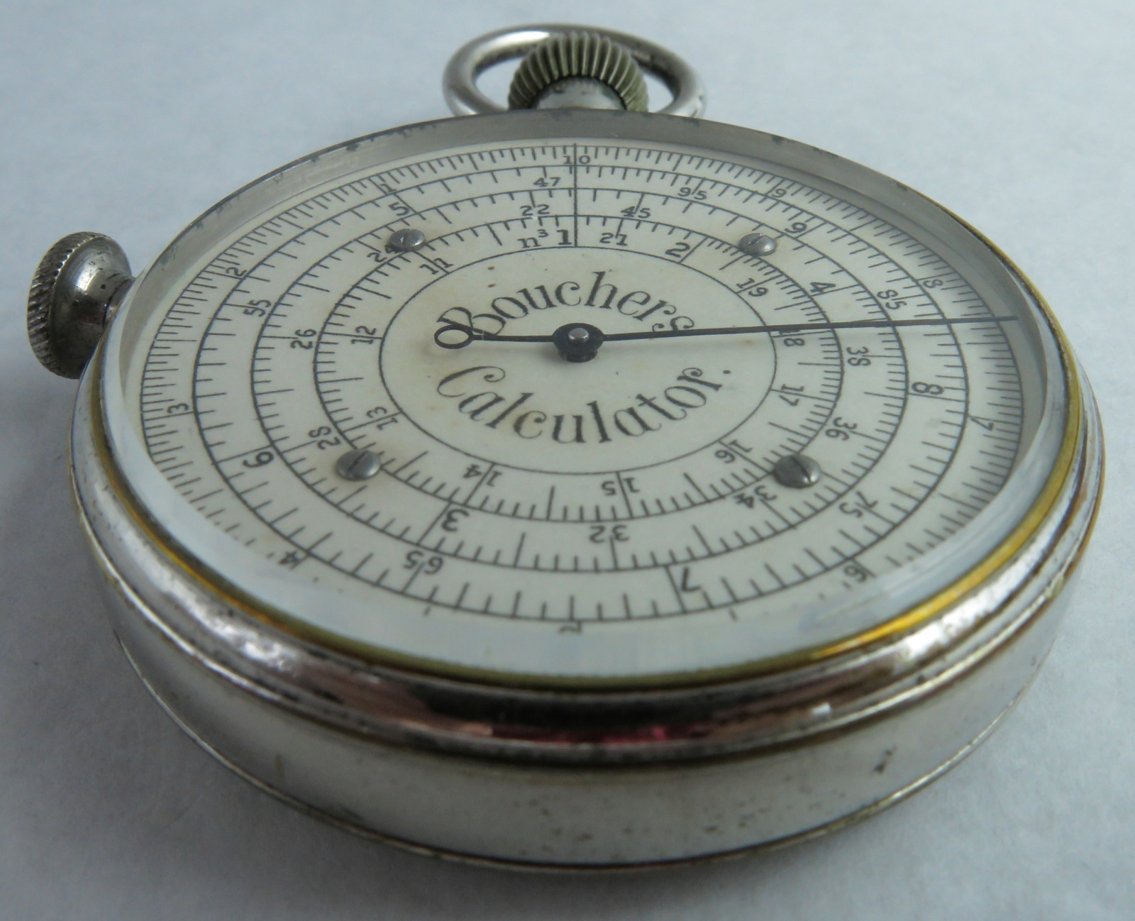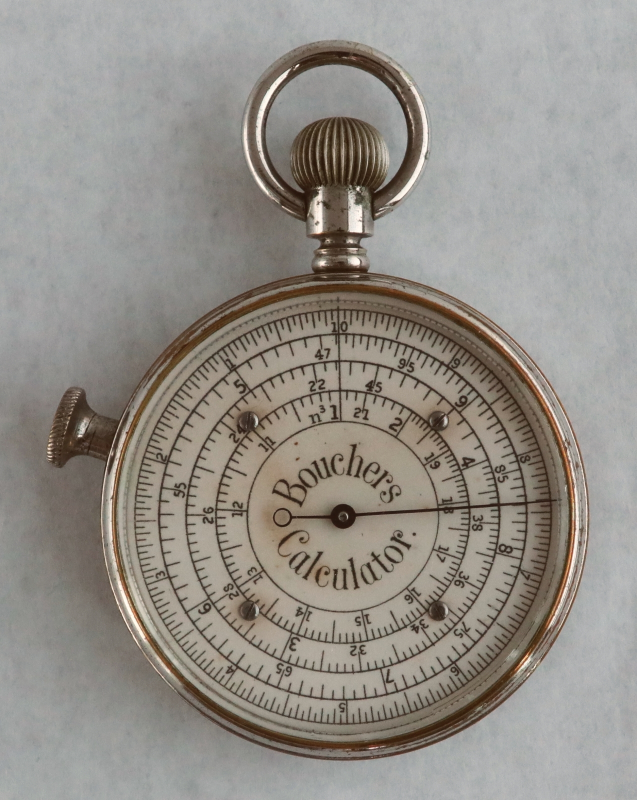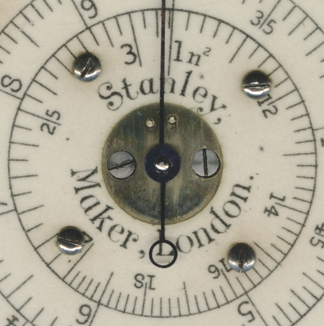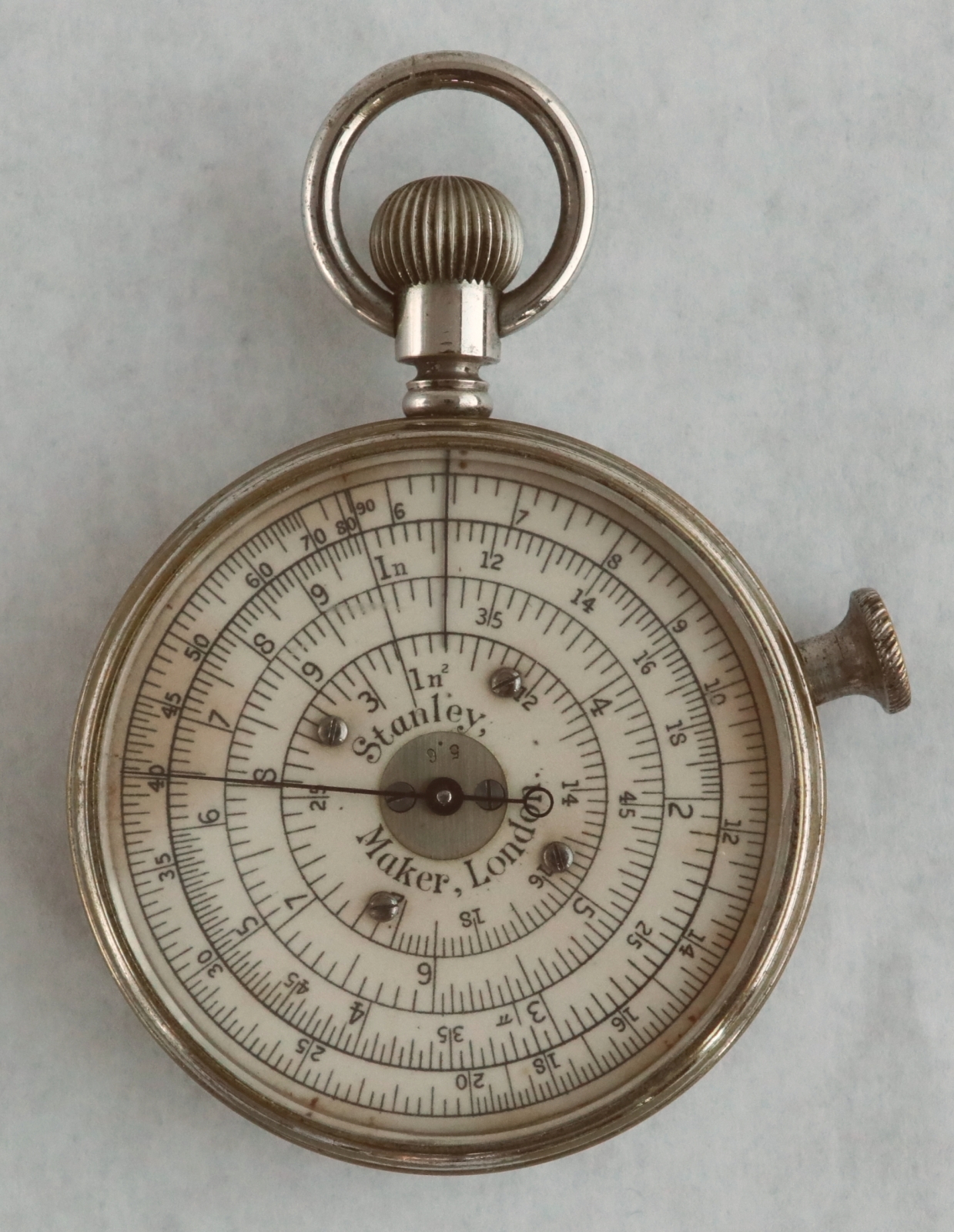 Patented in 1876 it was the first pocket-watch style slide rule but had many makers. It is uncertain if this duplex model with two crown knobs was made or just retailed by Stanley.