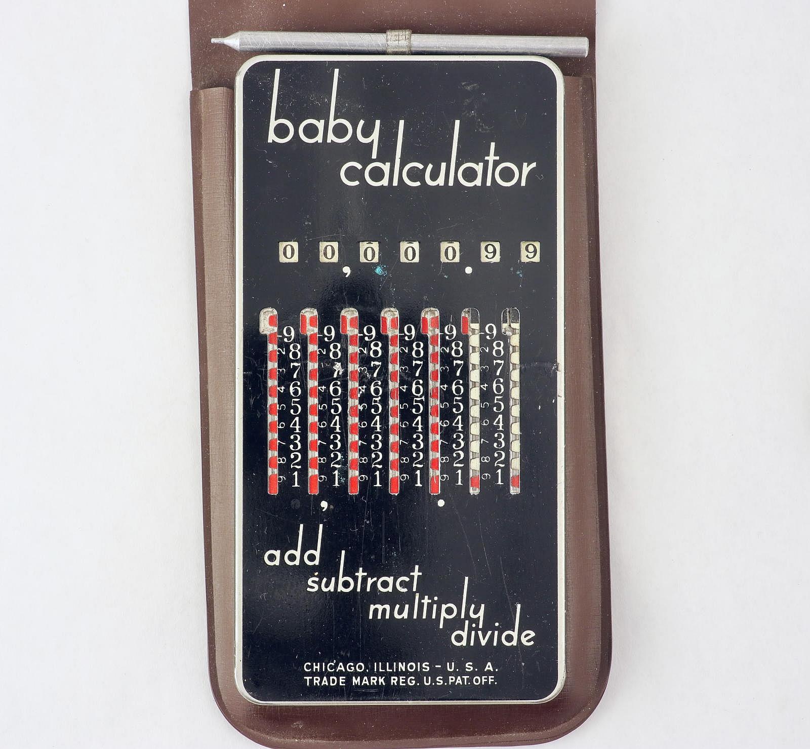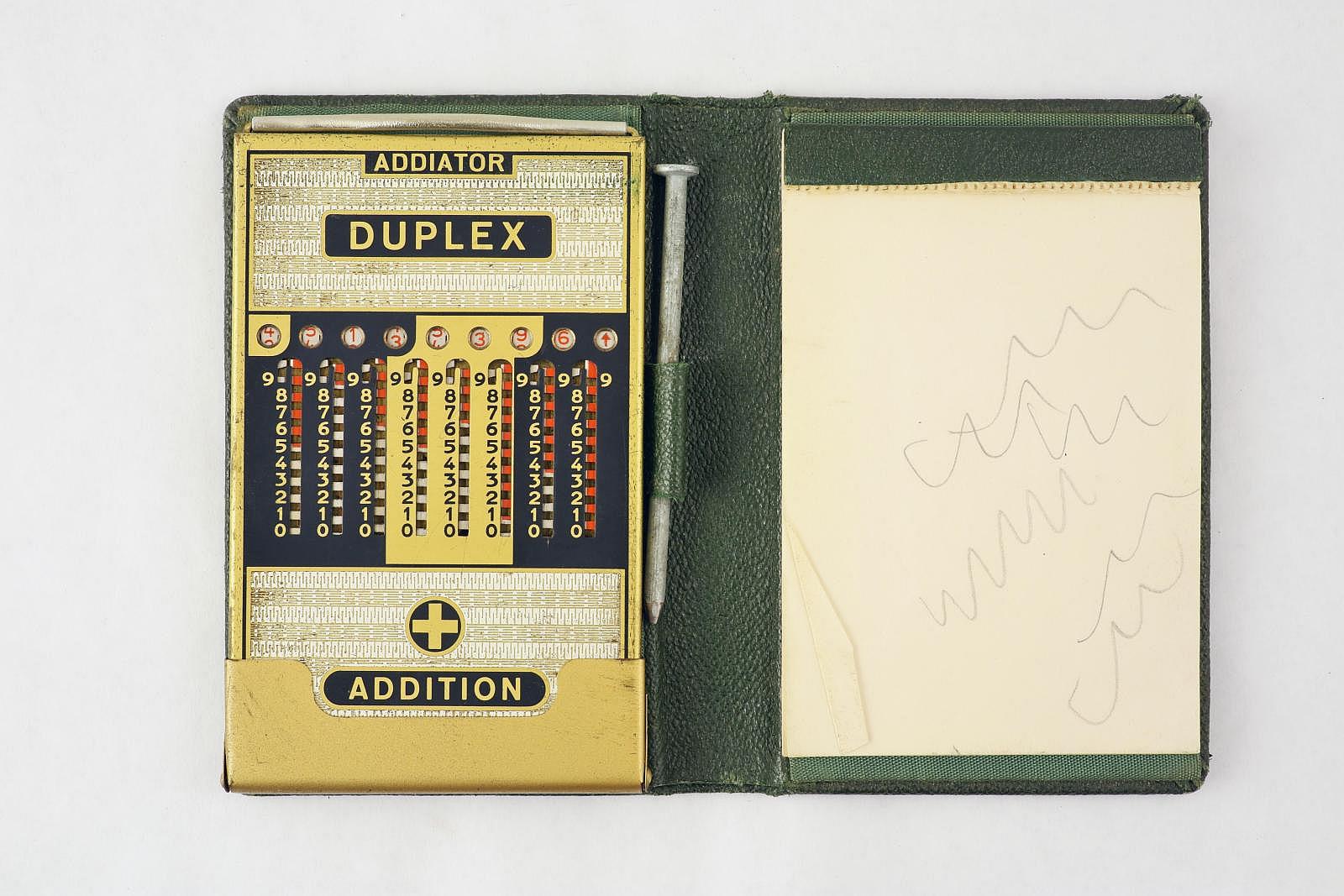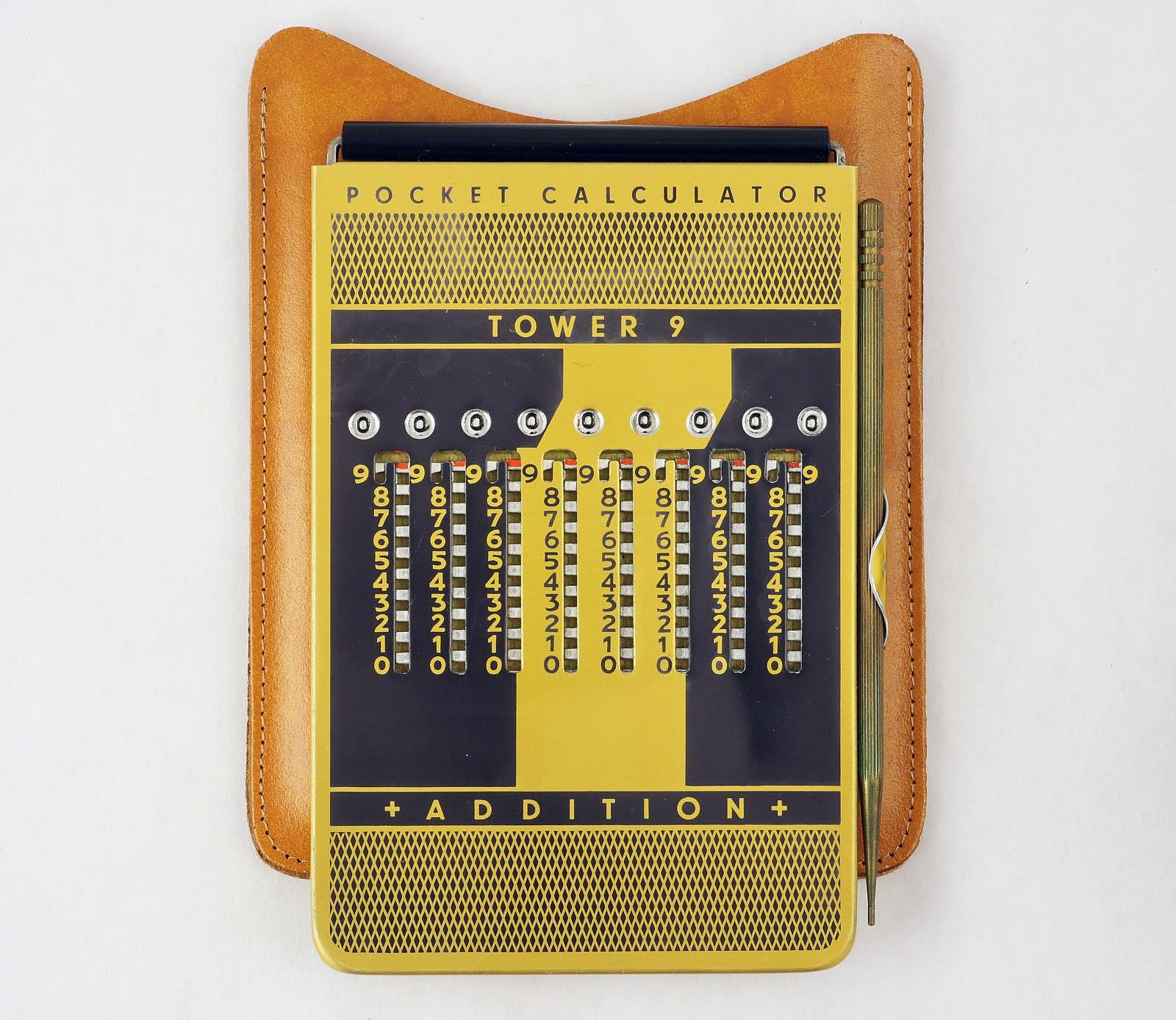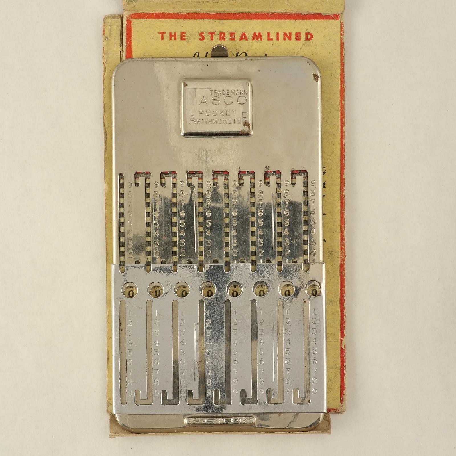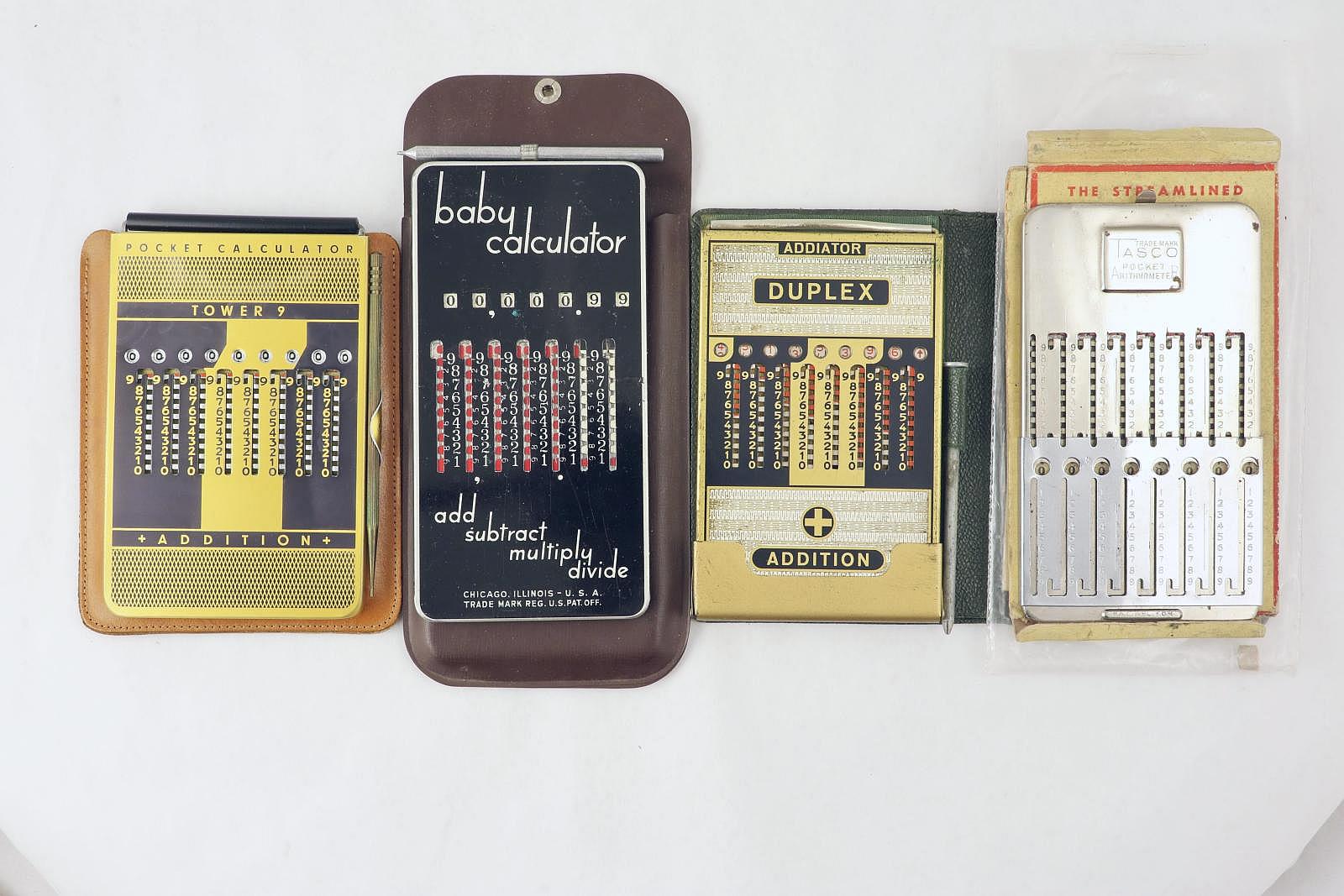 Notes: "These four all-metal slide adders are one step above the plastic-and-metal slide adders which were primarily novelties, not for serious work. The adders are: The Tower 9, made by Addimult (an Addiator competitor) to be sold by someone else, possibly Sears. The Tasco Pocket Arithmometer. This is the Gray’s Arithmometer after Tasco (Tavela Sales Co., not the other Tasco that sells telescopes) bought them out. The Baby Calculator is providing our dose of art deco styling for the day. The Addiator Duplex is in a folding leather (or good imitation) case, with original notepad."