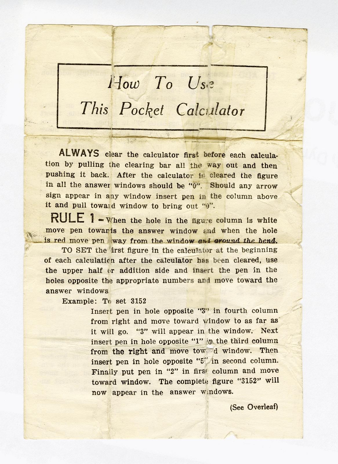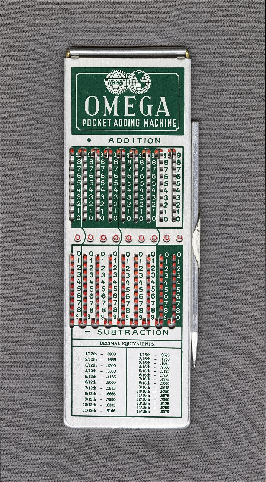 Notes: "The Omega slide adder was made in Hong Kong, and was one of the nicer copies of the Addiator design. The design of the exterior of the Omega was copyrighted by T. H. Ramsey in 1964. The Omega adders (there was also a 6-column version) may have been made for a company in Campbell, California called Wescosa. Some are marked “Made exclusively for Wescosa”. "