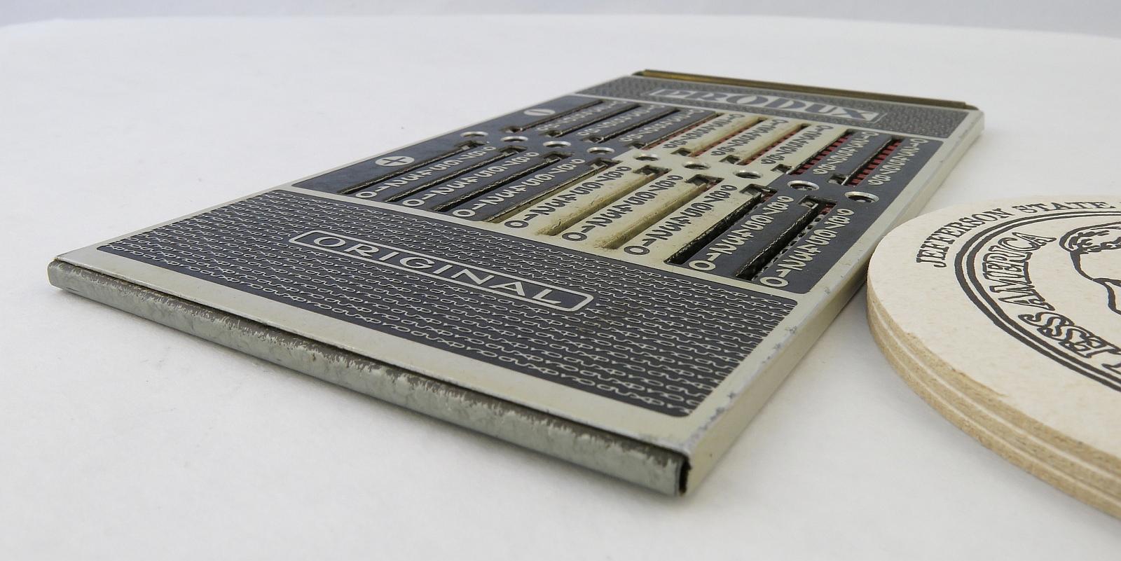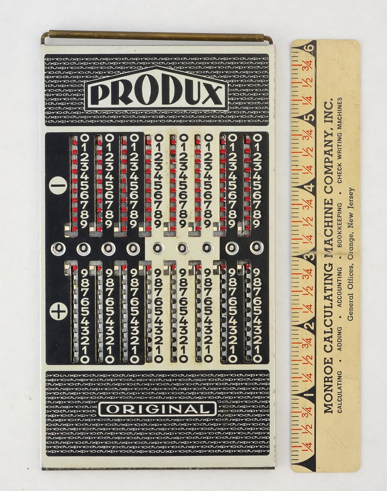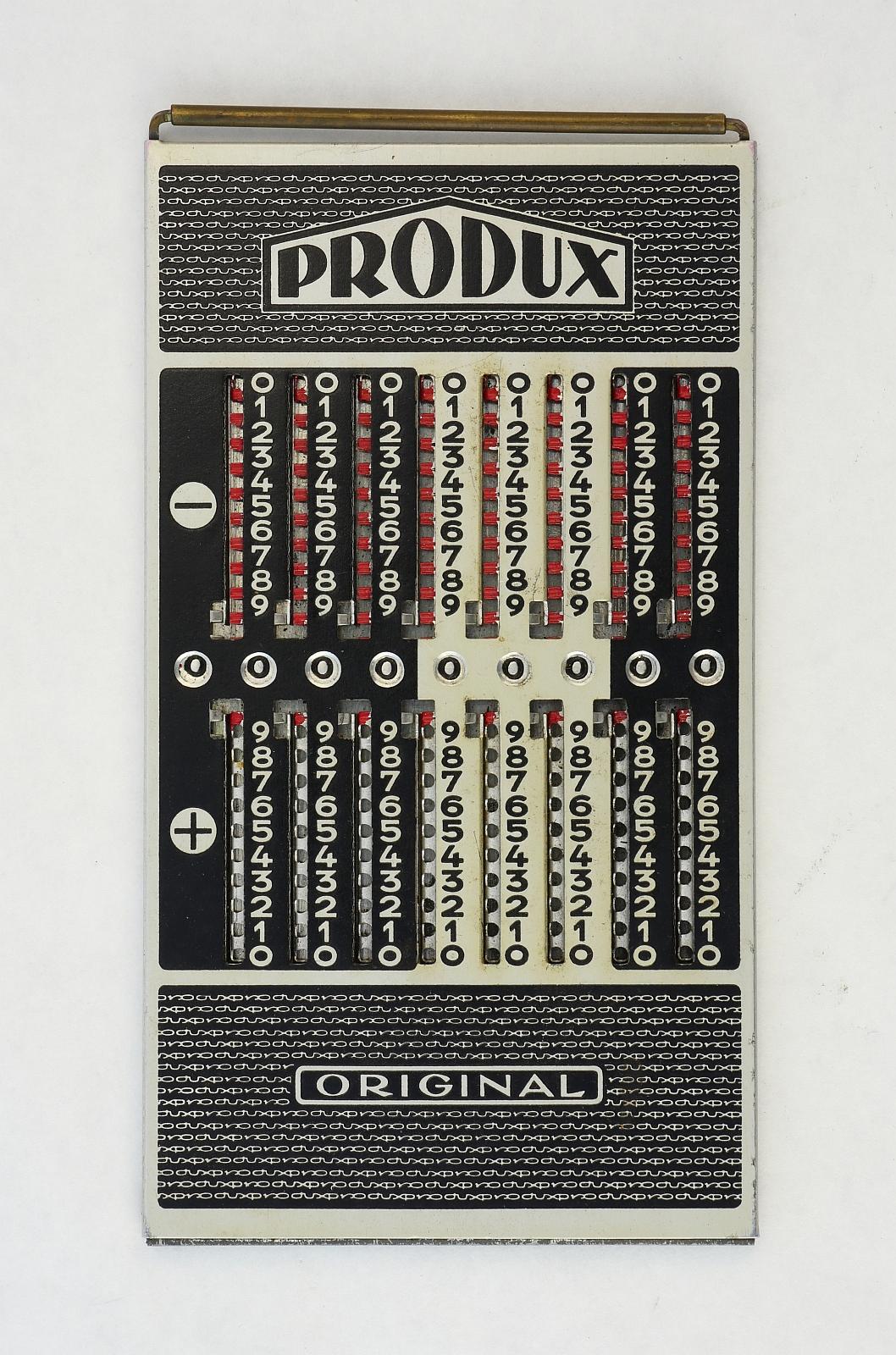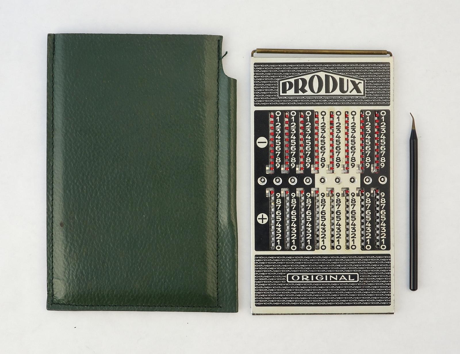 Notes: "Produx was a slide adder company in German that was founded by Otto Meuter, after he had previously worked designing slide adders for Addiator, the 800 lb. gorilla of the German slide adder market. After leaving Addiator in the early 1920s, Meuter founded a company with J. Bergmann to produce, what else?, slide adders. His adders were sold under the names ProCalculo! and Correntator. In 1928 he began to sell the Produx, which had a very long run. It continued to be made after World War II, and in fact this one is marked on the back in very faint blind stamped letters, “Made in Germany – West”. "