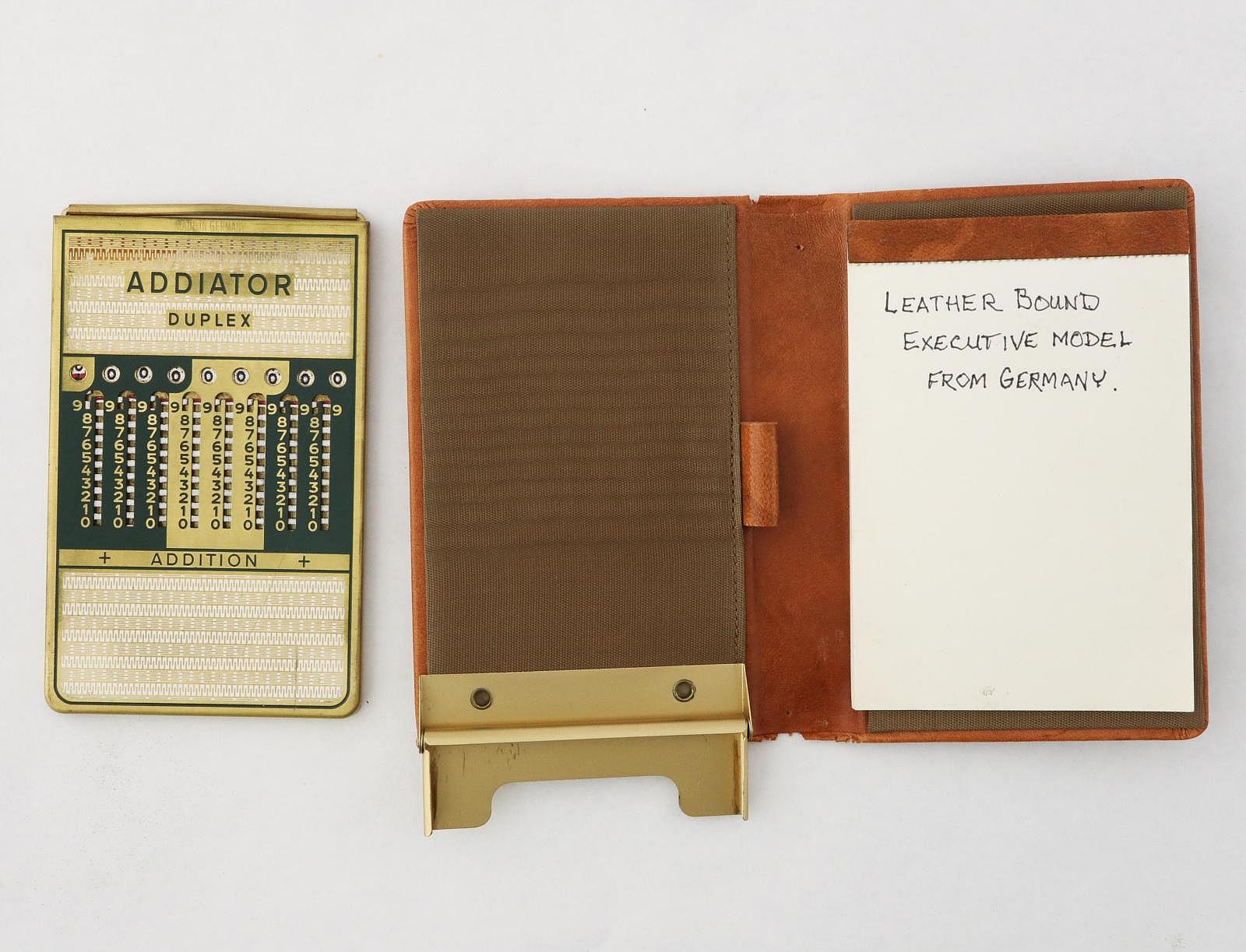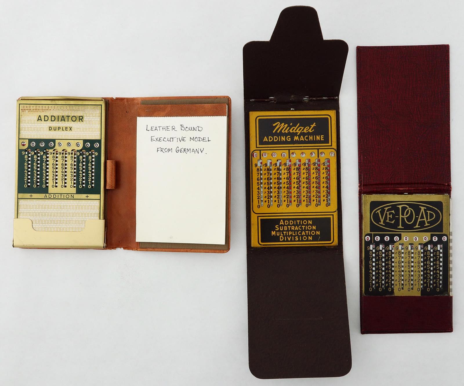 Notes: "Here we have three slide adders: an Addiator Duplex, a Midget Adding Machine, and a VE-PO-AD (Vest Pocket Adder). The Addiator was very clearly built to be used as a real adding machine, albeit an inexpensive one. The Midget and VE-PO-AD on the other hand, well, they have the look, and more importantly, the feel of novelties, rather than something to be taken seriously. "