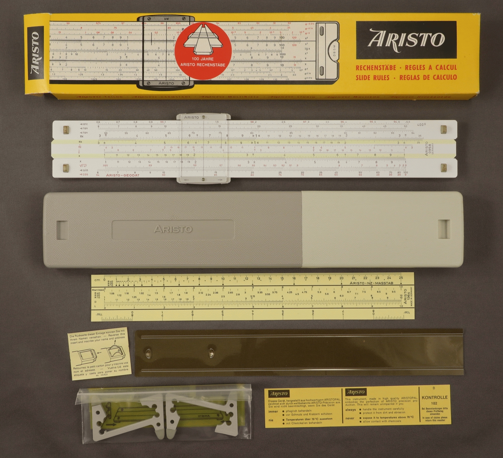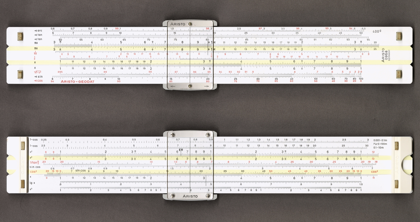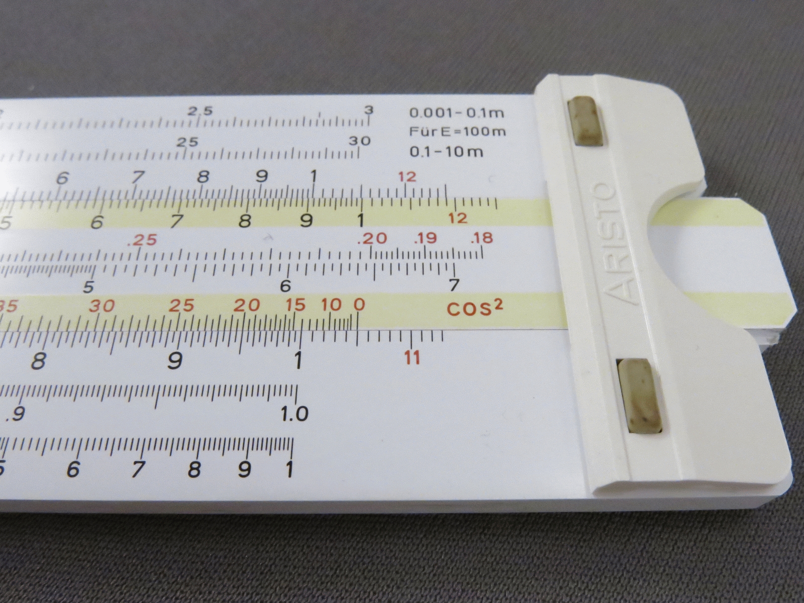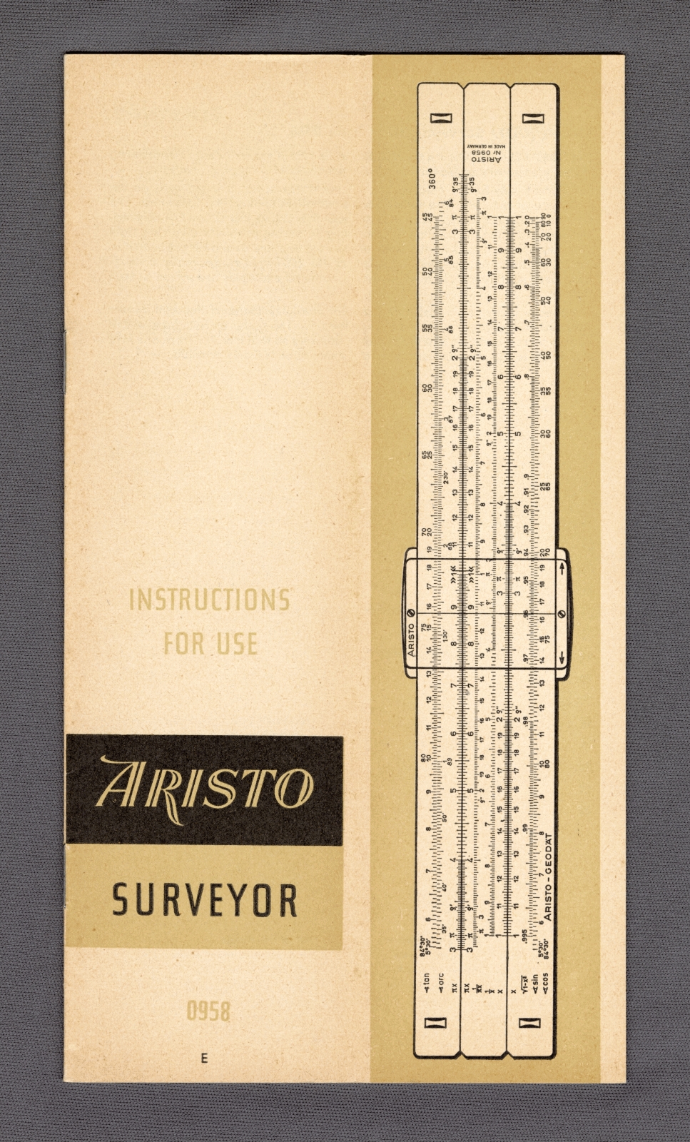 Notes: "The model 0958 Geodat was Aristo’s most advanced slide rule for surveying. In addition to the usual C, D, CF, DF, CI, L, K, A, B, SIN and TAN scales (most labeled with their function rather than name), the 0958 has cos, sin • cos and cos2 scales, plus a P scale for sin-cos conversions, a special tangent scale for large angles, and 1-cos scales for stadia surveying using a horizontal rod. Also, there is a special scale labeled 1/tan(a/2) that can be used to calculate the hypotenuse minus the opposite side in a right triangle, and which also provides the capability to correct for Earth curvature and atmospheric refraction (note the ER hairline on the cursor). "