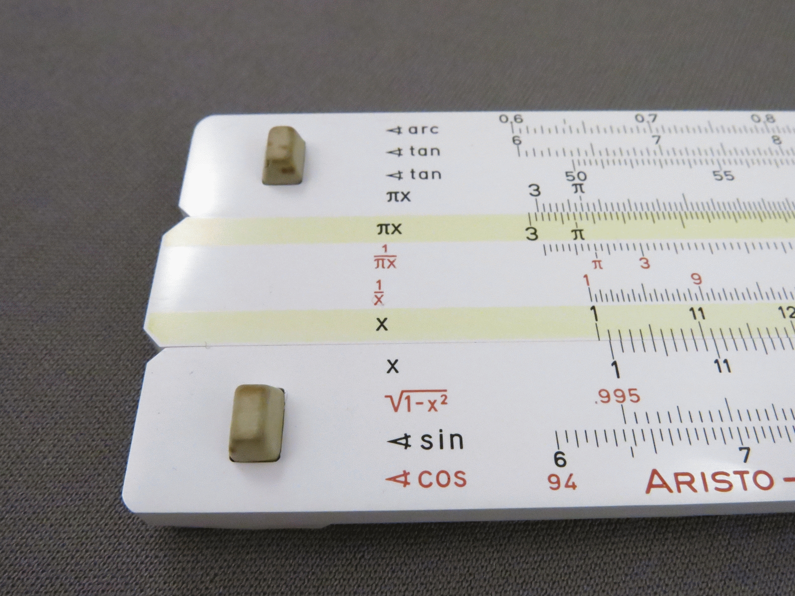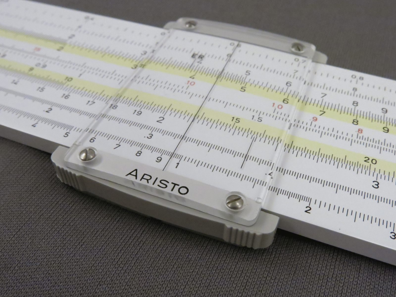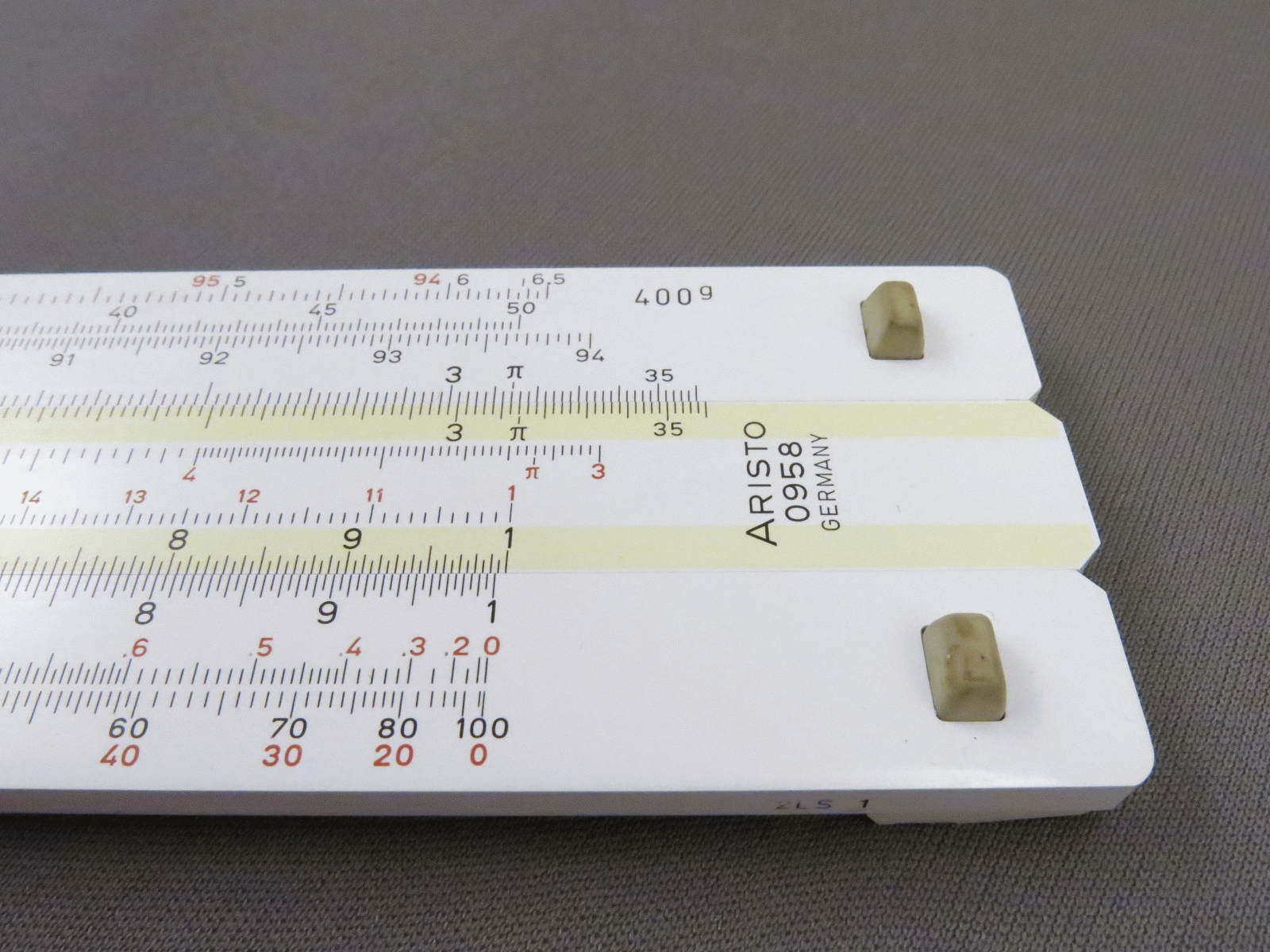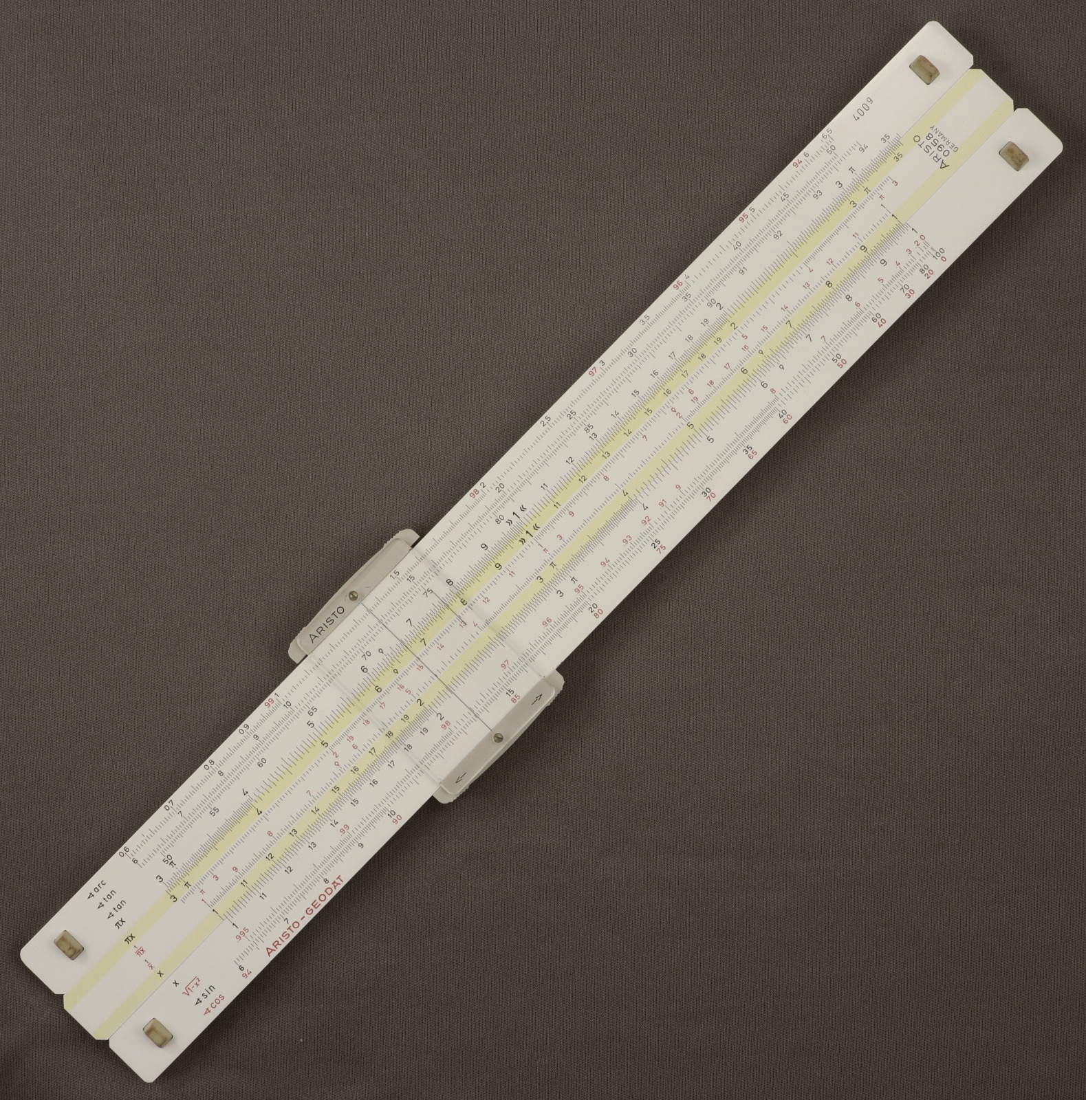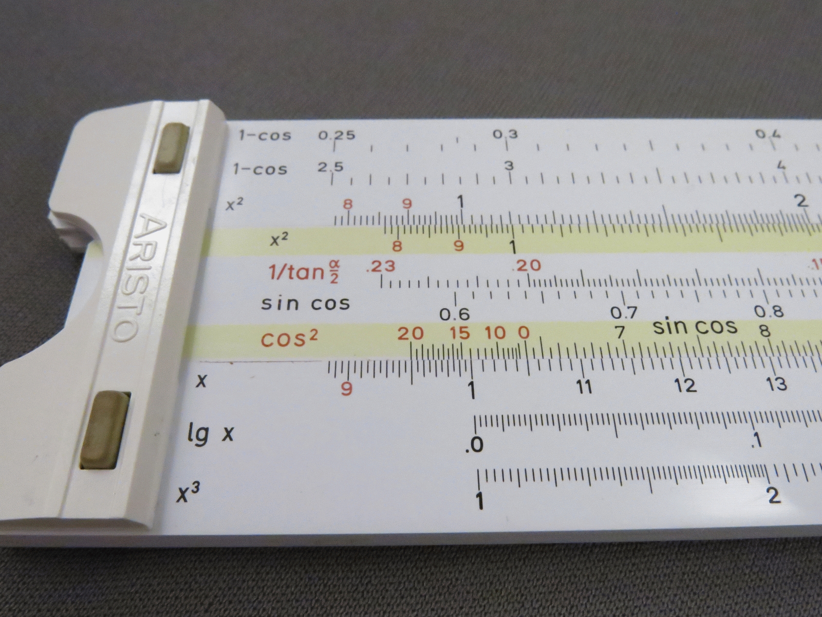 Notes: "The model 0958 Geodat was Aristo’s most advanced slide rule for surveying. In addition to the usual C, D, CF, DF, CI, L, K, A, B, SIN and TAN scales (most labeled with their function rather than name), the 0958 has cos, sin • cos and cos2 scales, plus a P scale for sin-cos conversions, a special tangent scale for large angles, and 1-cos scales for stadia surveying using a horizontal rod. Also, there is a special scale labeled 1/tan(a/2) that can be used to calculate the hypotenuse minus the opposite side in a right triangle, and which also provides the capability to correct for Earth curvature and atmospheric refraction (note the ER hairline on the cursor). "