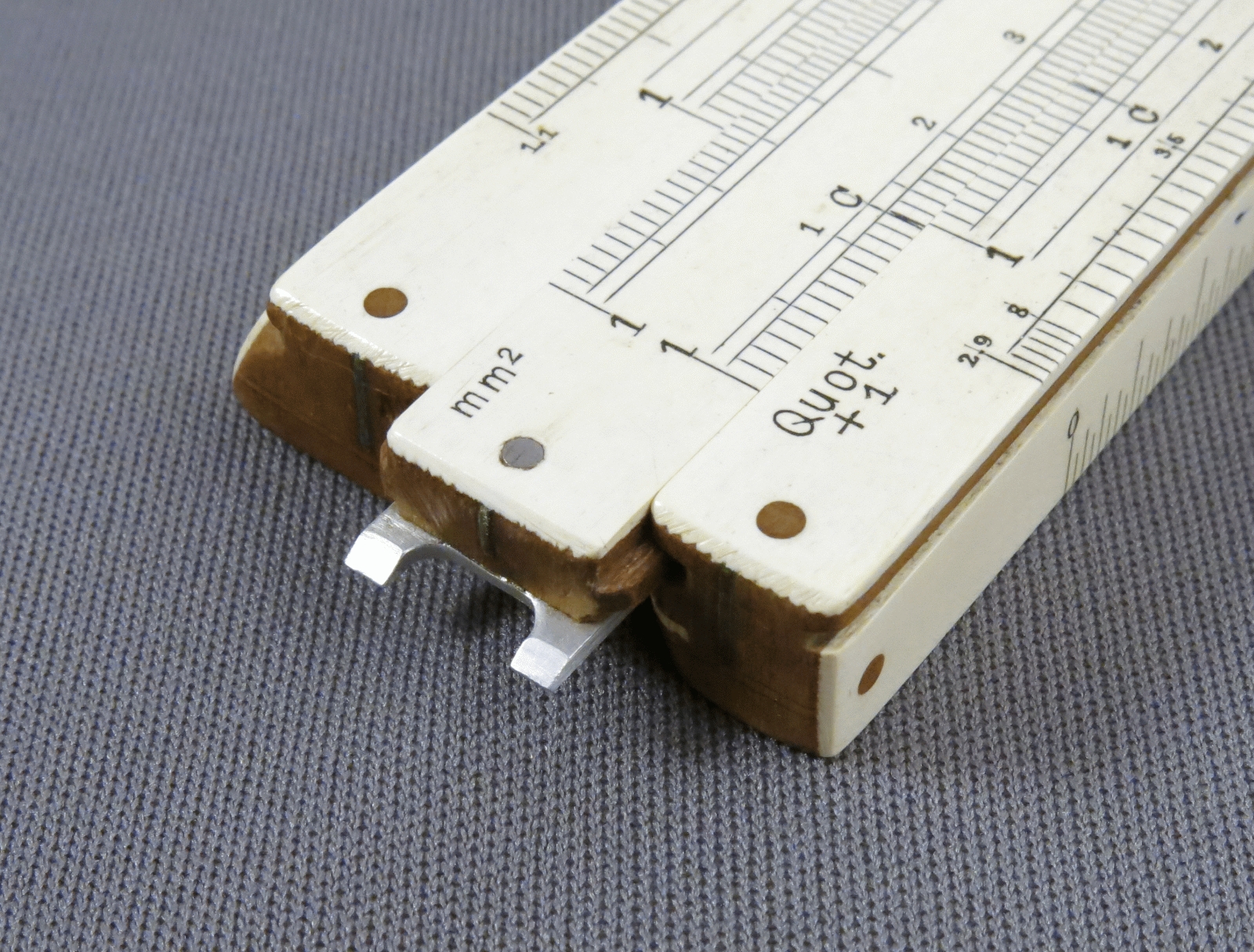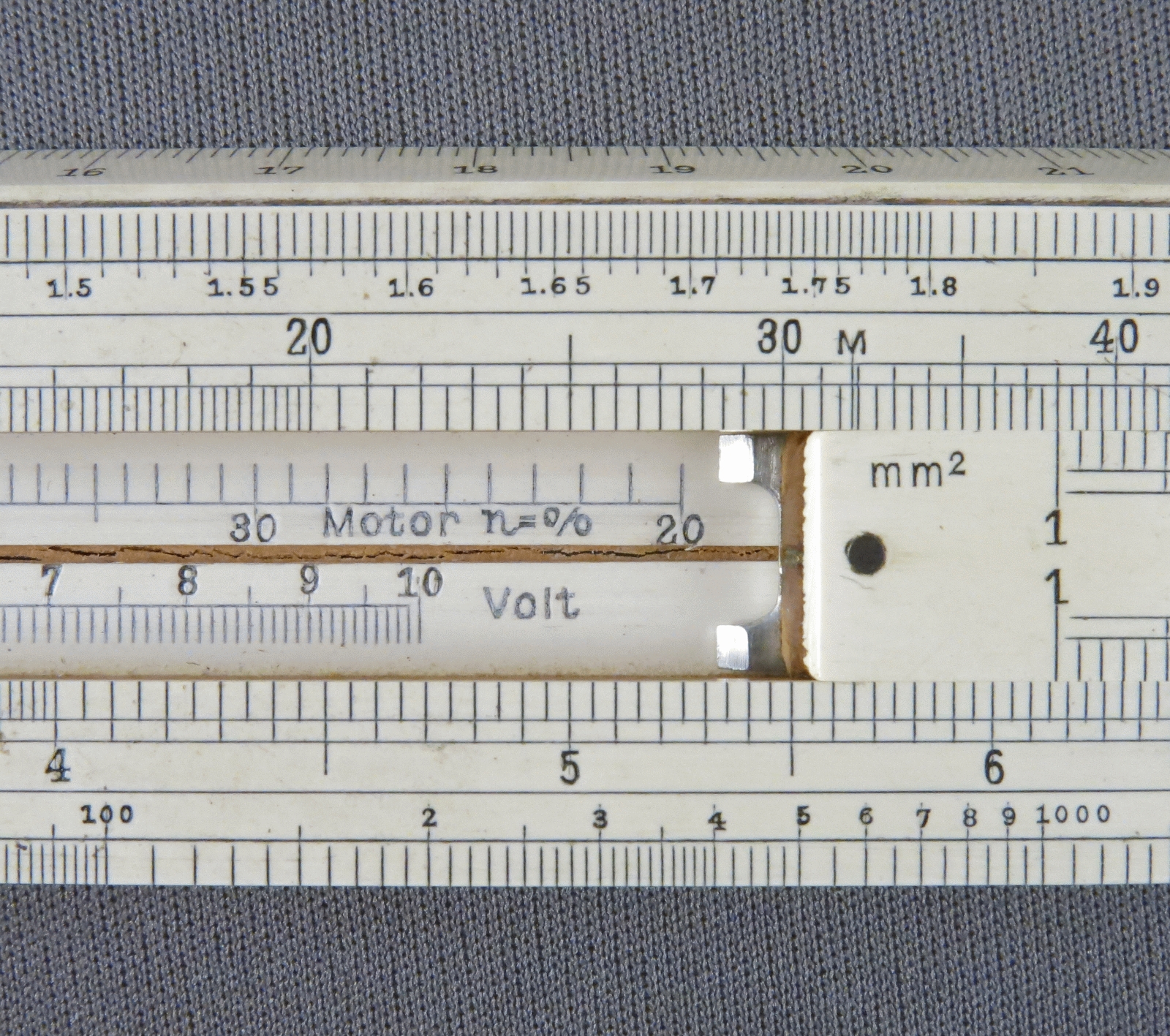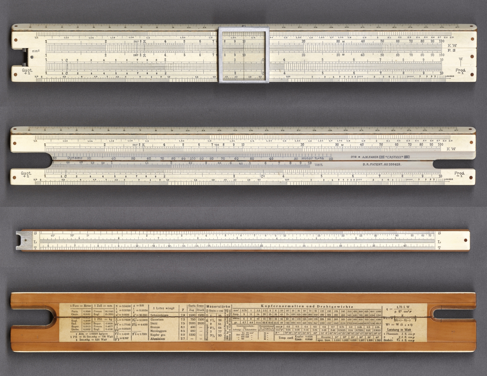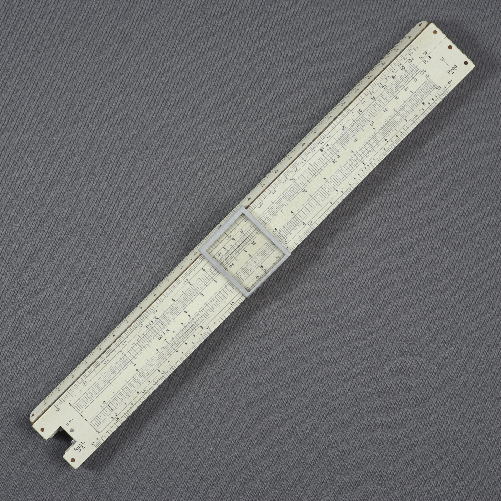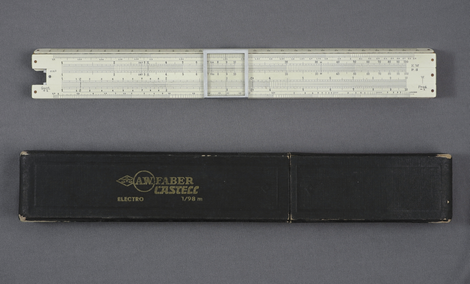 Notes: "This is an early Faber Castell model 378 Electro slide rule. The sure sign that this is an early 378 is the “W” mark at the right end of the C scale. This ‘gauge point’ is necessary for calculations involving both log-log scales because the two log-log scales do not use the same base. Later models of the 378 and all future Faber Castell Electro slide rules used a consistent base (e) across their log-log scales. The model 378 moved the log-log scales from the beveled edge of the 368 to the upper and lower stators on the front face. This slide rule features typically robust Faber Castell construction, with brass bars inset into the wood to allow the owner to bend (carefully!) the rule back to straight should it ever warp, with the brass bars maintaining the new shape. "