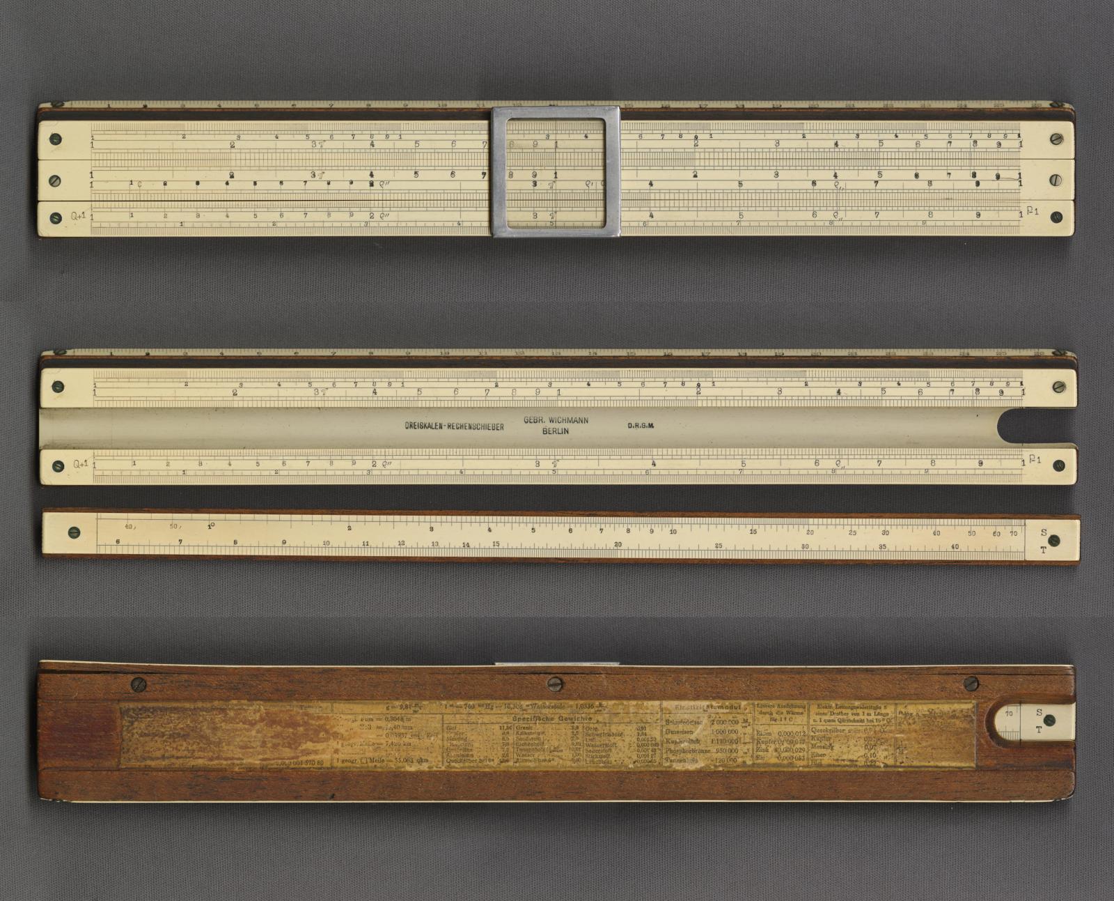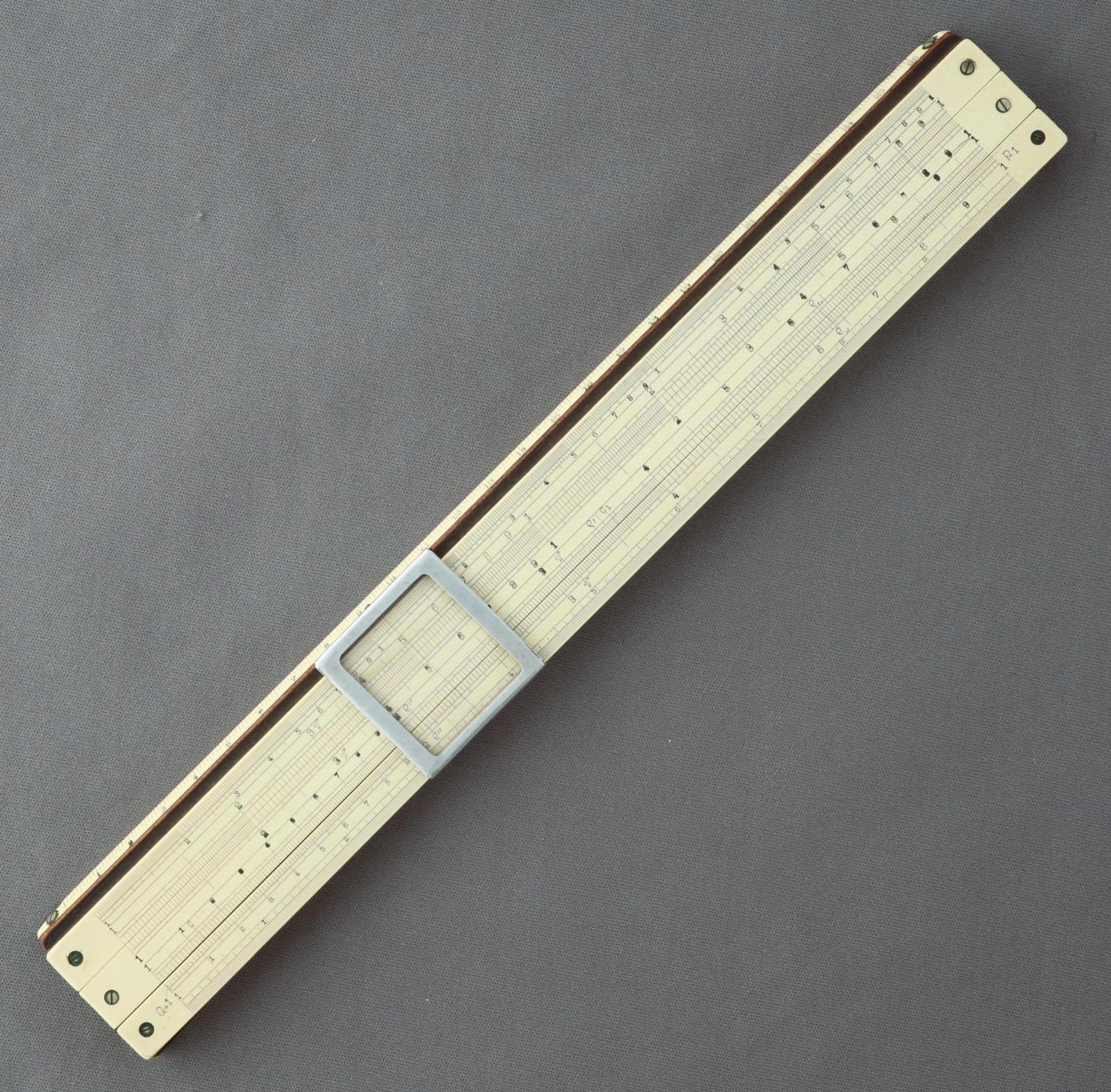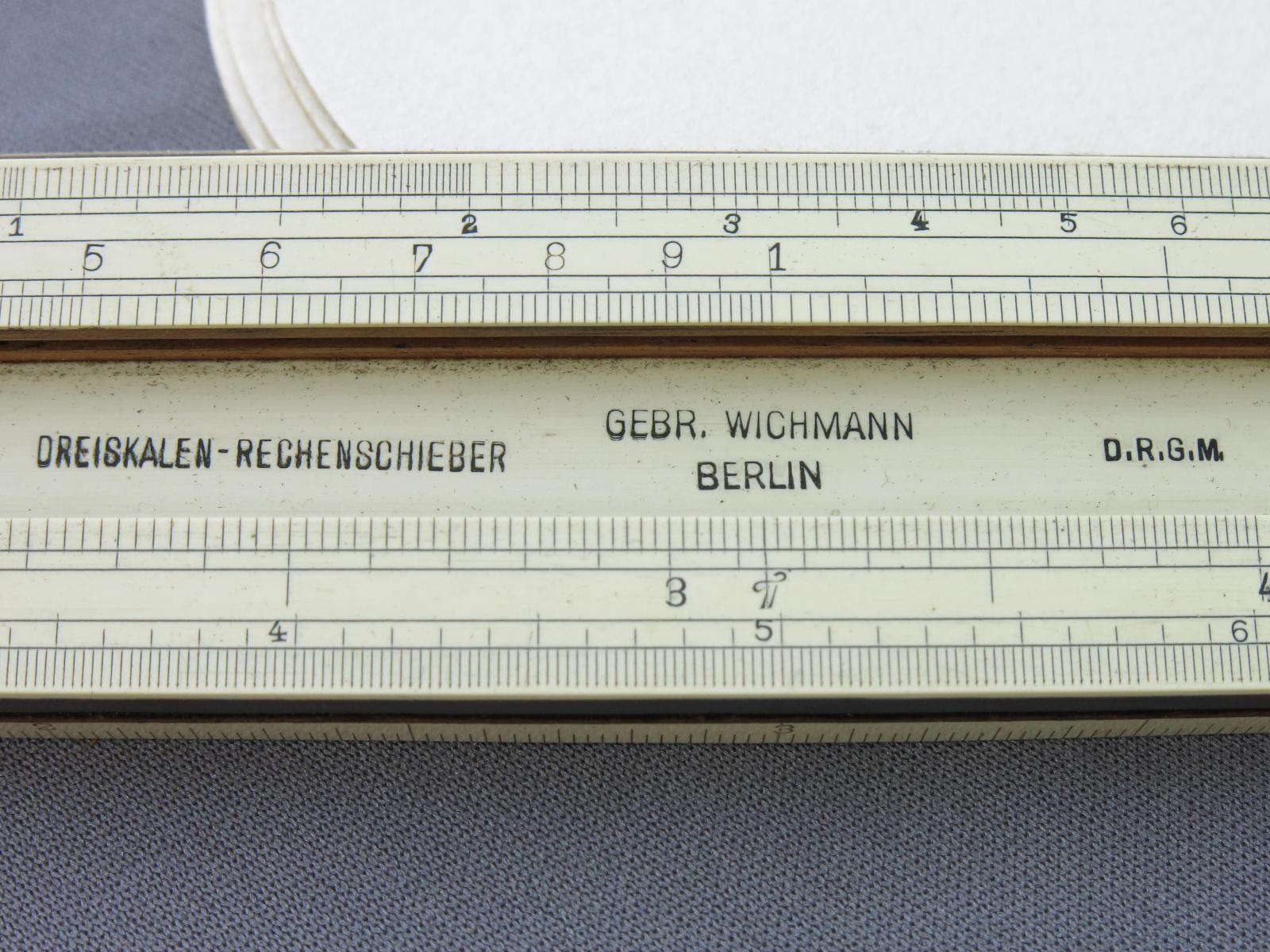 Notes: "Gebruder Wichmann only sold other company’s products. This slide rule is almost a Rietz slide rule, except no CI scale. It has interesting trig scales on the back of the slide, with the S scale is on the top and the T scale is on the bottom. Each of the trig scales is referenced to the scale it is next to: the S scale to the A scale and the T scale to the D scale. This allows the S scale to cover a range of angles that normally requires both an S and ST scale: 35 minutes of arc to 80 degrees. The tangent scale runs from 5.7 degrees to 45 degrees, but for small angles you would just use the left half of the sine scale. "