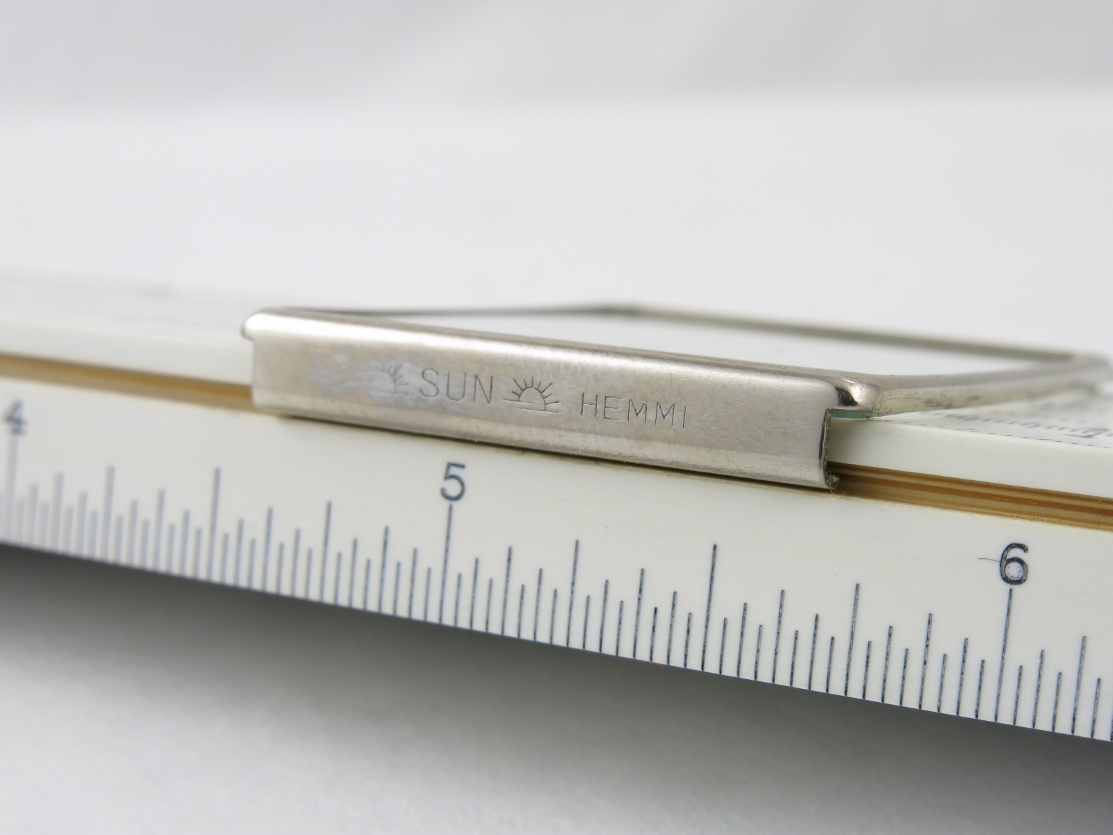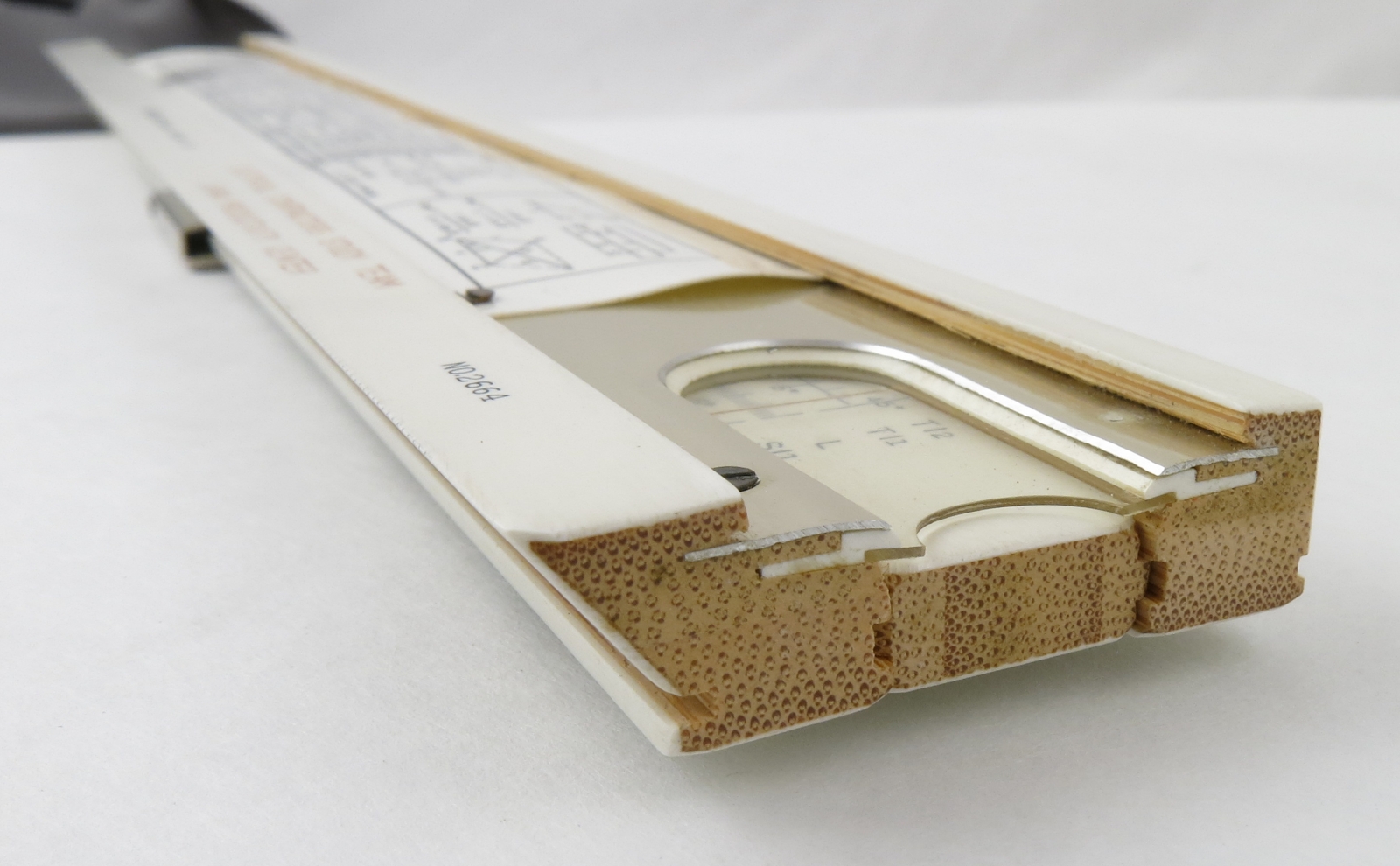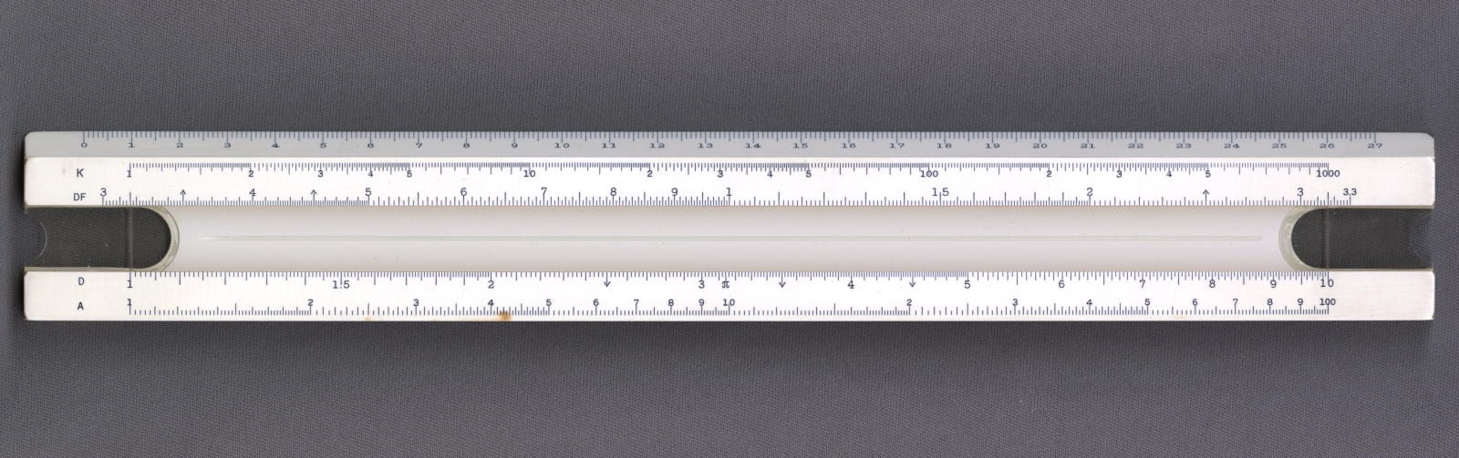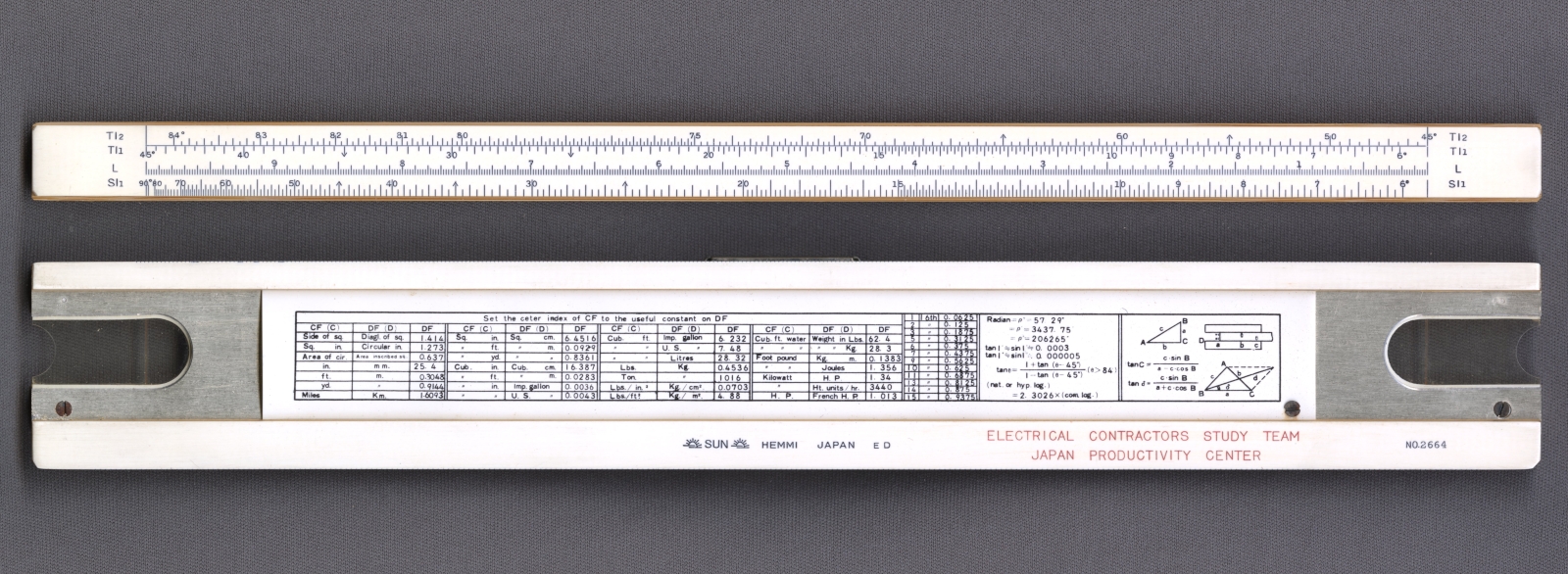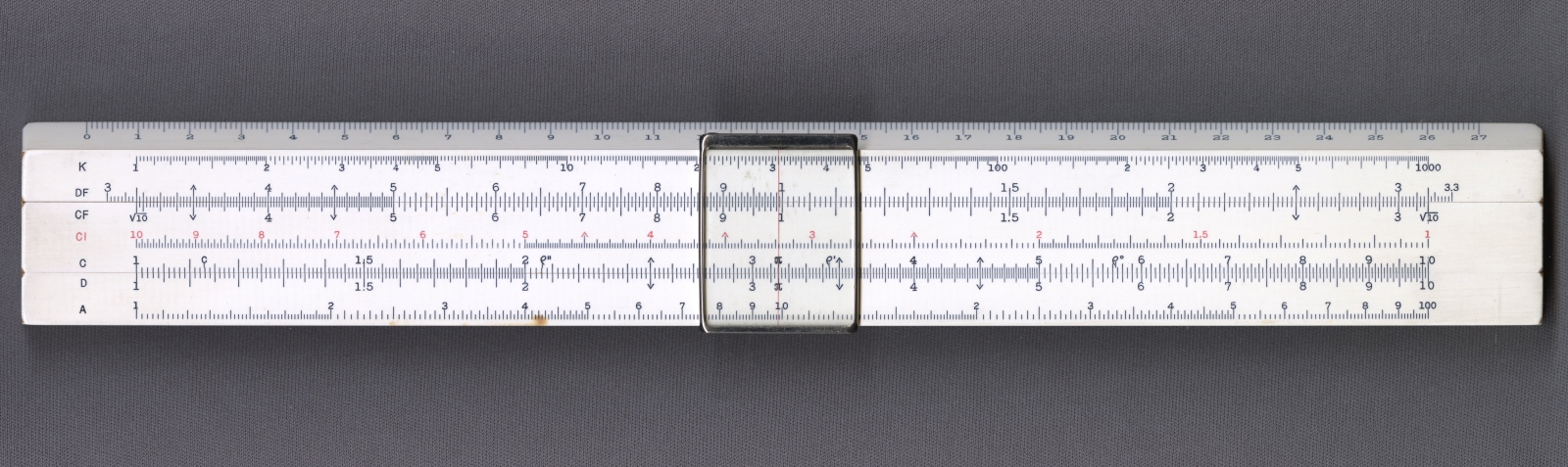 Notes: "The Hemmi Model 2664 is an ‘enhanced Mannheim’ type slide rule, with many additional scales, but it deviates from the Mannheim pattern by deleting the B scale, moving the A scale to the bottom of the lower stator, and including CF and DF scales. The C & D scales had long since replaced the A & B scales as the primary scales used for multiplication and division, and the CF and DF scales retained the “can’t run off the end” property of the A & B scales but with the advantage of full-length precision"