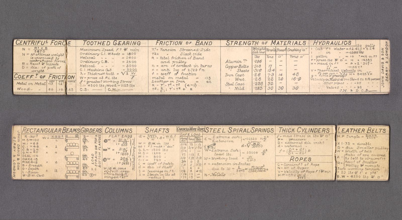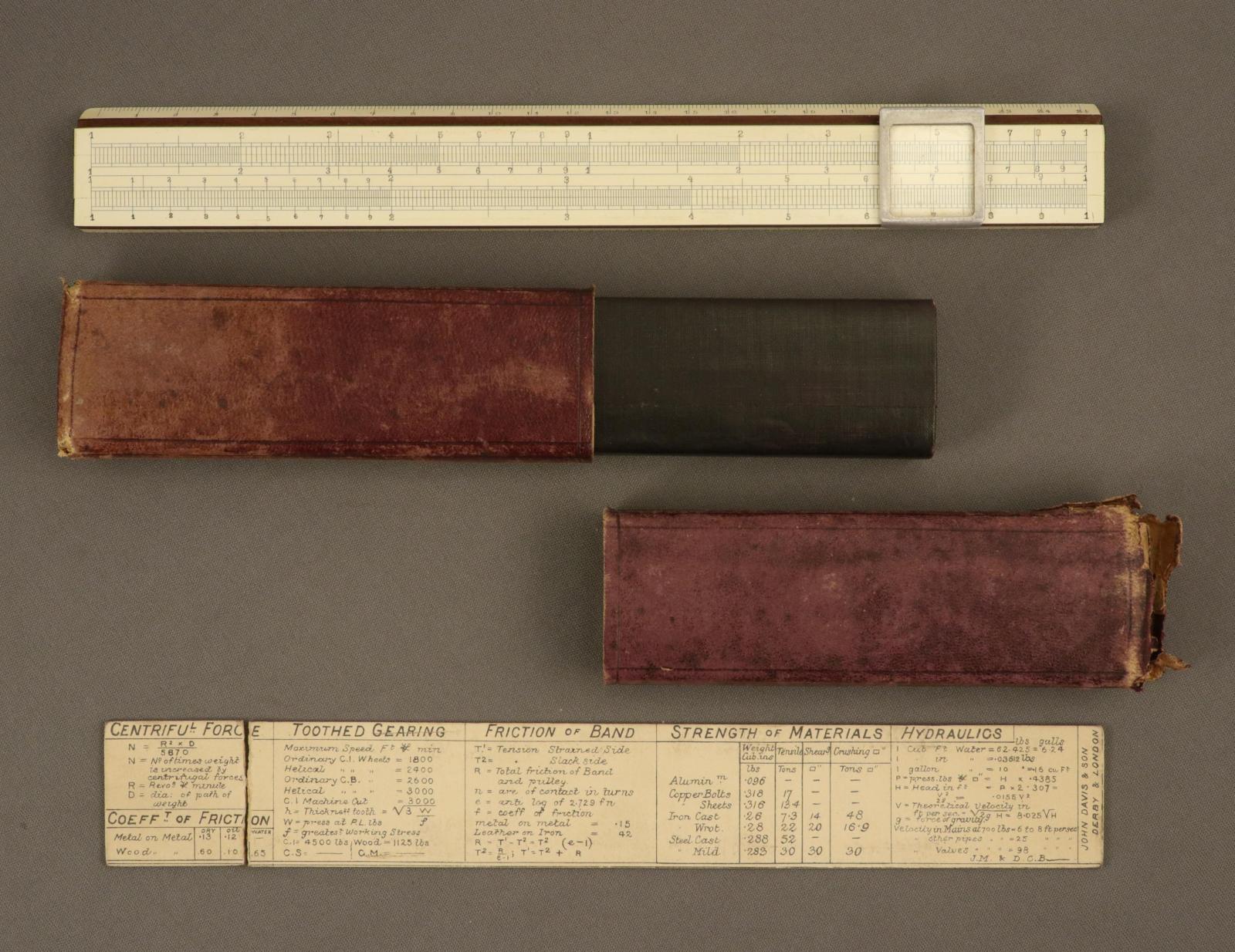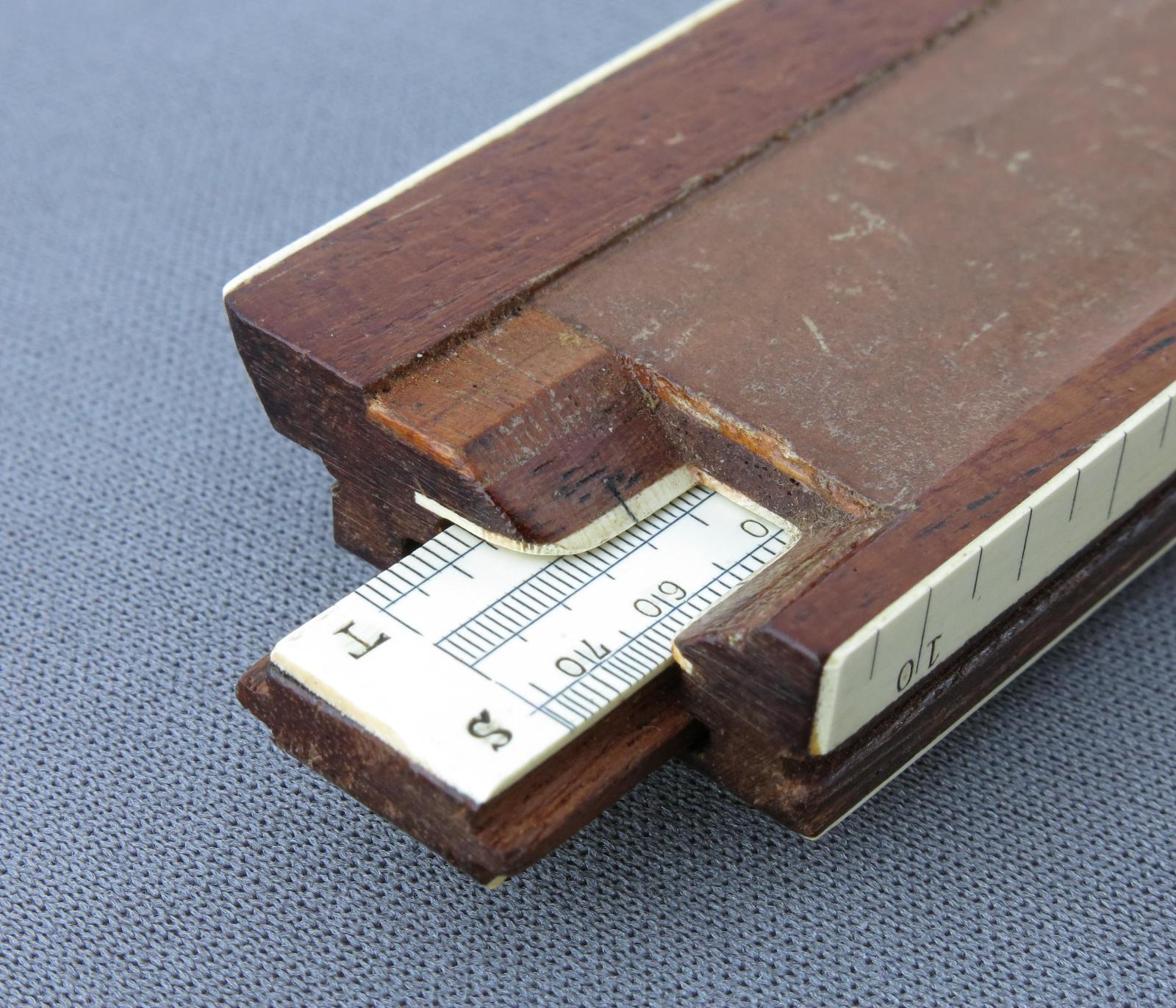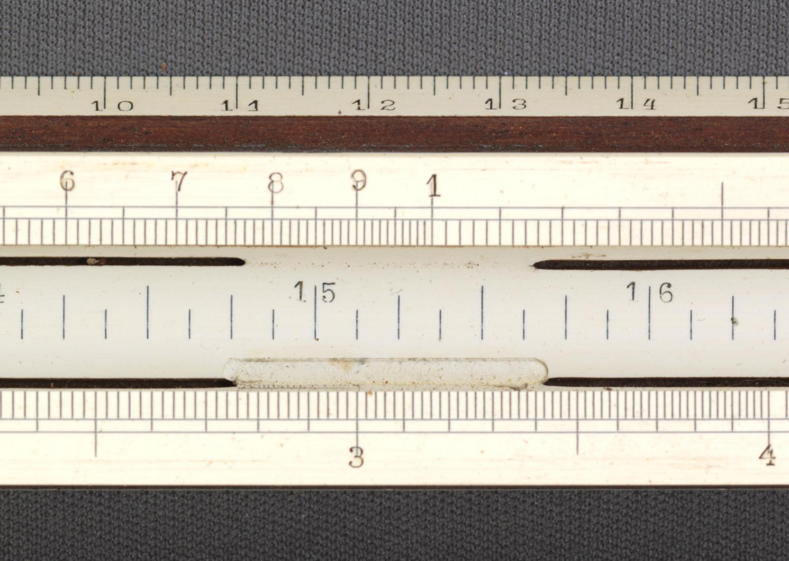 Notes: "This Davis slide rule is a standard Mannheim model with A, B, C, and D scales on the front, and S, L, and T scales on the back of the slide. The only gauge marks on the scales are Pi on the left side of the A & B scales, and Pi/4 on the right side, for finding the area of a circle. There is a ruler divided in centimeters and millimeters on the upper, beveled edge, and an inch ruler on the lower, vertical edge. "