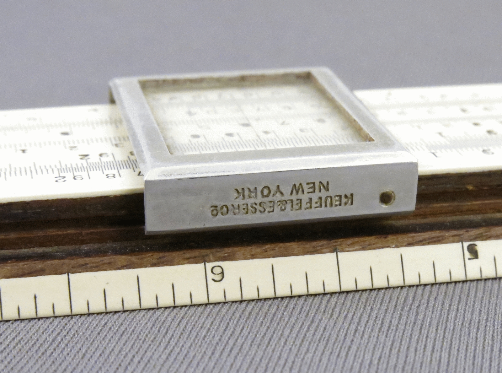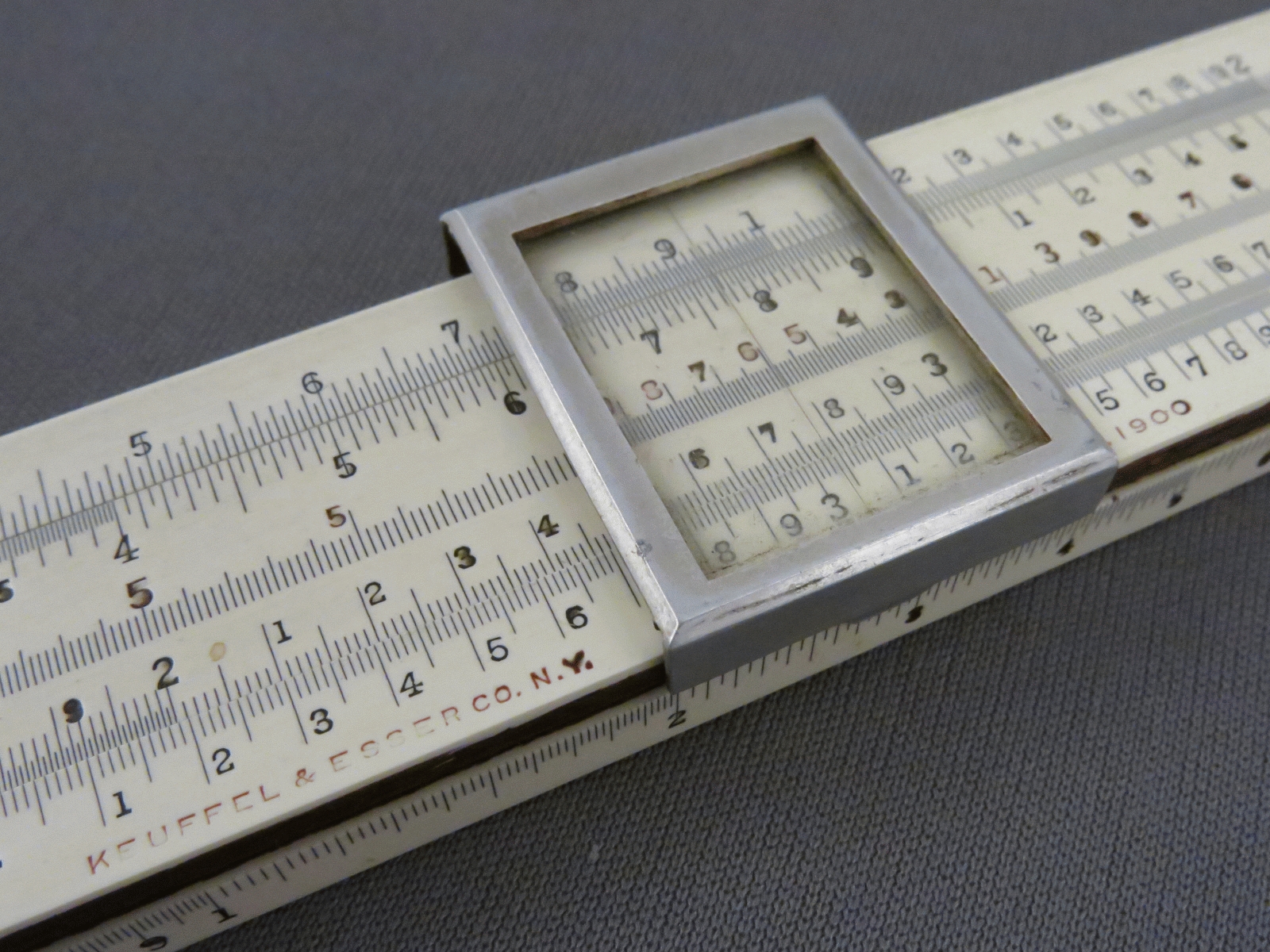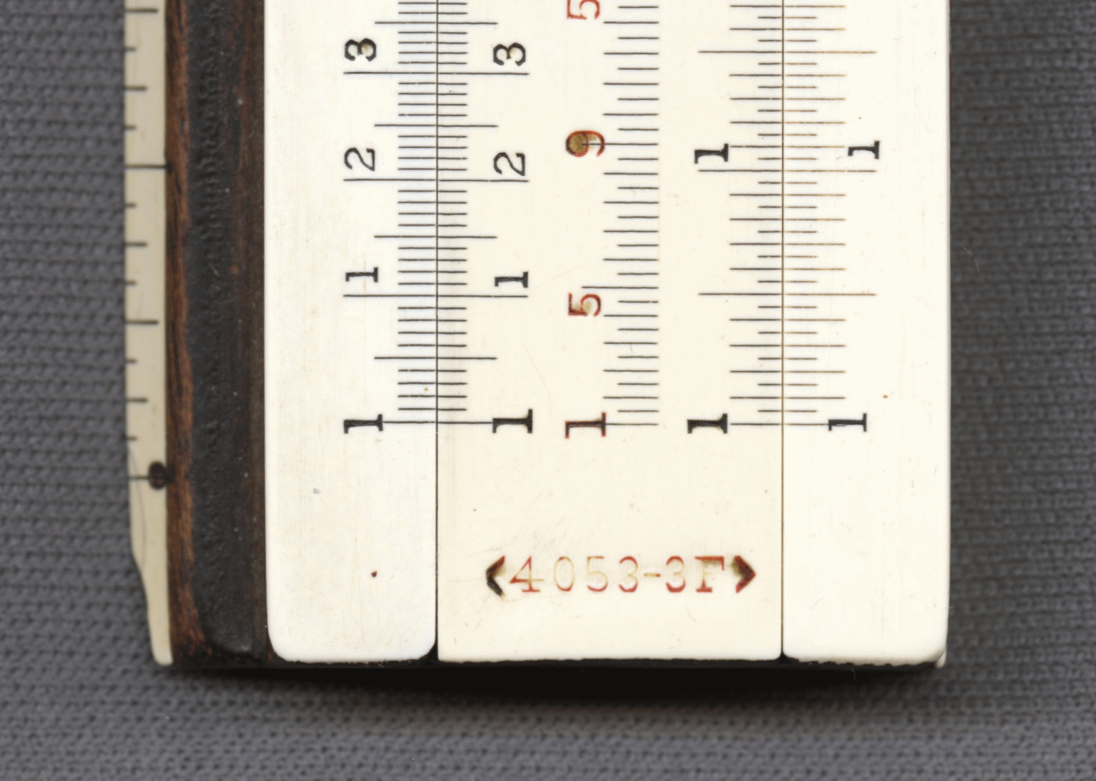 Notes: "The model 4053 Mannheim slide rule, or Polyphase Slide Rule as K&E called it, was in production from 1909 until 1972, was available in 5”, 8”, 10”, and 20” lengths, and along the way went through many changes, major and minor, in construction, scale layout, and markings. Those changes make determining the date range for this slide rule fairly easy. The K scale being on the lower edge broadly sets the date range to 1909 to 1921. The use of the “-3” length designation (indicating a 10” slide rule) in the model number started in 1911, and the metal framed cursor ended in 1915, so this slide rule was made between 1911 and 1915. This 4053 is the scarce “finely divided” version (the “F” in the model number), which has all the divisions of a 20” slide rule on a 10” slide rule. "