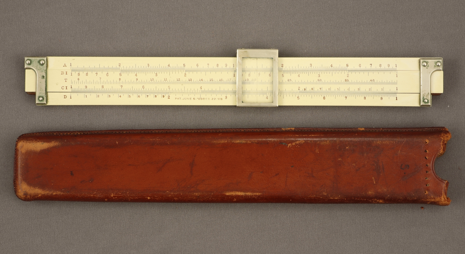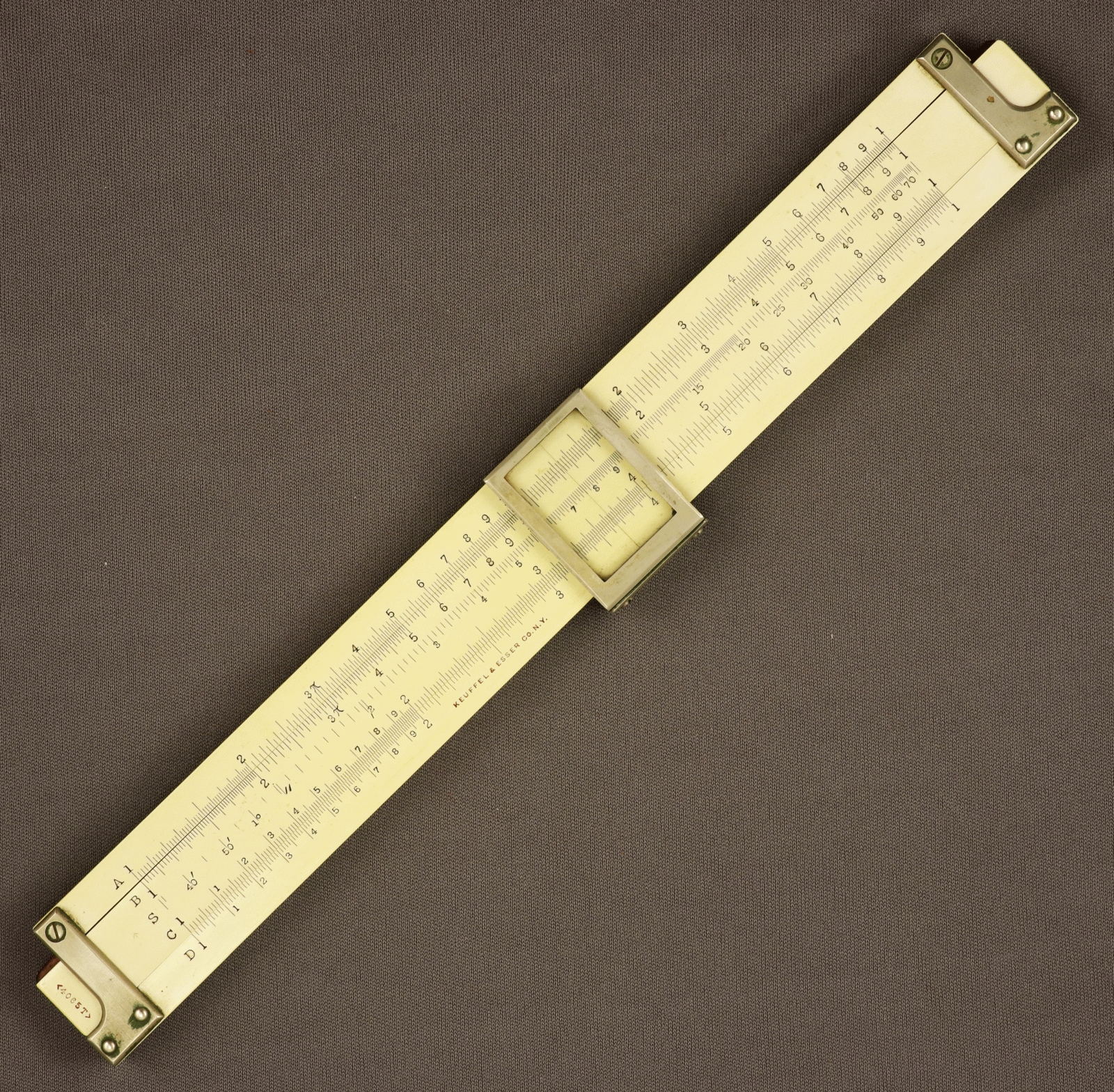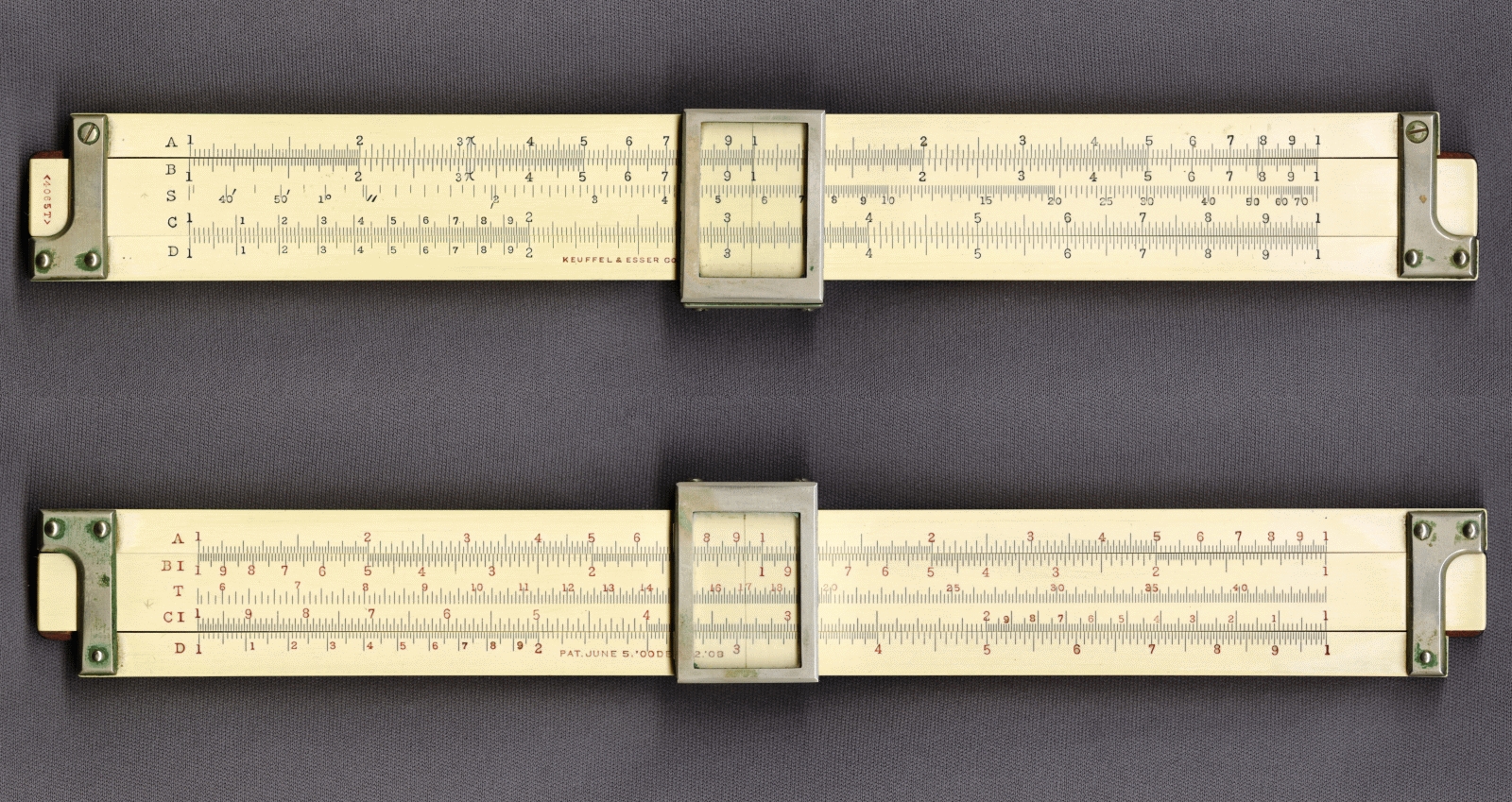 Notes: "The K&E 4065T is an 8-inch duplex slide rule, and added S, T, and L scales to the model 4065, which was made concurrently. The 4065 was an 8-inch version of the 10-inch 4071, which was the 1909+ continuation of the original Cox Duplex slide rule. The 8-inch models 4065 and 4065T were introduced in 1909, the 4065 model number having previously been used for a 5-inch slide rule. The date for this slide rule is 1910 to 1913, with the L-shaped end braces and the clamshell cursor putting the lower and upper limits on that range respectively. "