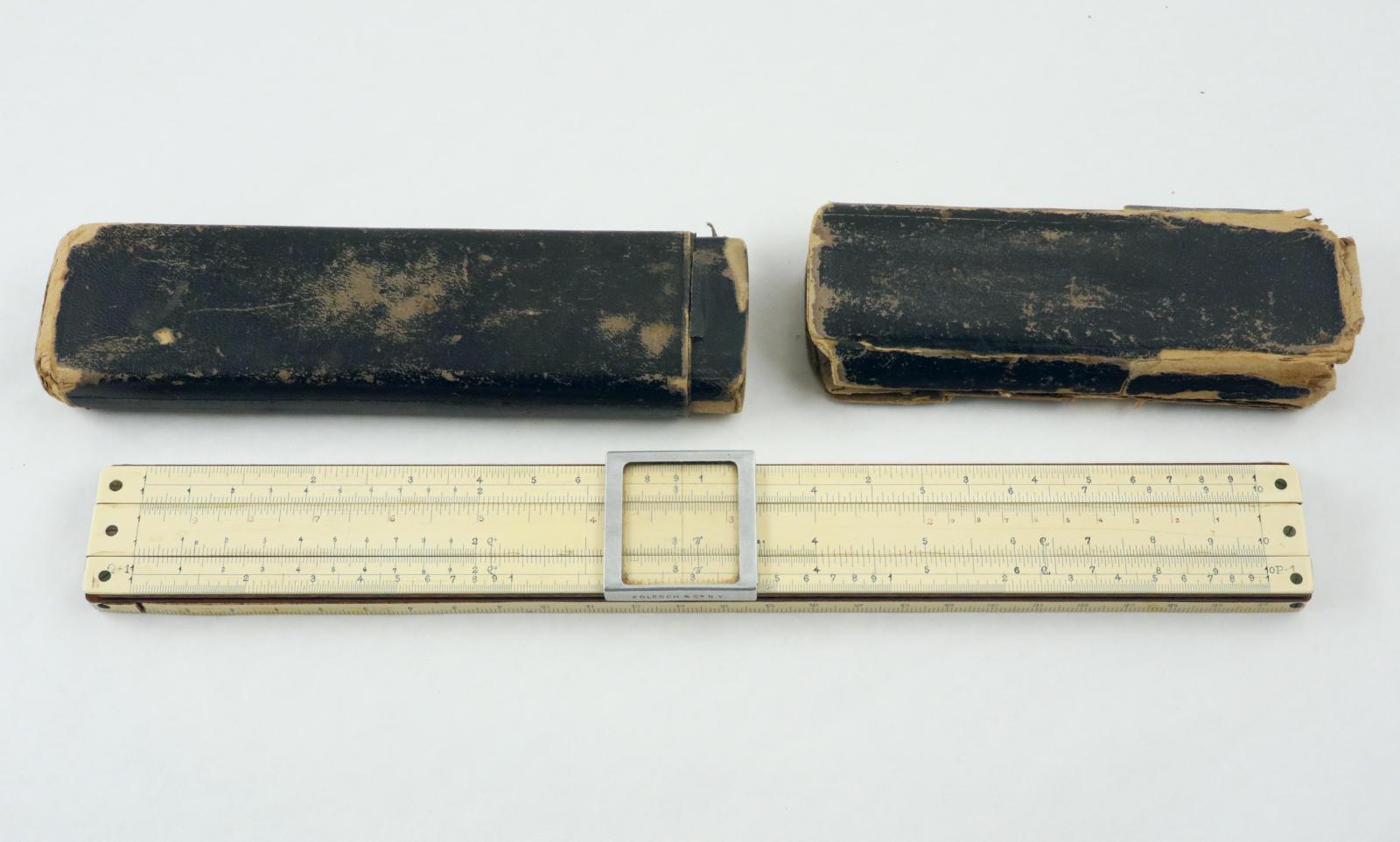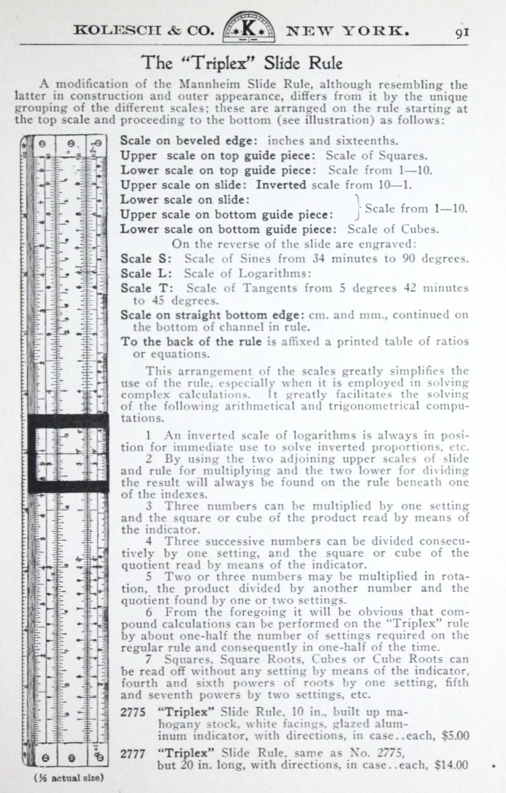 Notes: "The Kolesch Triplex slide rule has the following scales, A, D | CI, C |D, K, with S, L, and T on the back of the slide. Two D scales and no B scale. This odd scale arrangement is to simplify and speed up chain multiplications, such as A x B x C, similar to the Dietzgen Phillips slide rule. The Kolesch catalog page describing this slide rule, from their 11th edition catalog (1917), is included in the pictures. Kolesch was a company similar to Post, Dietzgen, J. H. Weil, and to some extent K&E, in that they sold mostly (possibly entirely) engineering supplies manufactured by other companies. This slide rule was made for Kolesch by Nestler, in Germany."