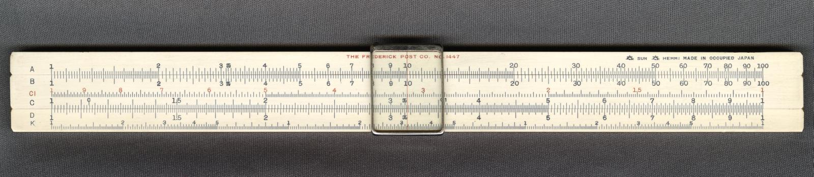 Notes: "This Post / Hemmi slide rule, model 1447, is of what I call the enhanced Mannheim pattern, with the addition of trig scales, plus K, L, and CI scales to the basic A, B, C, D of the Mannheim rule. The most interesting thing about this particular 1447 is that it is marked on both the body and cursor as “made in occupied Japan”, which dates it to the late 1940’s."