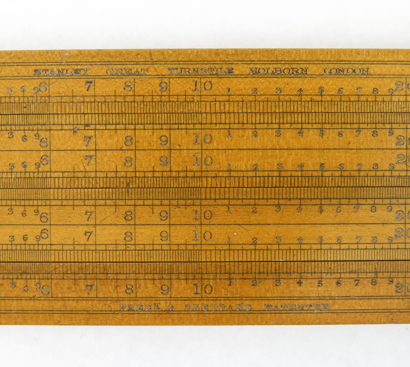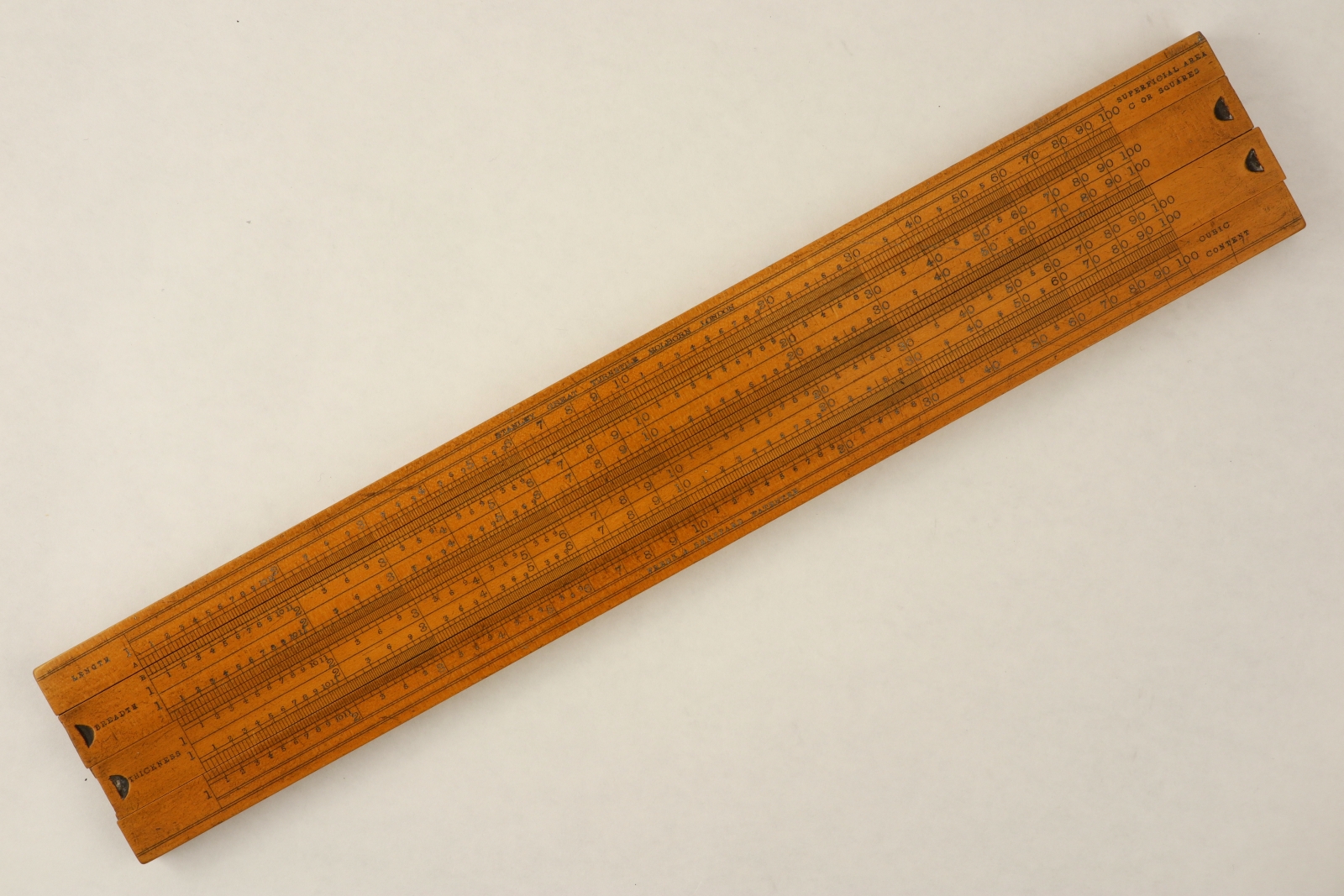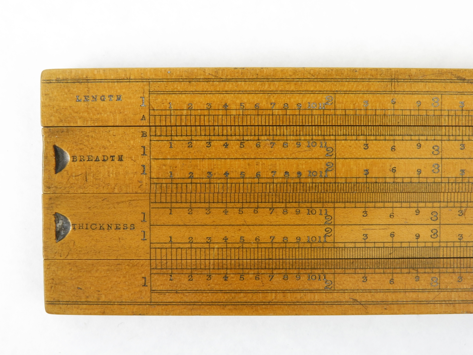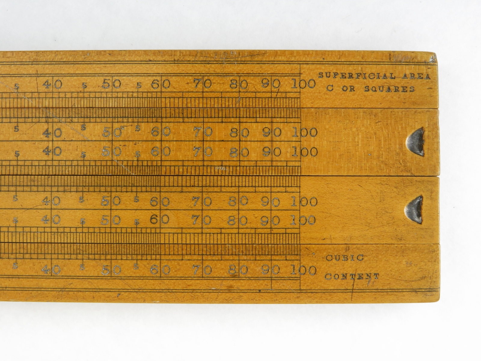 Notes: "The Sheppard slide rule was patented by F. H. Sheppard in 1878 and designed to calculate area and volume in either feet and inches, or in decimal feet. The scale layout at first appears very simple: three pairs of what we would now call A and B scales: 2-cycle logarithmic scales. However, the left side of each scale is divided duodecimally (into 12ths) and the right side is conventionally divided into 10ths. The Sheppard is effectively two slide rules mounted on top of each other, with the top slide rule solving for area, and the bottom slide rule using the result of that calculation as the starting point for calculating volume. No cursor was provided and none is needed as all calculations are between adjacent scales. Problems of volume are solved top to bottom, multiplying length times breadth times thickness, and reading the answer on the bottom scale. There are no markings on the backs of the slides, under the slides, or on the back of the slide rule body. W. F. Stanley carried the Sheppard “Cubing Slide Rule” in their catalog until at least 1930, and described it as, “Cubing Slide Rule, Shepard’s, with two slides, giving at sight square or cubic contents in feet and inches up to 100 cubic feet, specially designed for quantity surveyors, timber merchants, etc., with instructions for use.” It was available in both 12-inch and 22-inch versions. This is the 12-inch version, which actually measures 13.25 inches long. The slide rule is quite thick, 0.45”, and the body is made from a single piece of boxwood rather than a back plate with separate pieces for the stators glued down. There are numbers stamped on one end, presumably for keeping the body and stators for each individual slide rule together during production."