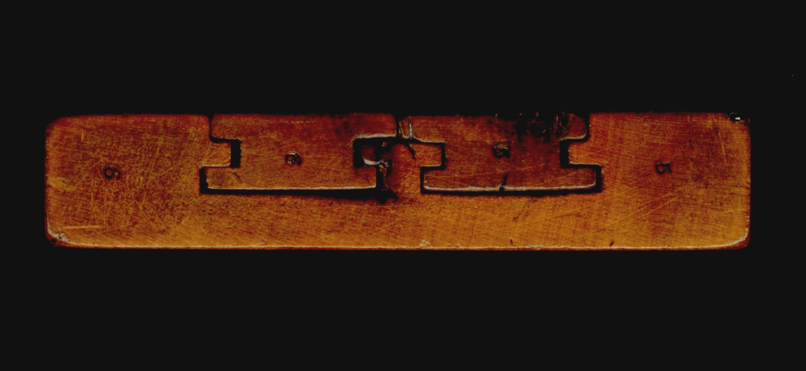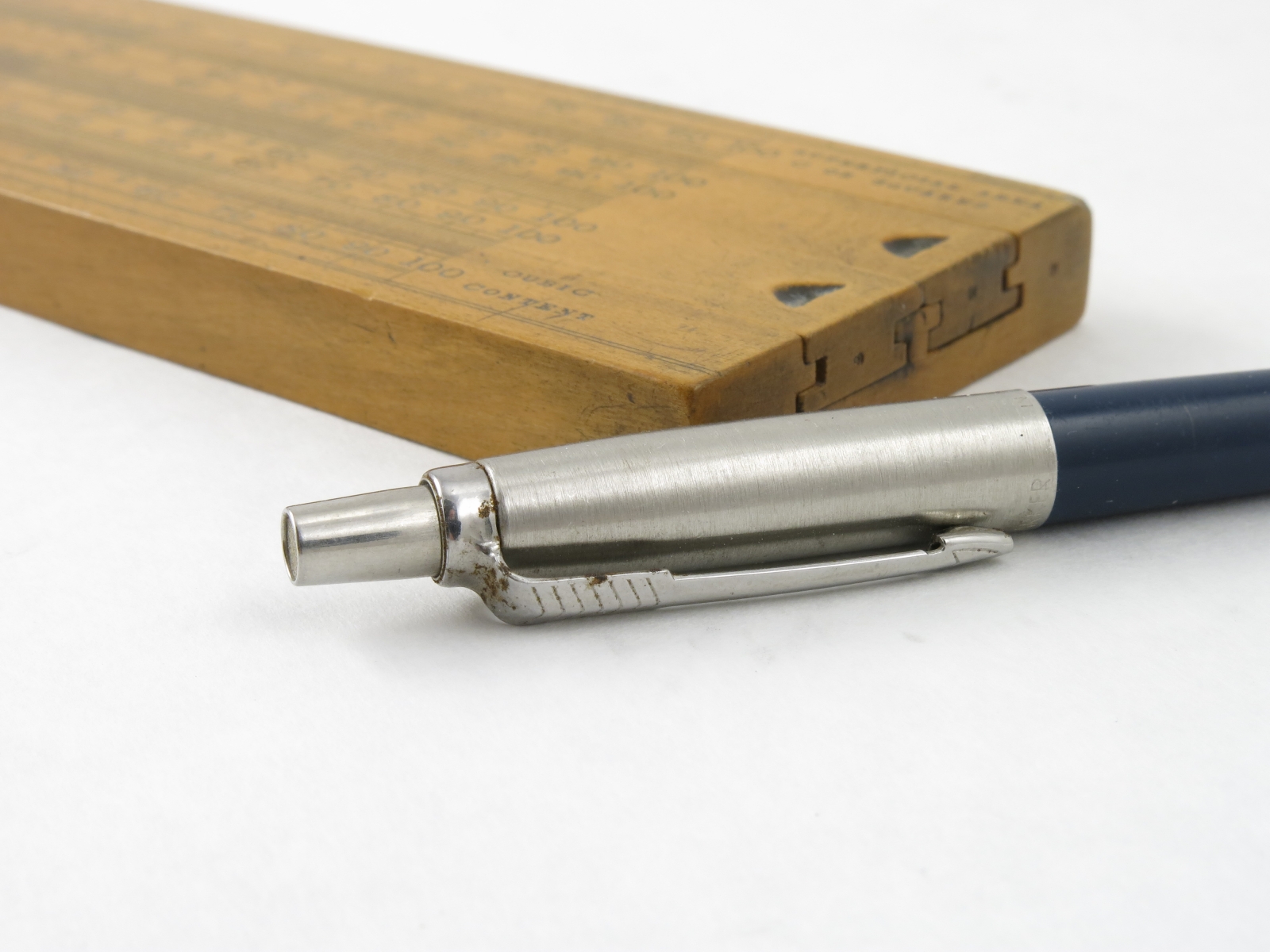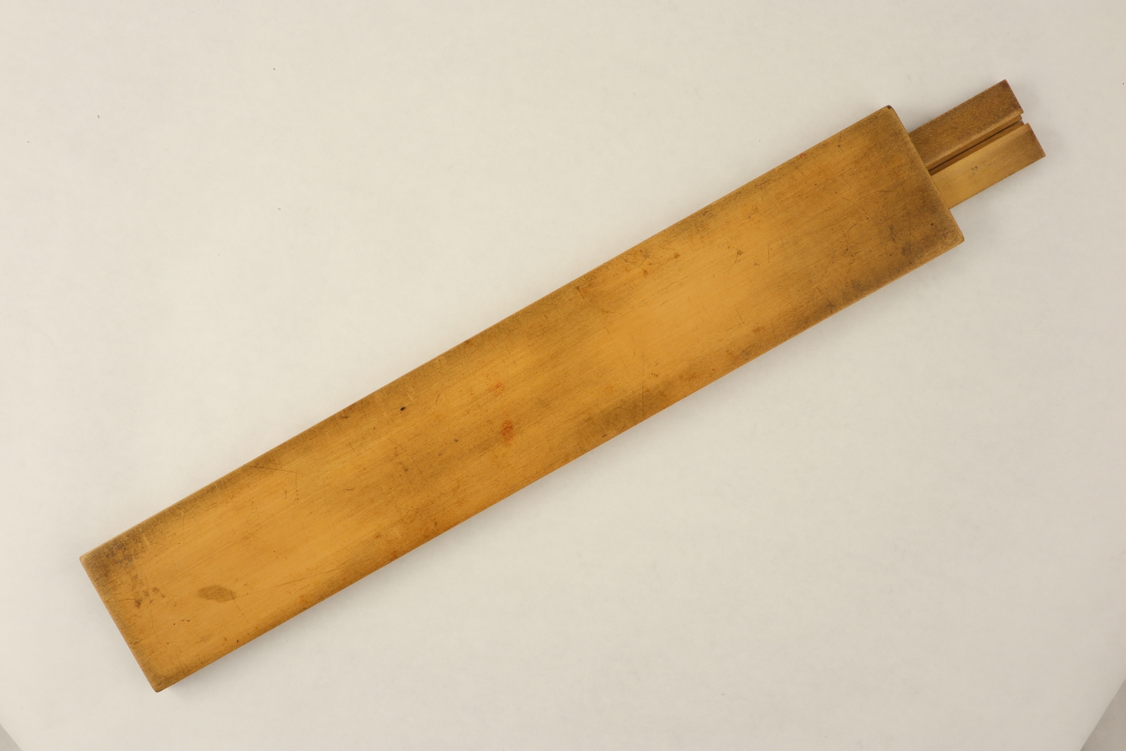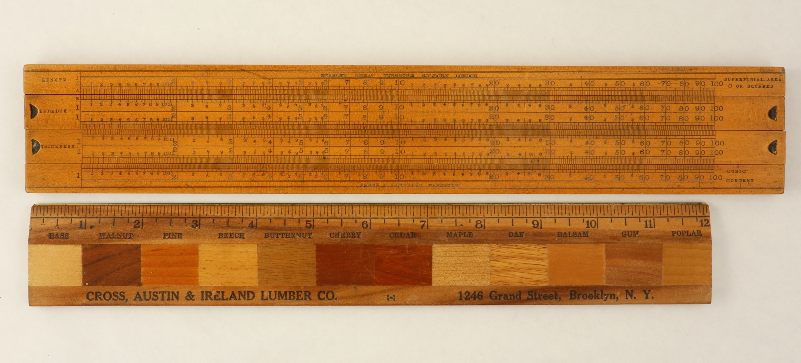 Notes: "The Sheppard slide rule was patented by F. H. Sheppard in 1878 and designed to calculate area and volume in either feet and inches, or in decimal feet. The scale layout at first appears very simple: three pairs of what we would now call A and B scales: 2-cycle logarithmic scales. However, the left side of each scale is divided duodecimally (into 12ths) and the right side is conventionally divided into 10ths. The Sheppard is effectively two slide rules mounted on top of each other, with the top slide rule solving for area, and the bottom slide rule using the result of that calculation as the starting point for calculating volume. No cursor was provided and none is needed as all calculations are between adjacent scales. Problems of volume are solved top to bottom, multiplying length times breadth times thickness, and reading the answer on the bottom scale. There are no markings on the backs of the slides, under the slides, or on the back of the slide rule body. W. F. Stanley carried the Sheppard “Cubing Slide Rule” in their catalog until at least 1930, and described it as, “Cubing Slide Rule, Shepard’s, with two slides, giving at sight square or cubic contents in feet and inches up to 100 cubic feet, specially designed for quantity surveyors, timber merchants, etc., with instructions for use.” It was available in both 12-inch and 22-inch versions. This is the 12-inch version, which actually measures 13.25 inches long. The slide rule is quite thick, 0.45”, and the body is made from a single piece of boxwood rather than a back plate with separate pieces for the stators glued down. There are numbers stamped on one end, presumably for keeping the body and stators for each individual slide rule together during production."