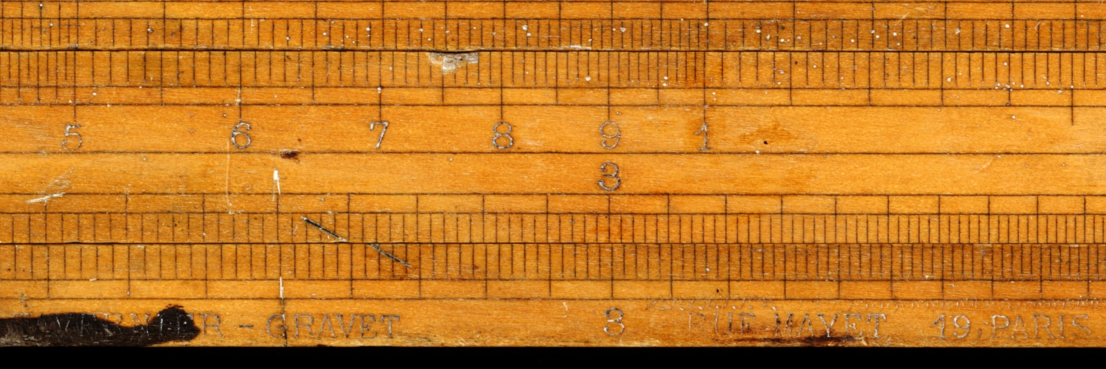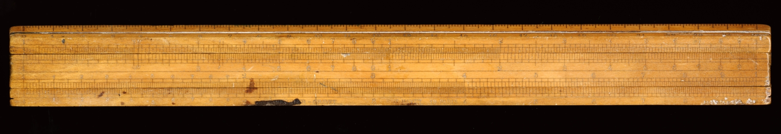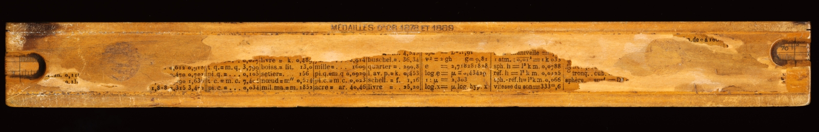 Notes: "The Mannheim style slide rule is considered the first “modern” slide rule. It borrowed heavily from the Soho slide rule design, but was the first widely used slide rule to require a cursor. Sadly, this one has lost its cursor somewhere along the way. This slide rule was made by Tavernier Gravet in France, which you can just barely make out, where it isn’t covered by the ink stains on the lower edge. The address is 19 Rue Mayet, Paris, which was the third of five addresses for T-G, and identifies this slide rule as being from 1881-1939. "