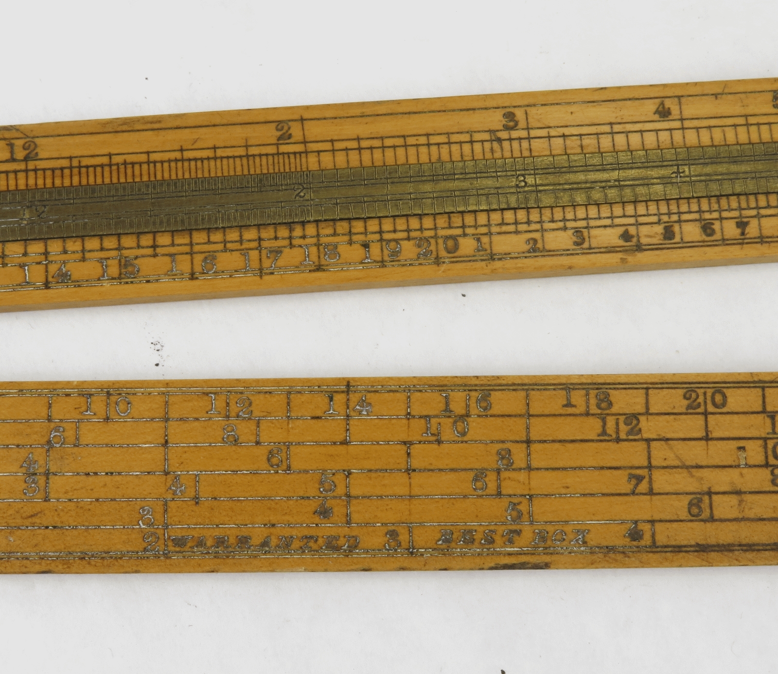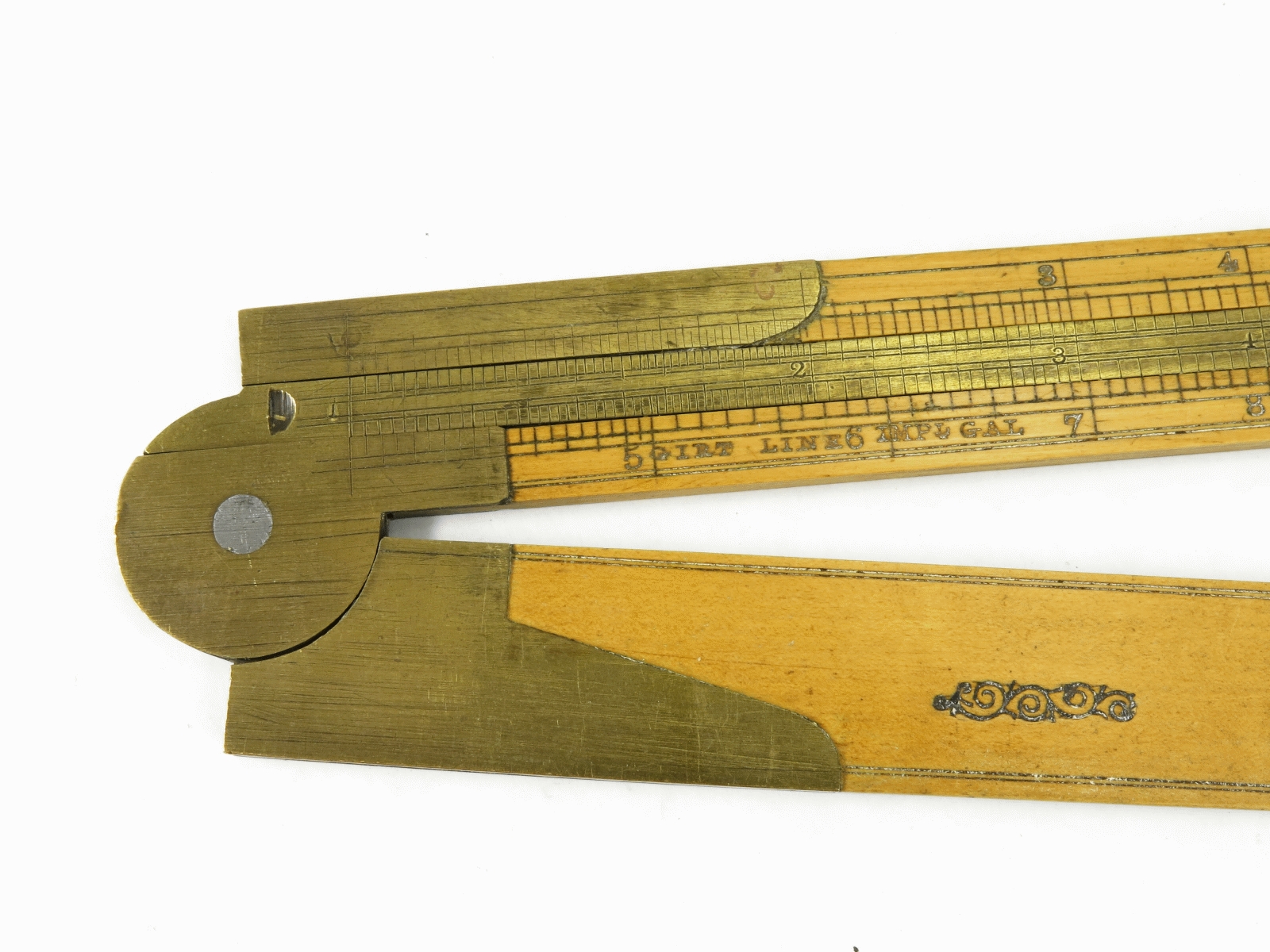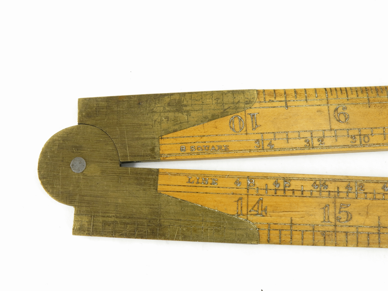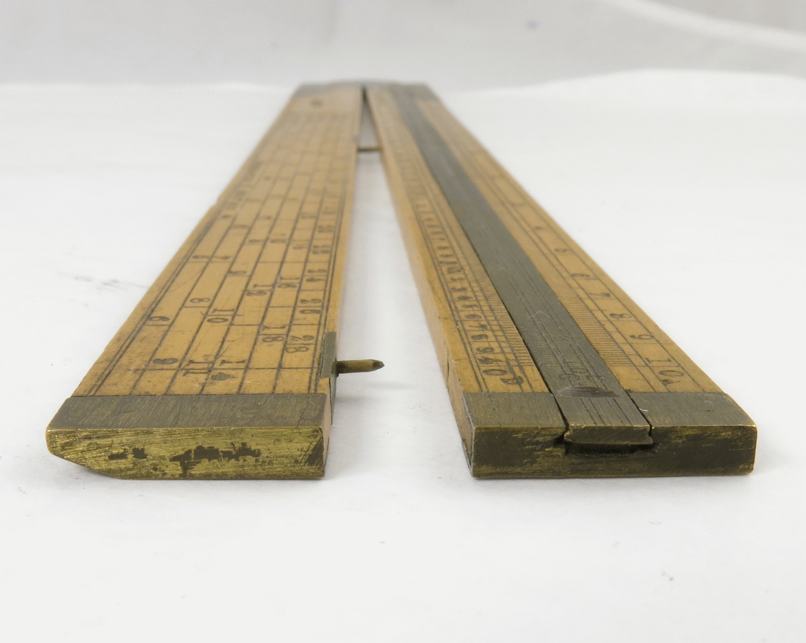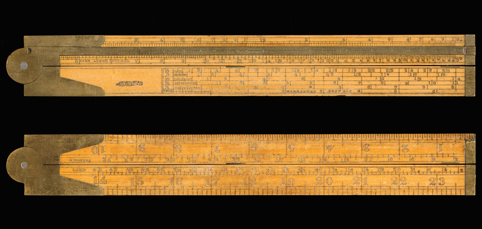 "Tunnel hinged with typical Coggeshall layout. The D Girt line = 4-4. On the reverse side, in addition to a 24 inch ruler, are 8 Square and Line scales used for laying out the cut lines for turning square or round timber octagonal. "