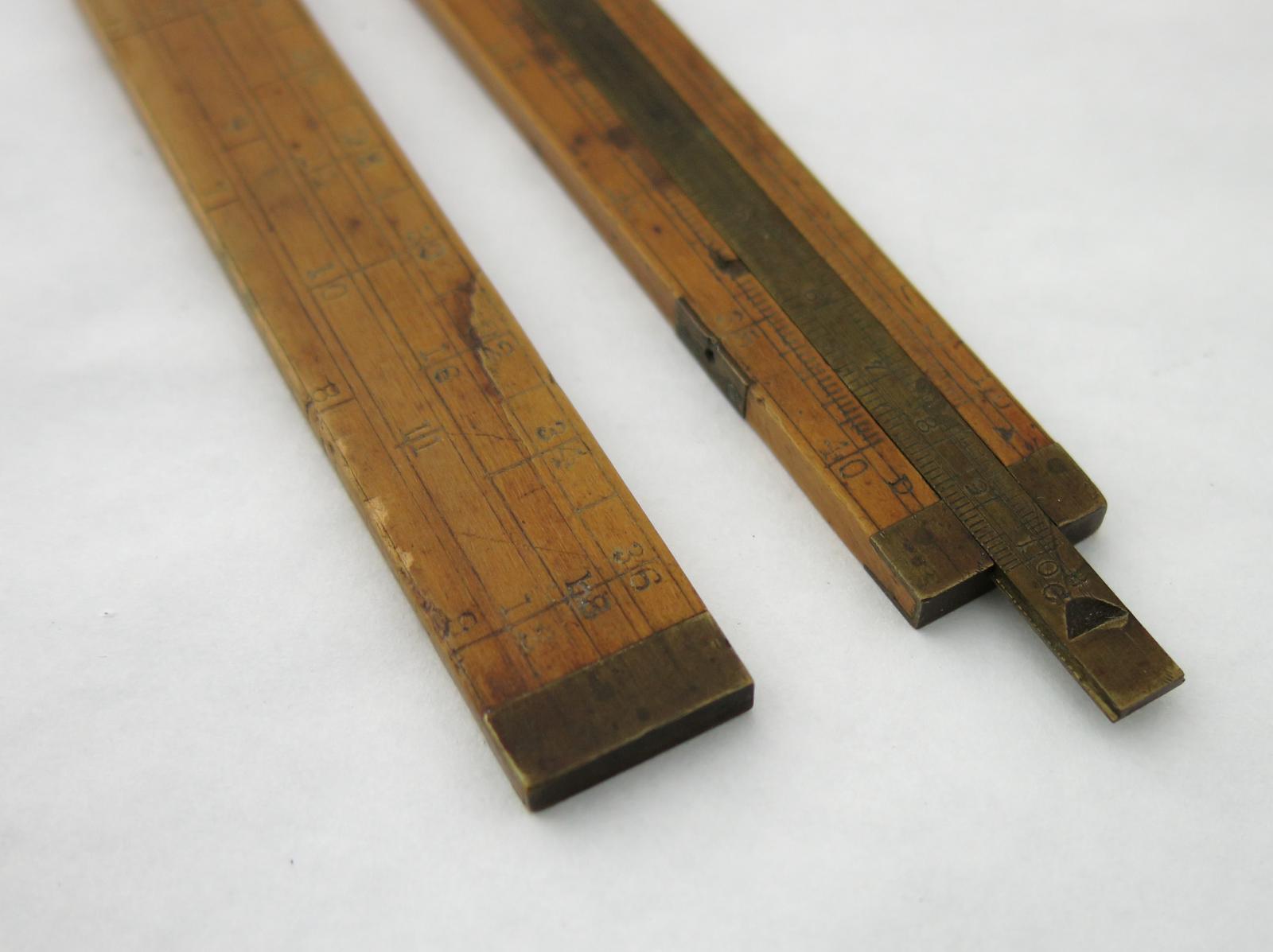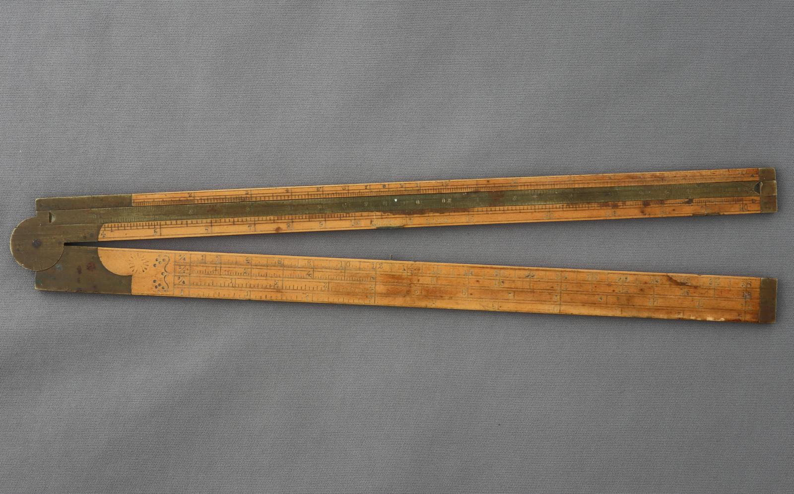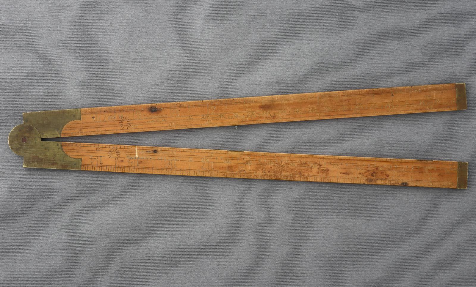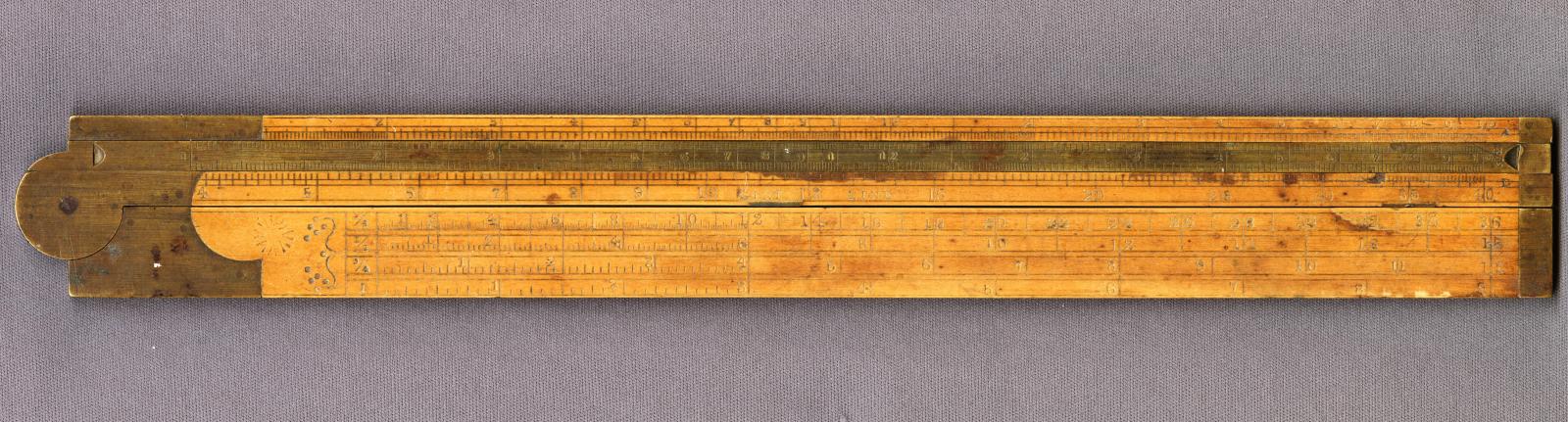 Notes: "Old Arched hinged with typical Coggeshall layout. The D Girt line = 4-4 + four-entry ¼ to INCH scale table on front. On the reverse side, in addition to a 24 inch ruler, are 8 Square and Line scales used for laying out the cut lines for turning square or round timber octagonal. "