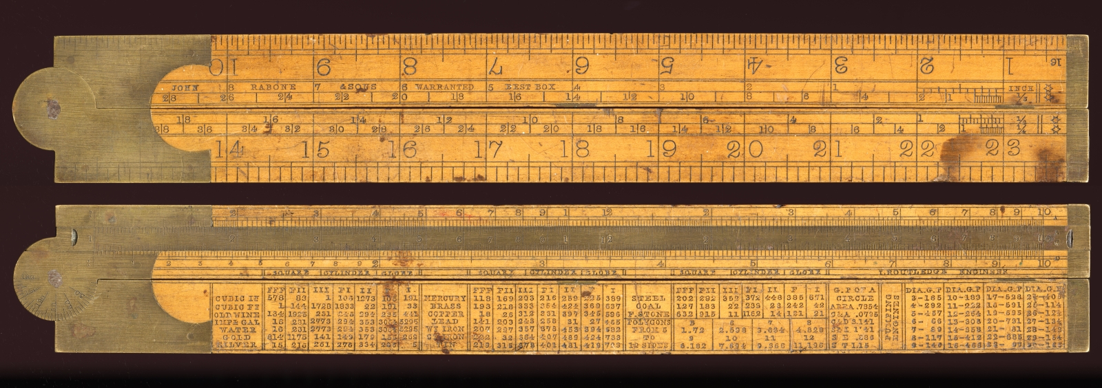 Notes: "Old Arched hinged design by Joshua Routledge. Although a type most often associated with steam engine engineers it is a design that works equally well for anyone dealing with metals, specifically finding the volume and weight of metal bars, rods and other regular shapes."