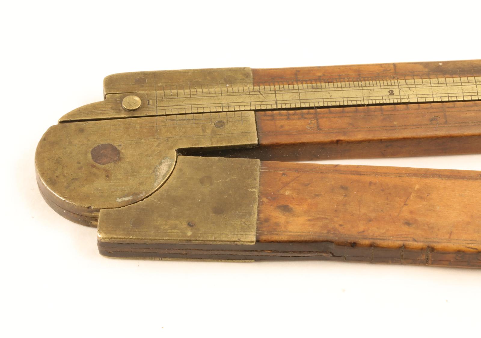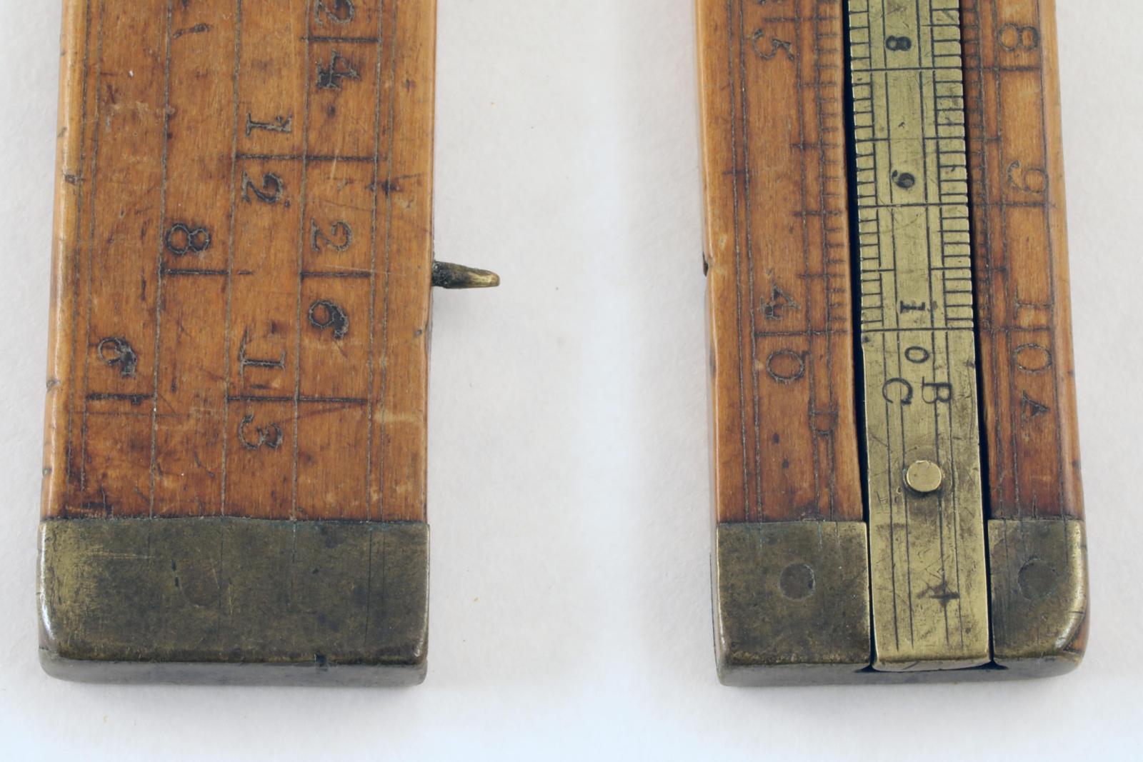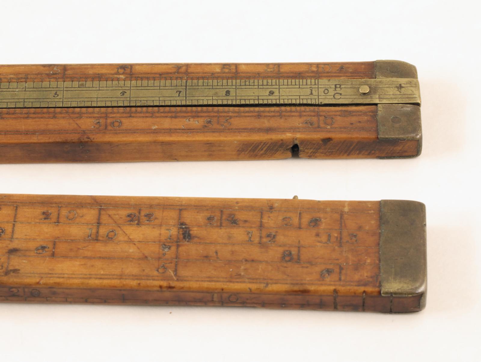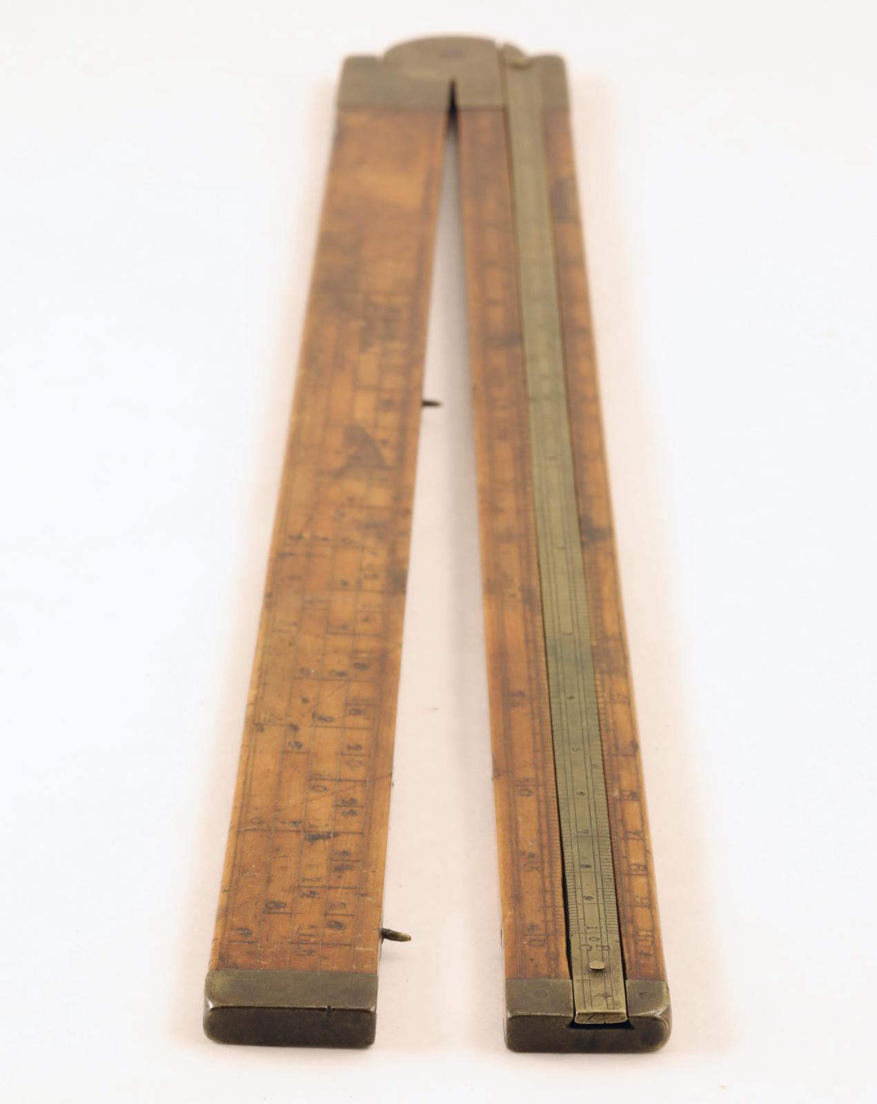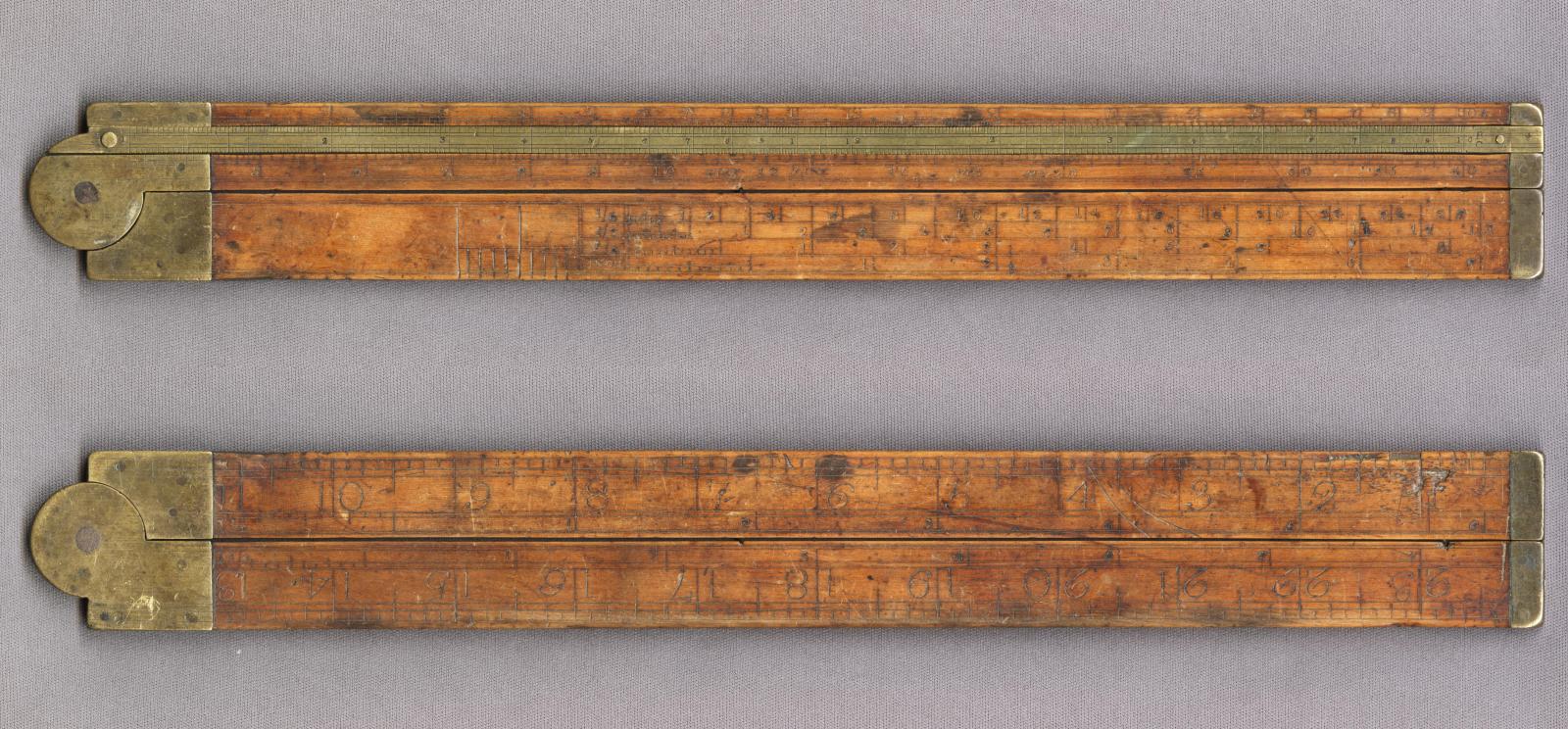 Notes: "Large Plate hinged with typical Coggeshall layout but an early chunkier model. The D Girt line = 4-4 + four-entry ¼ to INCH scale table on front. On the reverse side, in addition to a 24 inch ruler, are 8 Square and Line scales used for laying out the cut lines for turning square or round timber octagonal. "