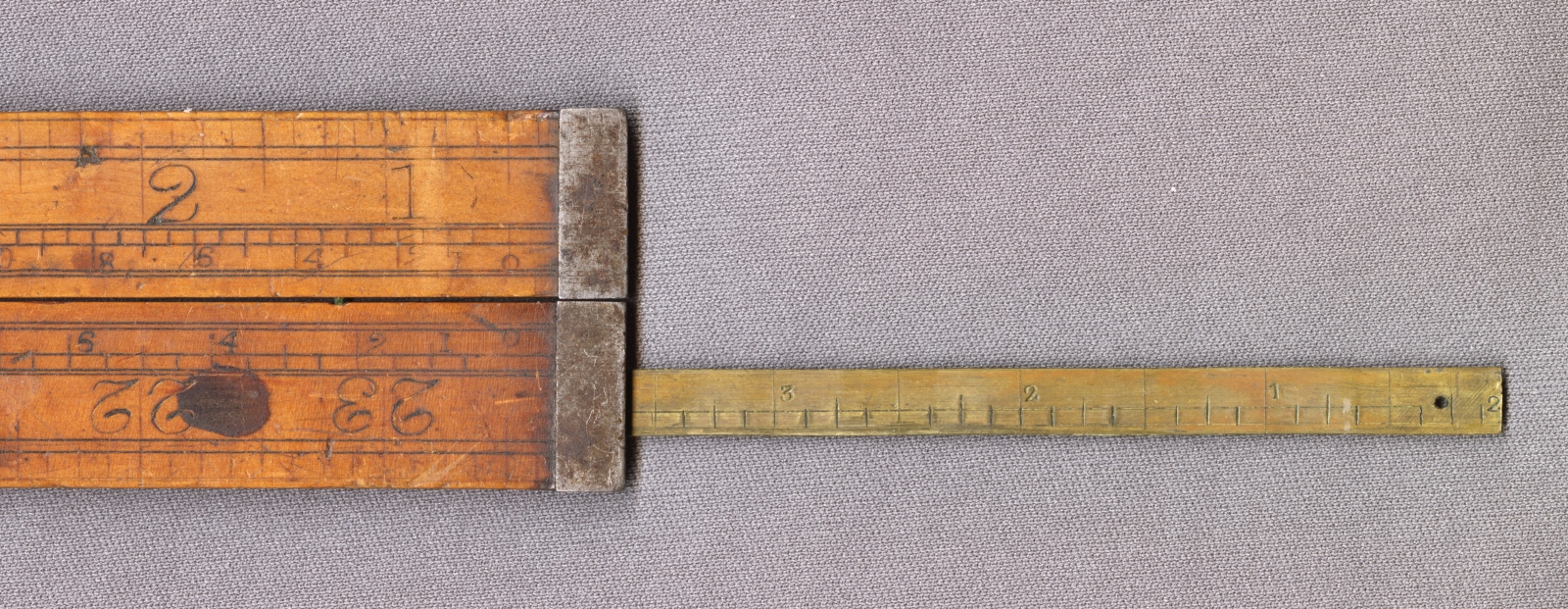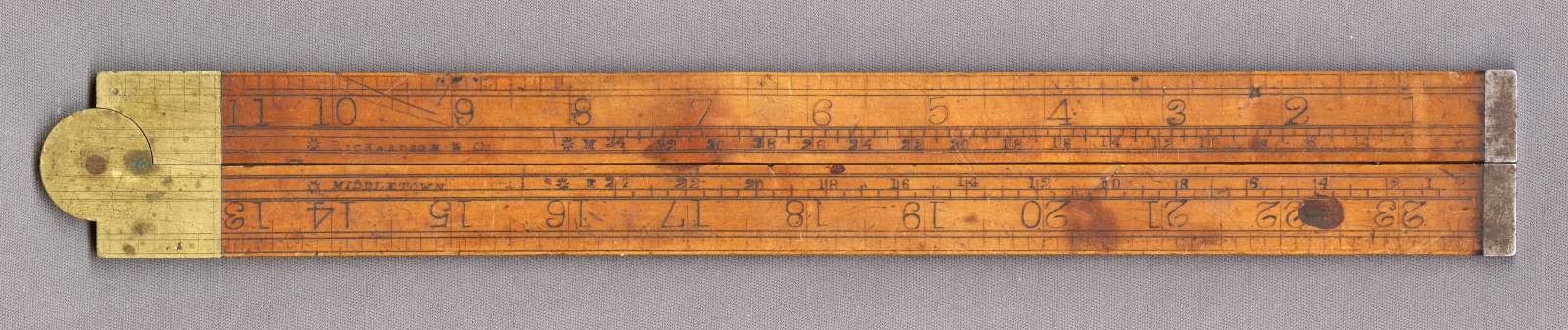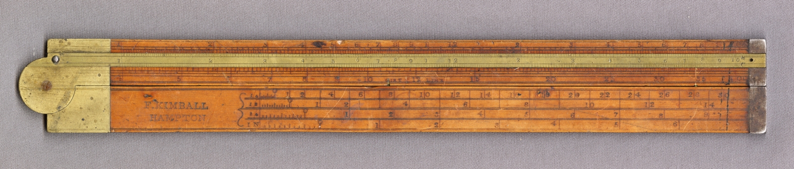Notes: "Large Plate hinged Coggeshall layout but post-1829 proportioning scales (useful in drafting). The D Girt line = 4-4. On the reverse side, in addition to a 24 inch ruler, are 8 Square and Line scales used for laying out the cut lines for turning square or round timber octagonal. "