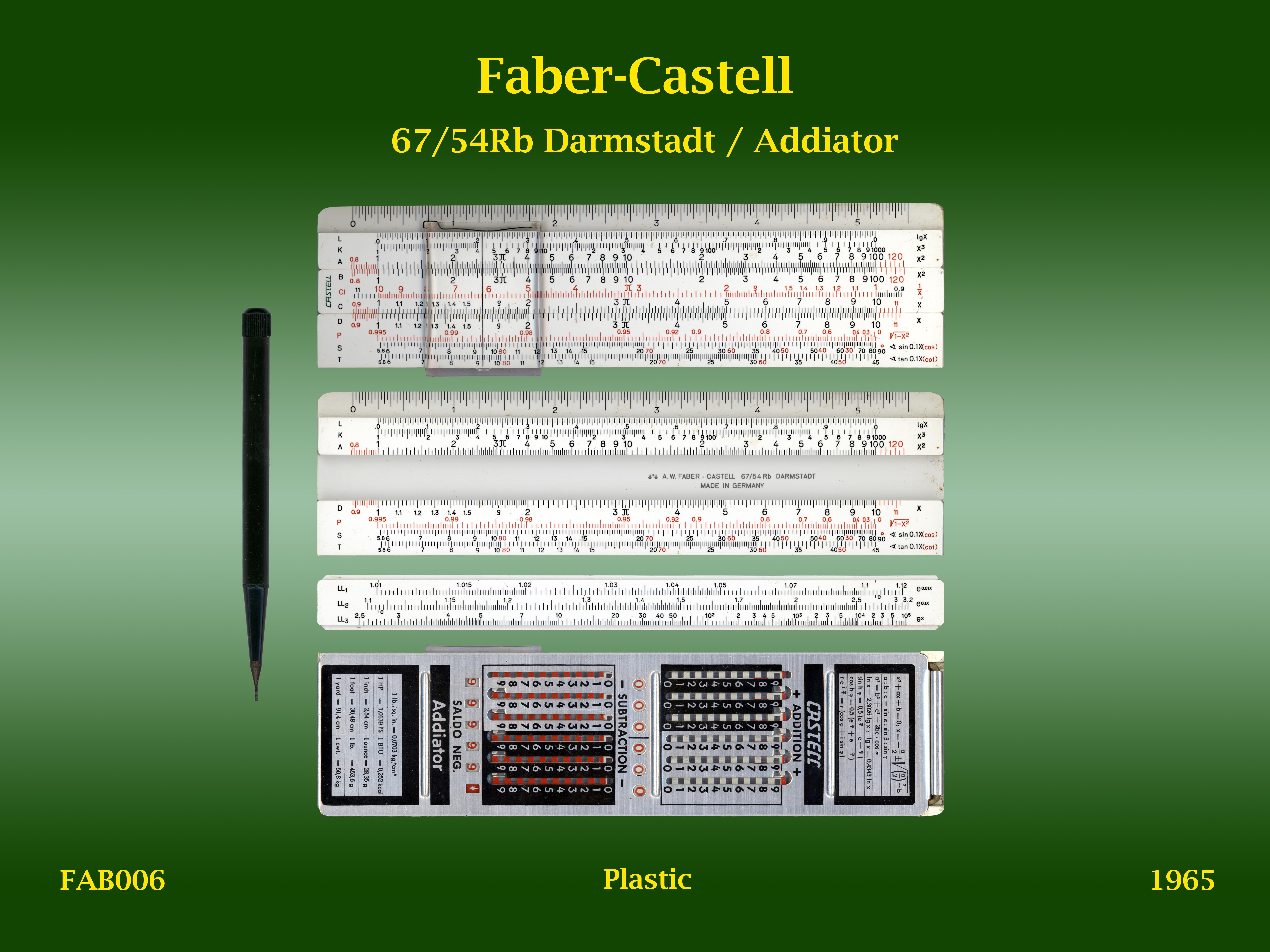 | FAB006 | Linear | 67/54Rb | Darmstadt/Addiator | Faber-Castell | Germany | Plastic | 12.5 cm | 1965 | C3 |