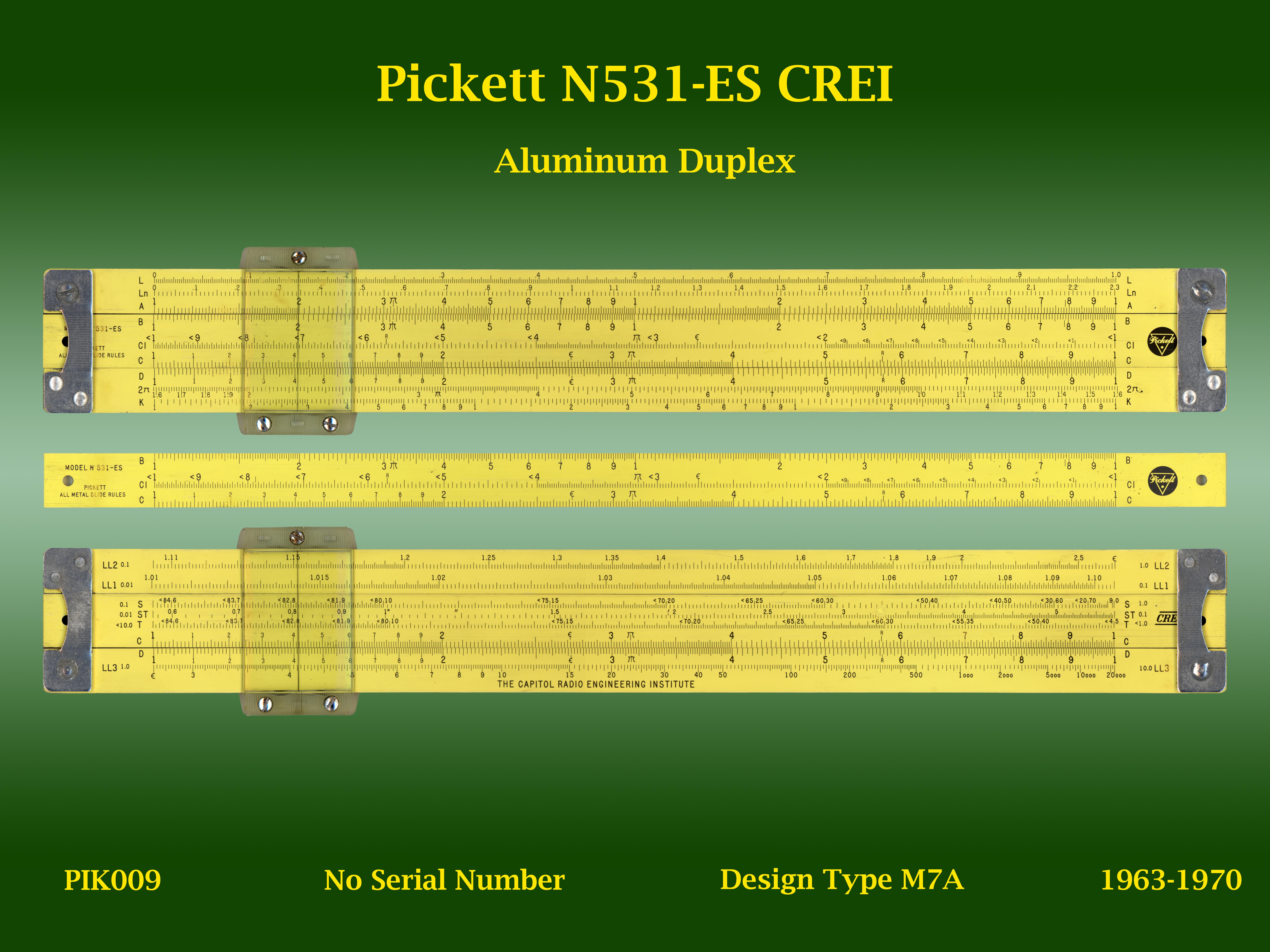 Special slide rule made for Capitol Radio Engineering Institute (CREI). Scales optimized for making radio engineering calculations.