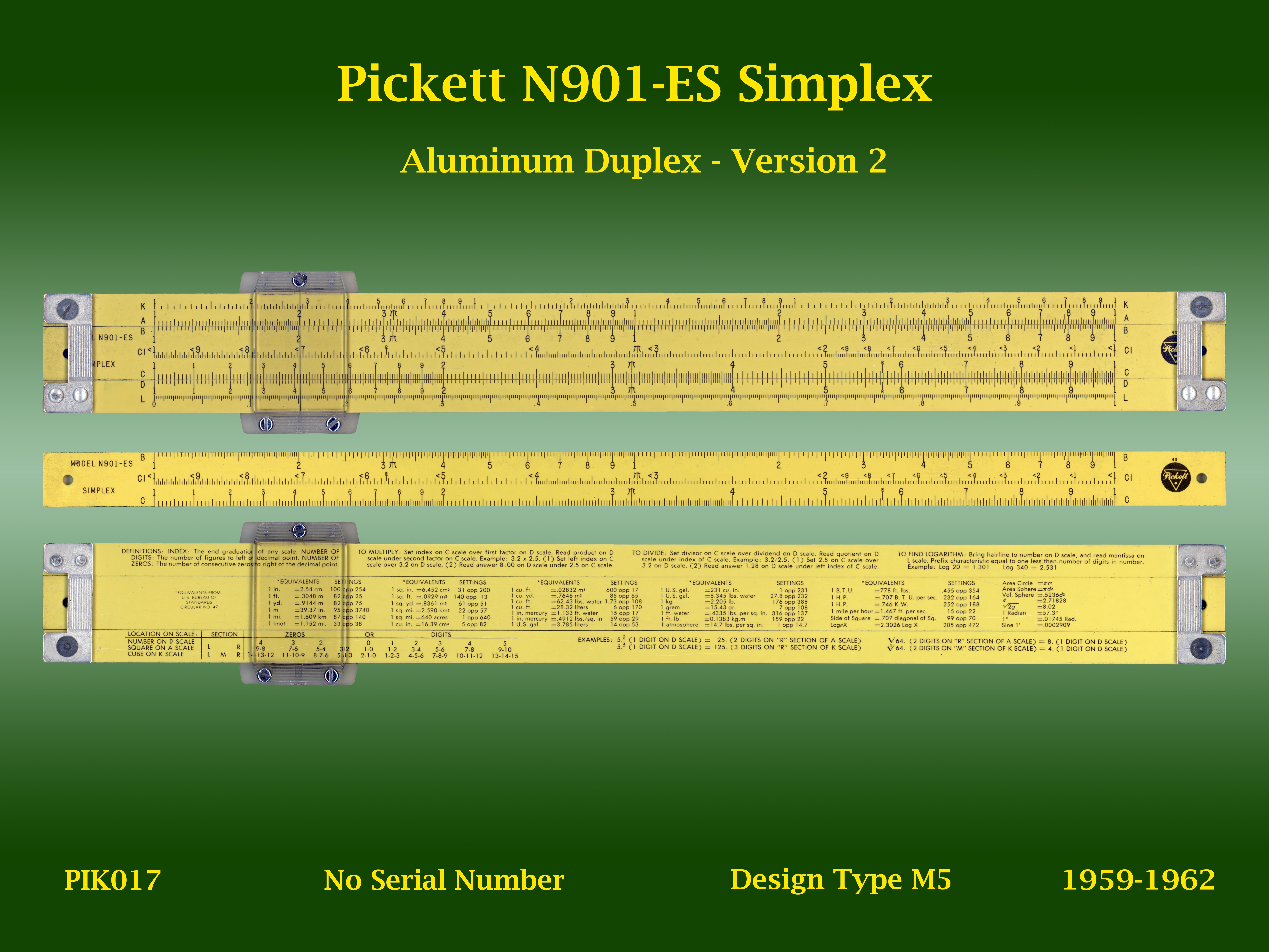 | PIK017 | Linear | N901-ES | Simplex | 2 | M5 | Pickett | USA | | Aluminum | "10" | 1959-1962 | C5 |