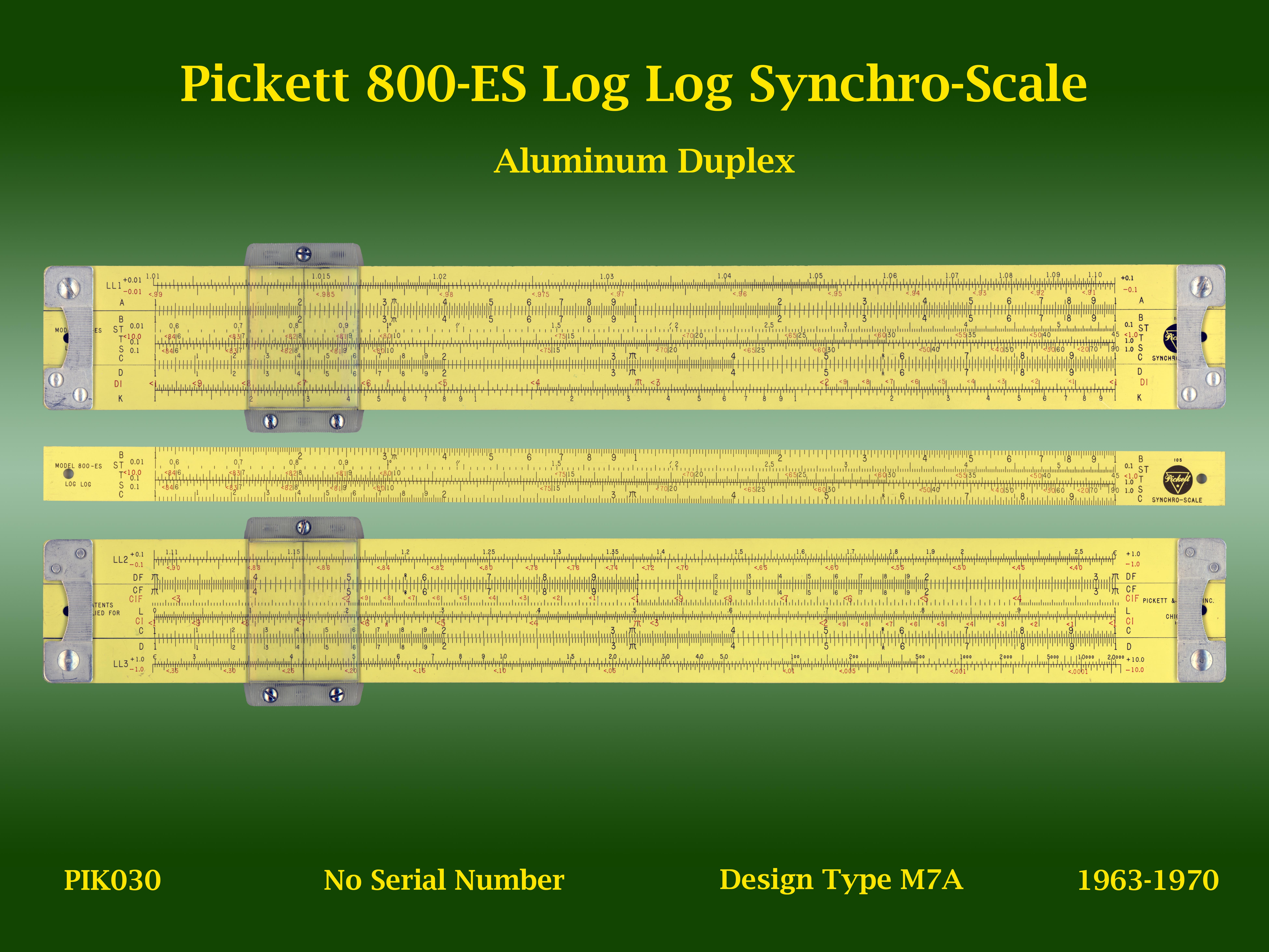 | PIK030 | Linear | 800-ES | Log Log Synchro-Scale | | M7A | Pickett | USA | | Aluminum | "10" | 1963-1970 | C3 |