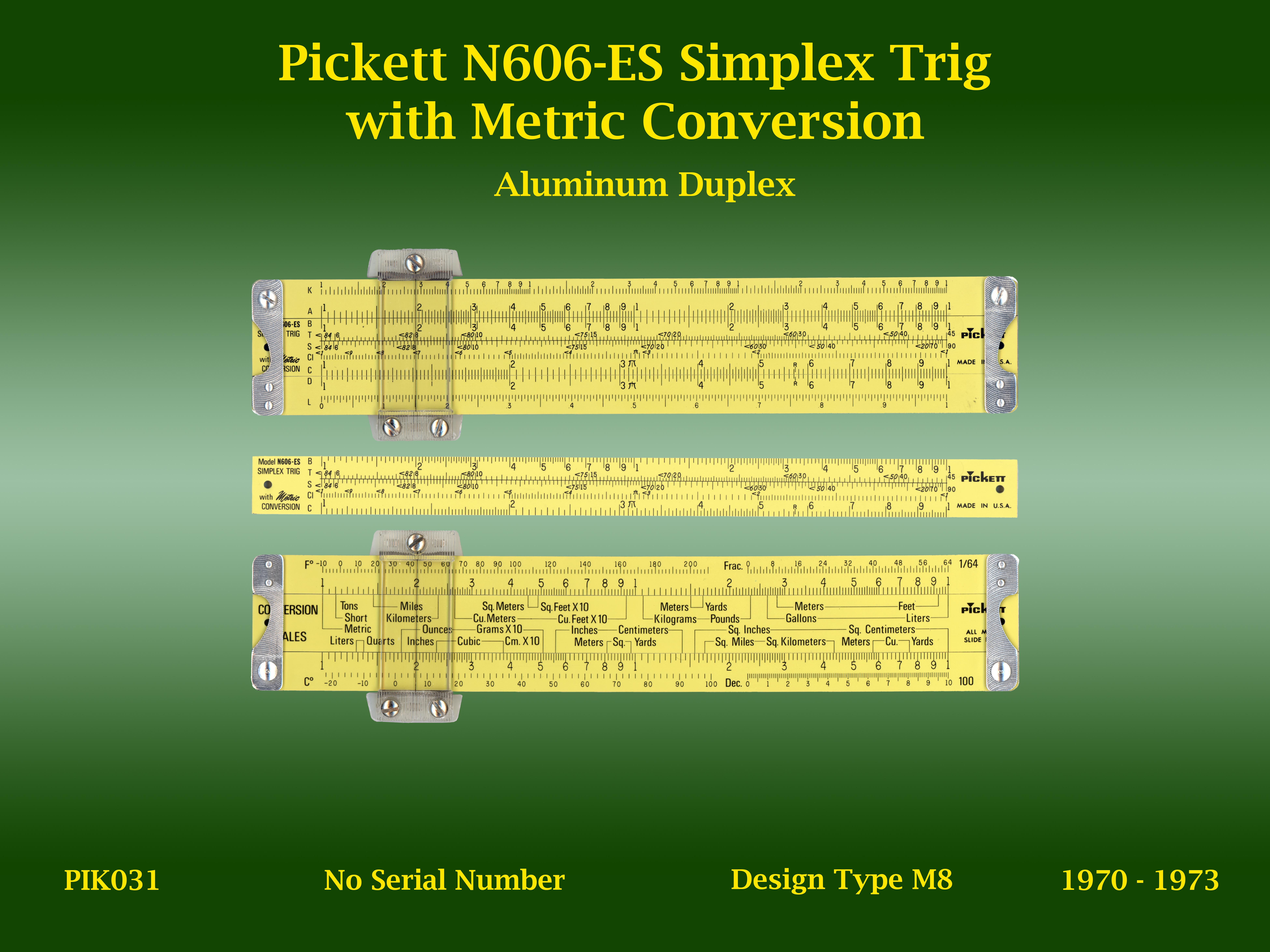 Basic math slide rule with trig scales and metric conversion scales on reverse.