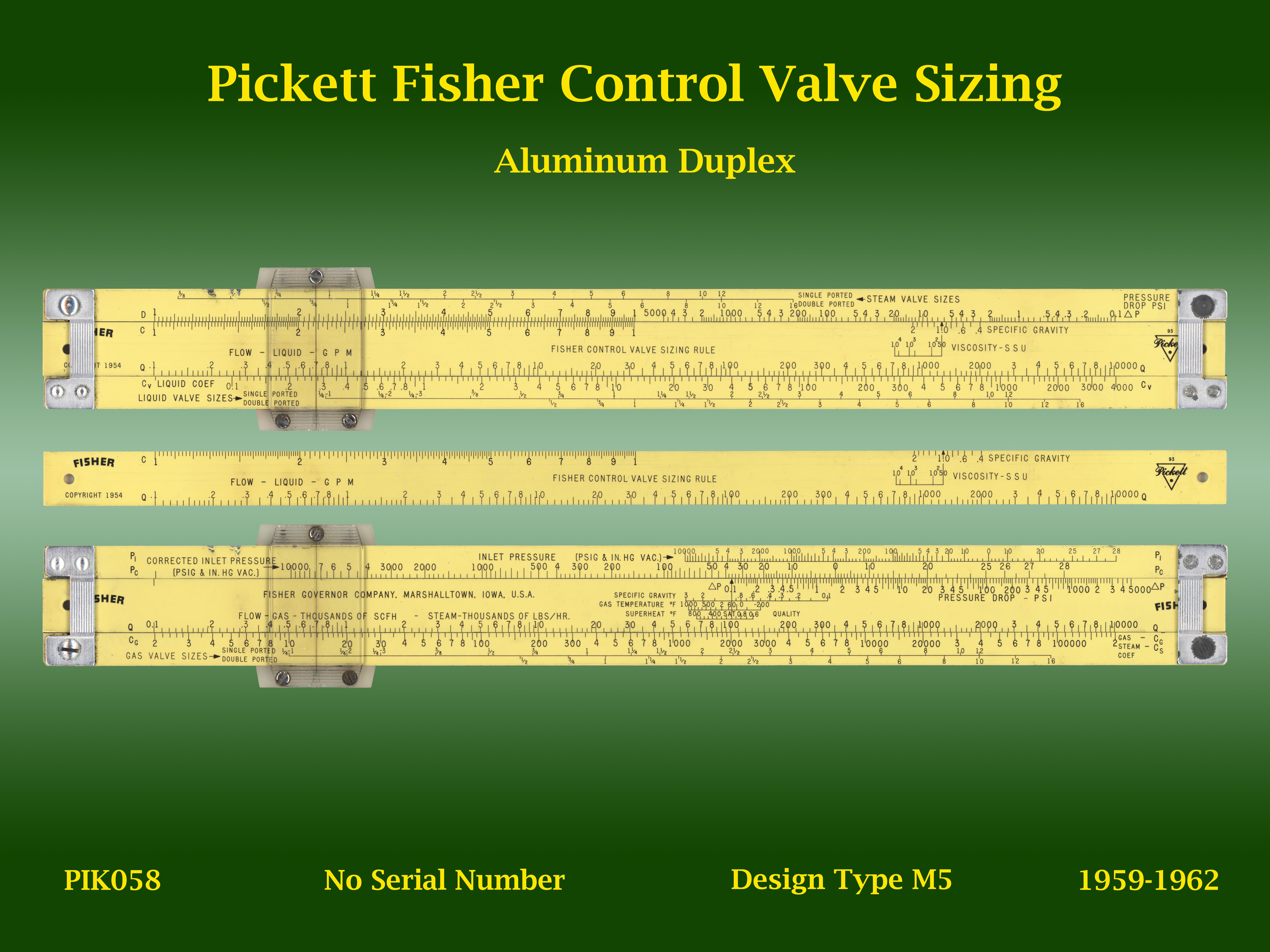 | PIK058 | Linear | Fisher | Control Valve Sizing | | M5 | Pickett | USA | | Aluminum | "10" | 1959-1962 | C5 |