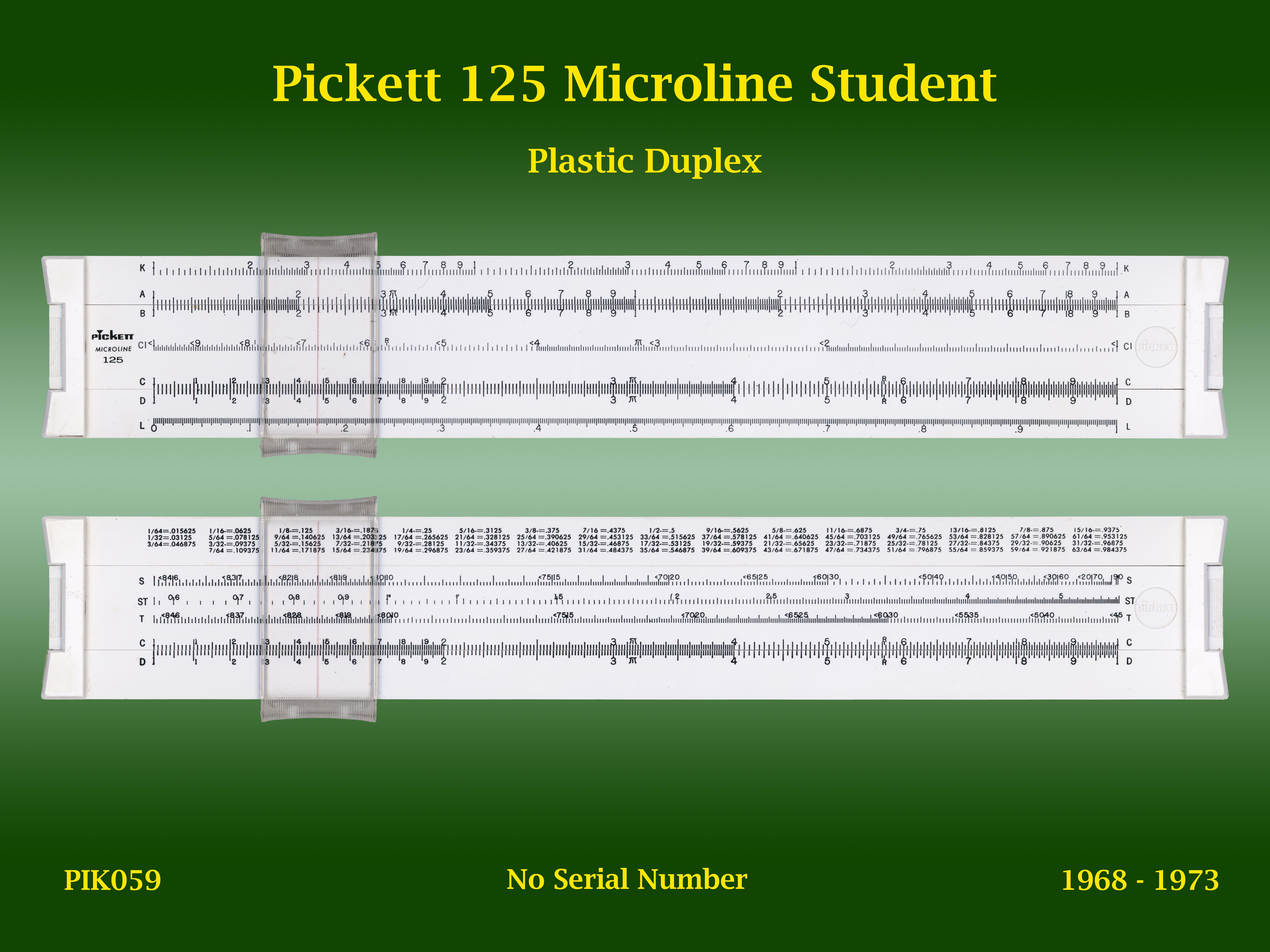 | PIK059 | Linear | 125-T | Microline Student | | n/a | Pickett | USA | | Plastic | "10" | 1968-1973 | C4 |
