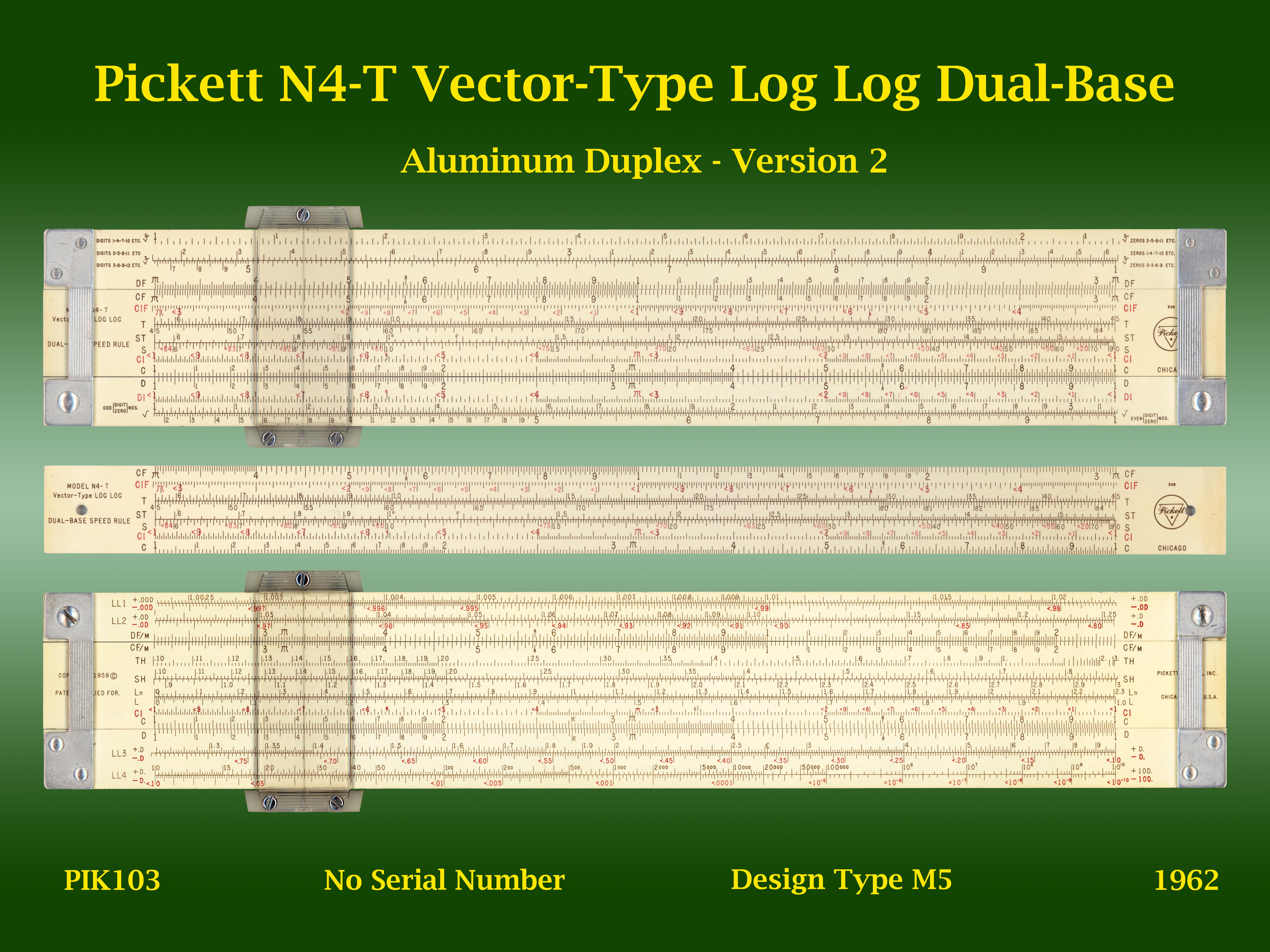 "Log log hyperbolic slide rule with 35 scales. Same as model 4-T, but with Ln scale added and reverse scales in red. Model name changed."