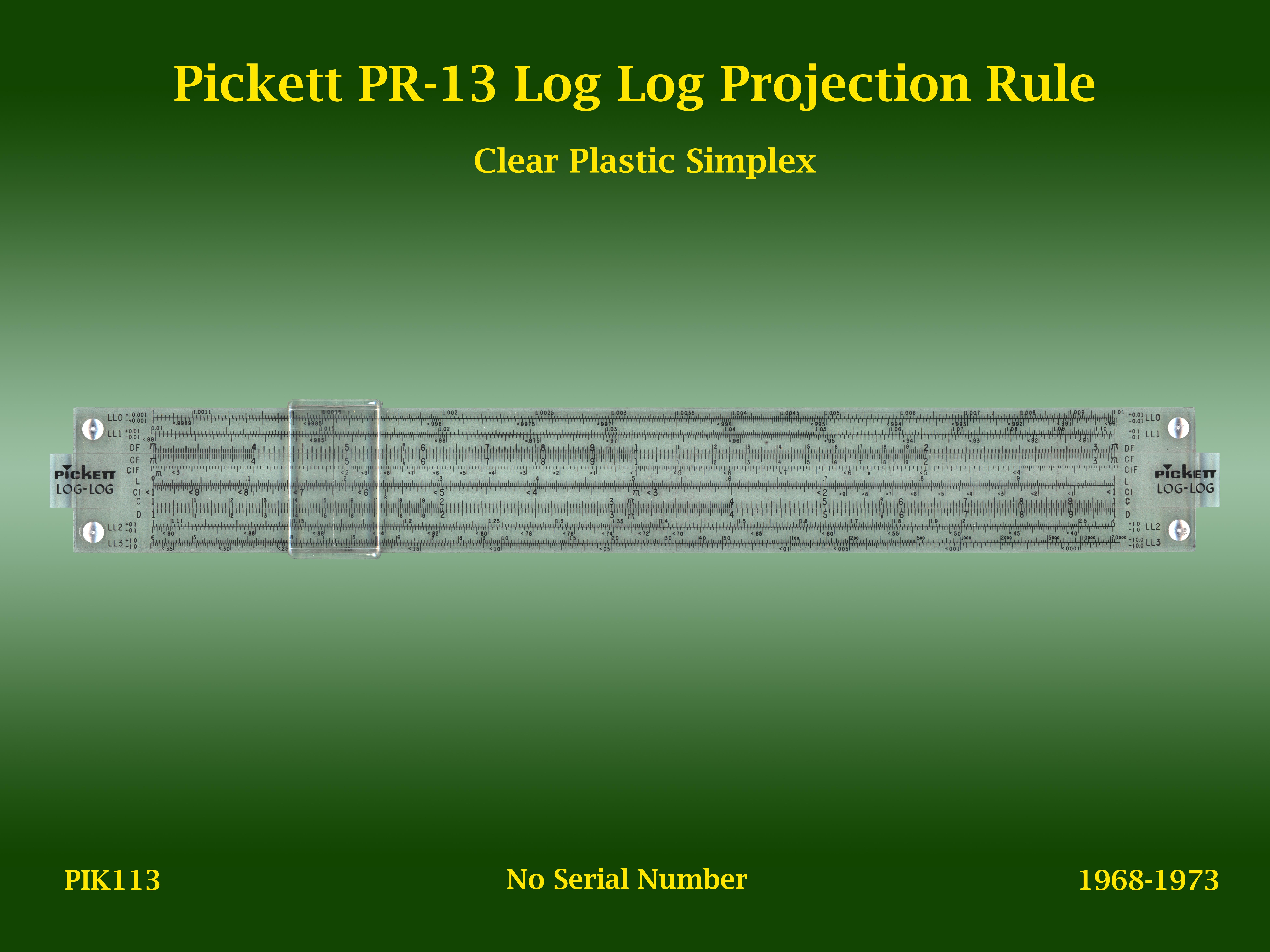 | PIK113 | Linear | PR-13 | Log Log Projection Rule | | n/a | Pickett | USA | | Plastic | "10" | 1968-1973 | C4 |