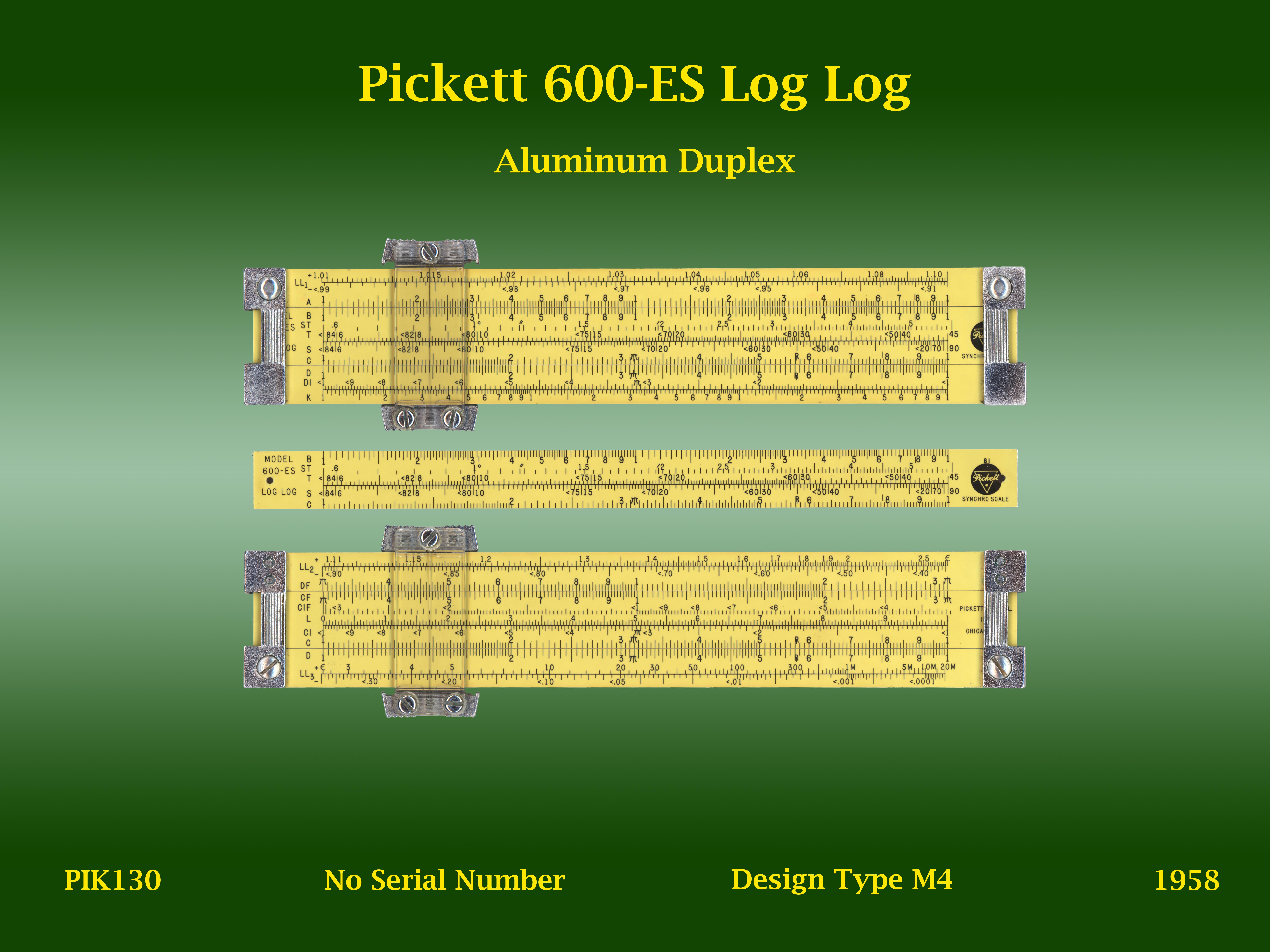 | PIK130 | Linear | 600-ES | Log Log | | M4 | Pickett | USA | | Aluminum | "5" | 1958 | C4 |