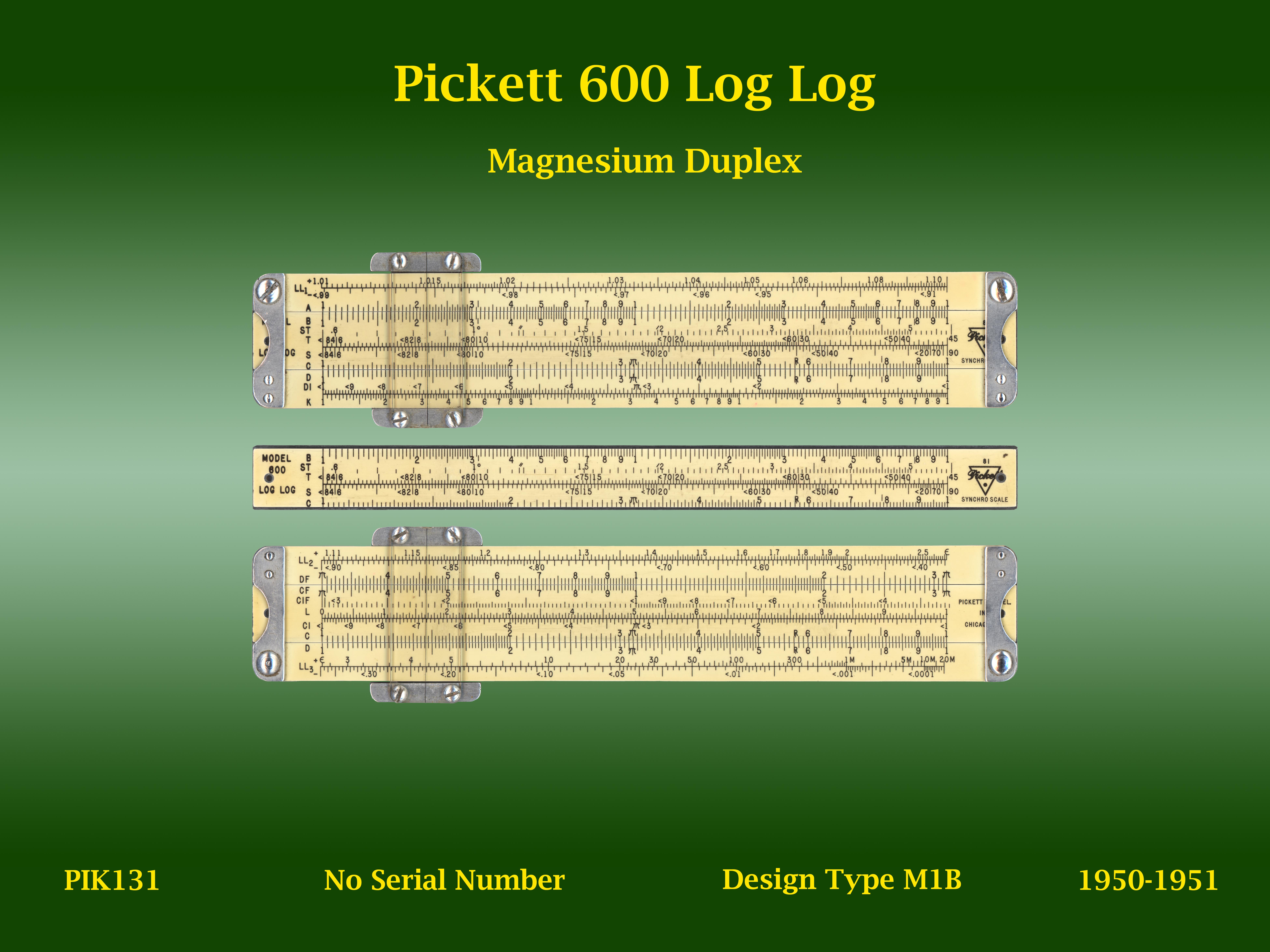 | PIK131 | Linear | 600 | Log Log | | M1B | Pickett | USA | | Magnesium | "5" | 1950-1951 | C5 |