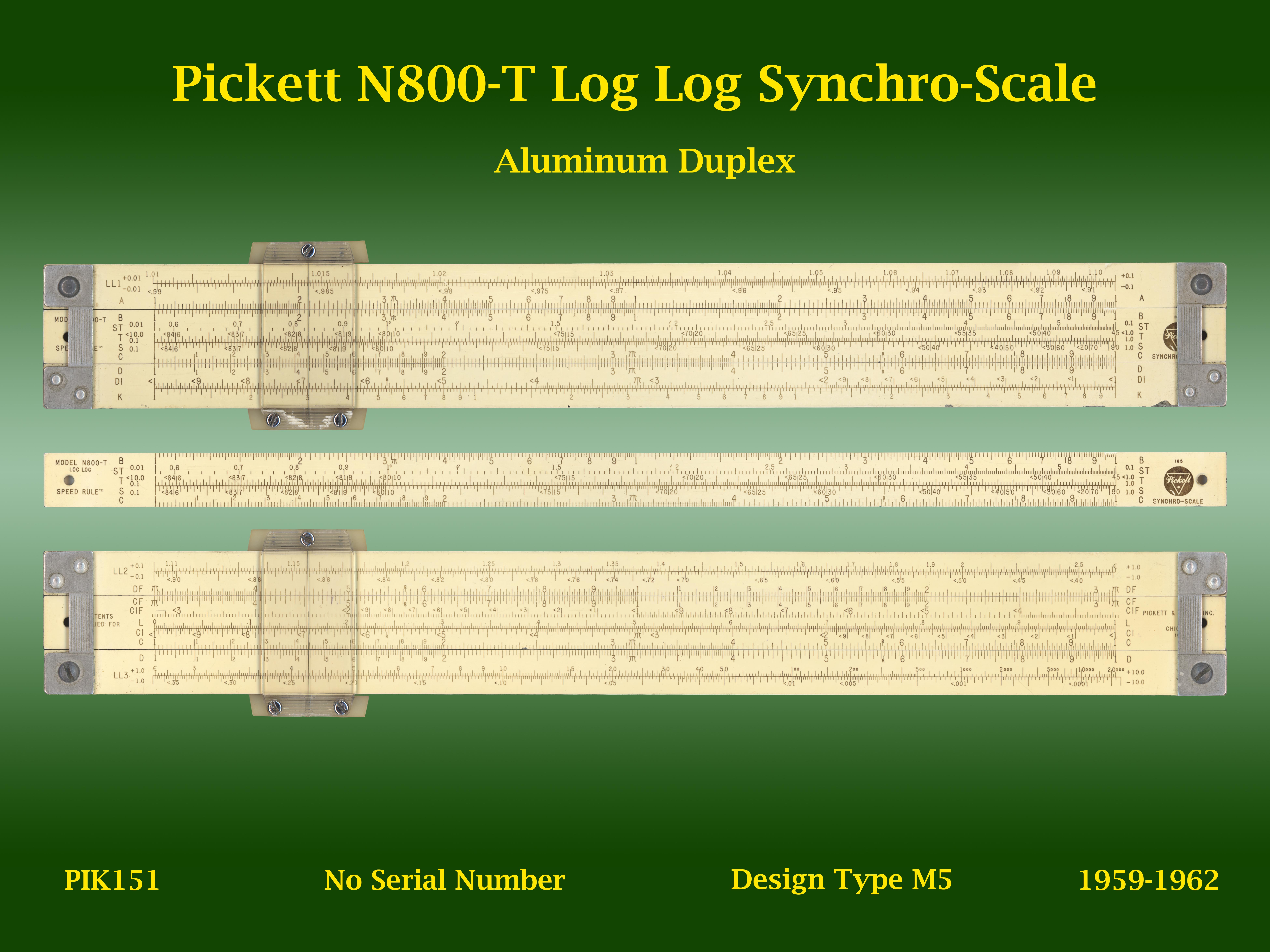 | PIK151 | Linear | N800-T | Log Log Synchro-Scale | | M5 | Pickett | USA | | Aluminum | "10" | 1959-1962 | C5 |