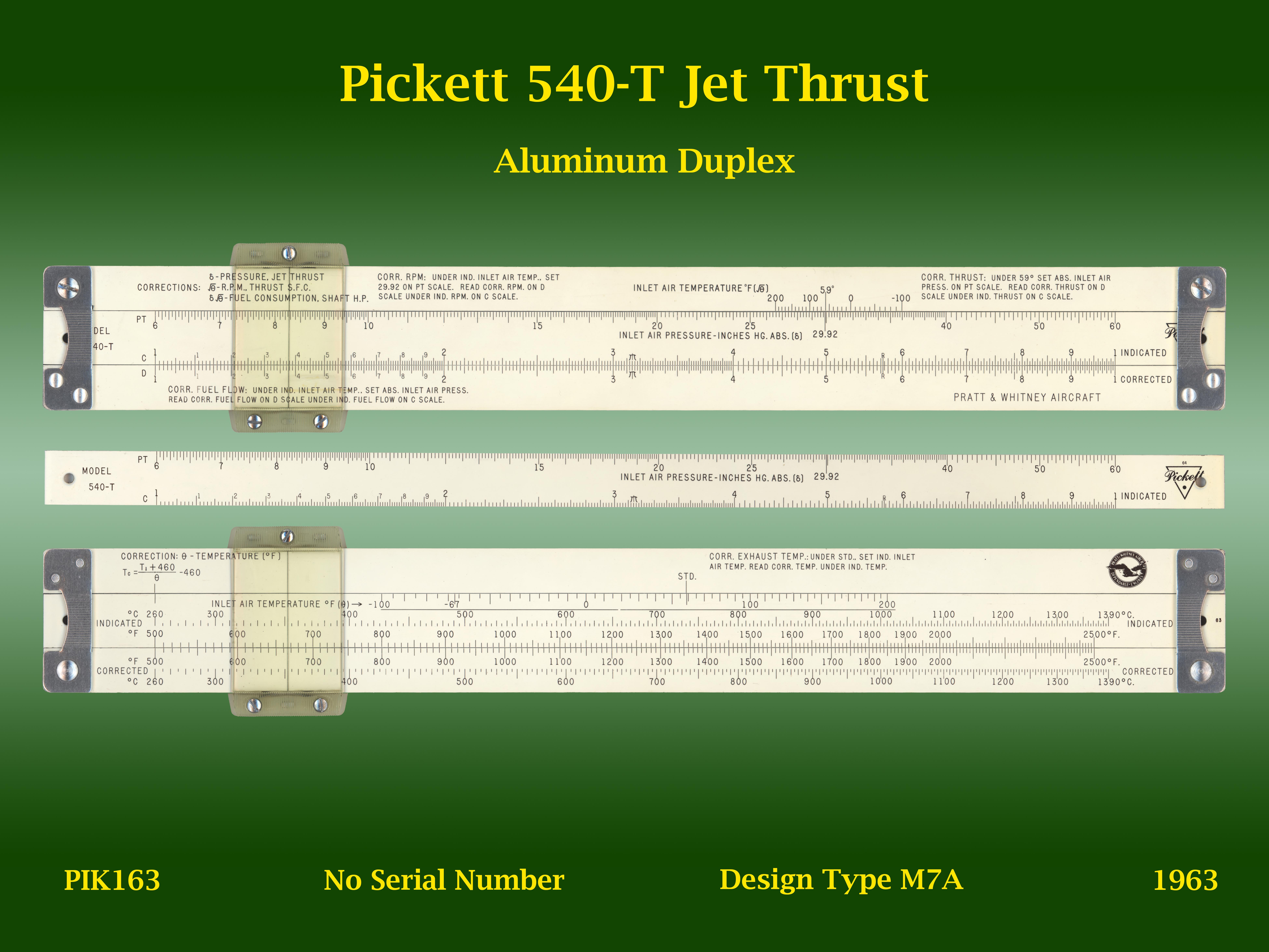 Notes: Special slide rule made for Pratt & Whitney Aircraft. Used to calculate thrust and fuel flow parameters for jet aircraft.