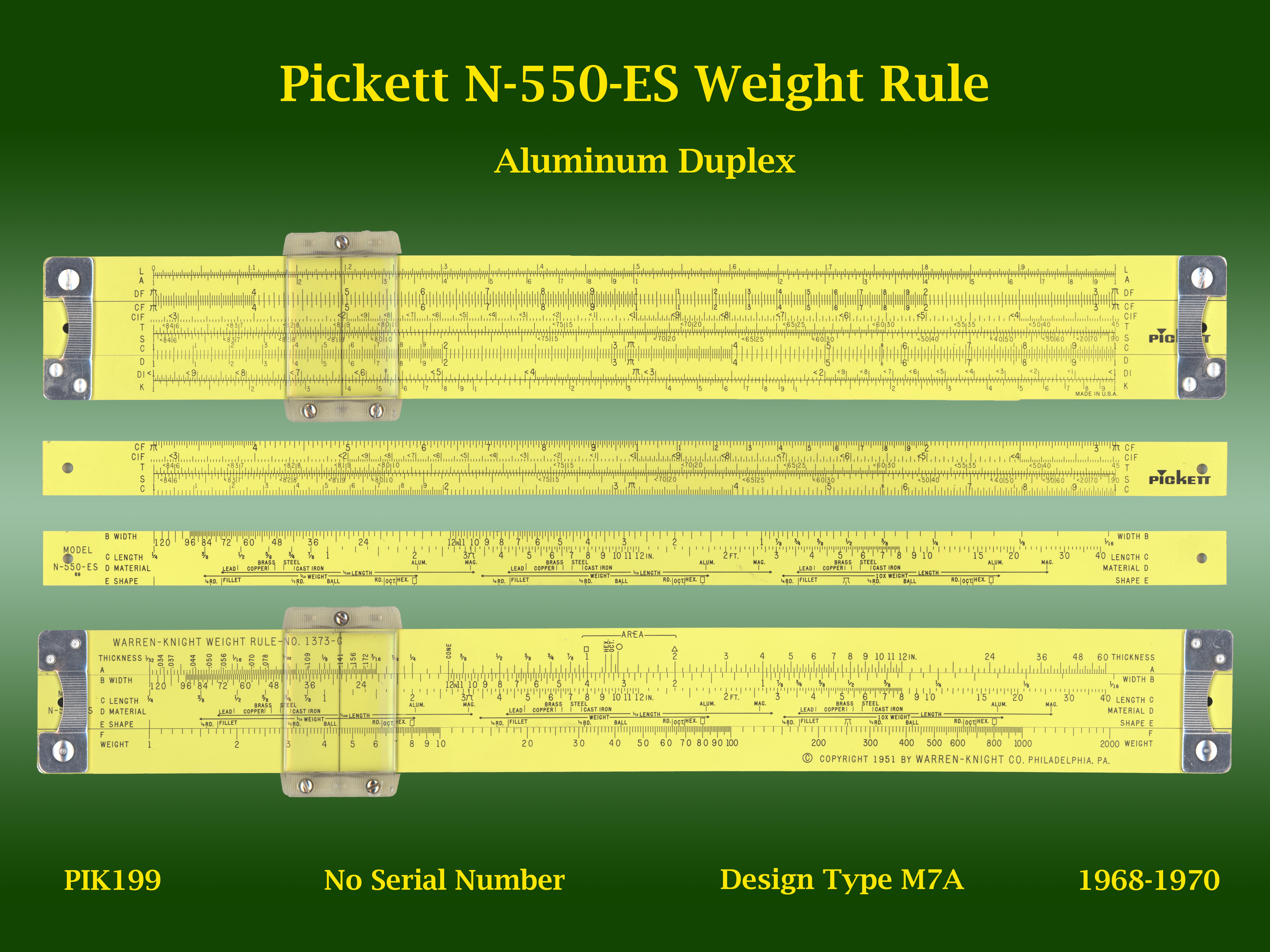| PIK199 | Linear | N-550-ES | Weight Rule | | M7A | Pickett | USA | | Aluminum | "10" | 1968-1970 | C0 |