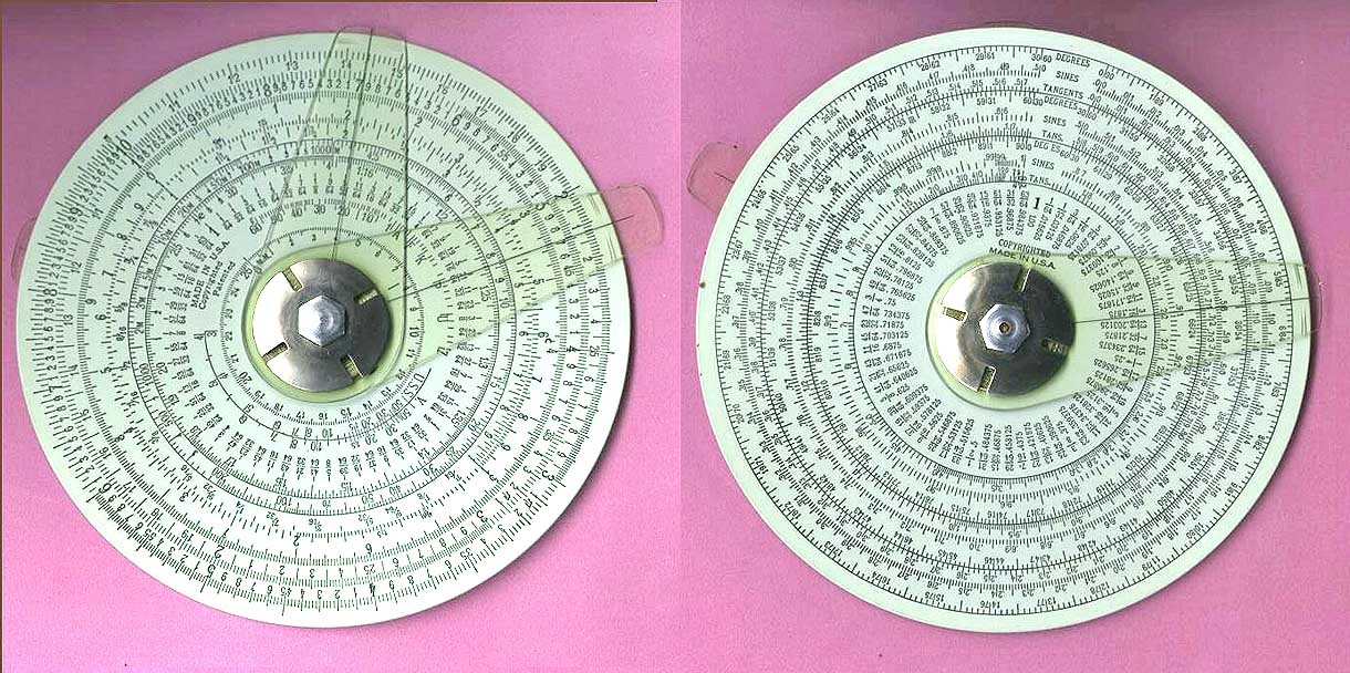 Gilson MidgetUSA, 1915-1960s, circular, early versions 3 3/8 inch diameter, paper scaleson plywood, metal cursors; later versions 4 to 4¼ inch diameter, celluloid on aluminum core, plastic cu rsors